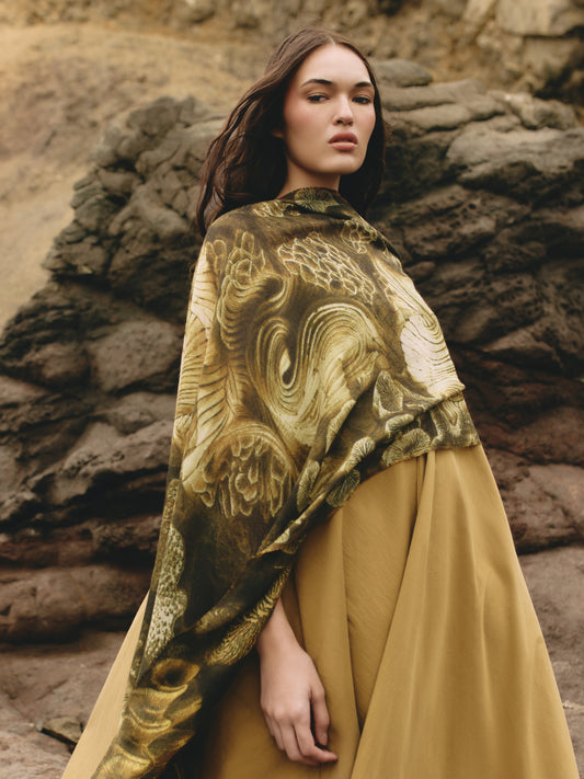 Estola Zankov en tonalidad verde, confeccionada en baby alpaca y seda. Presenta un diseño jaspeado...
