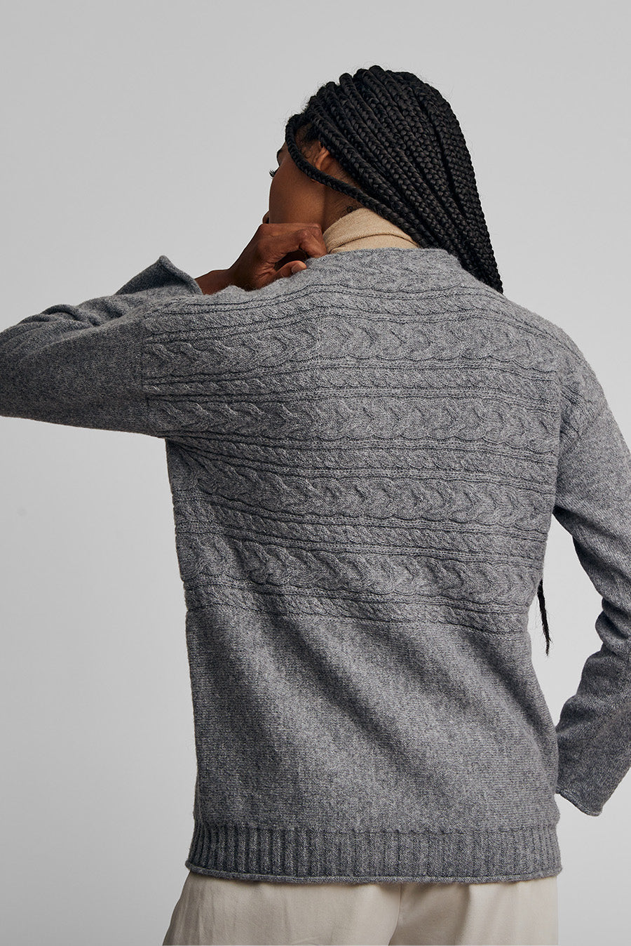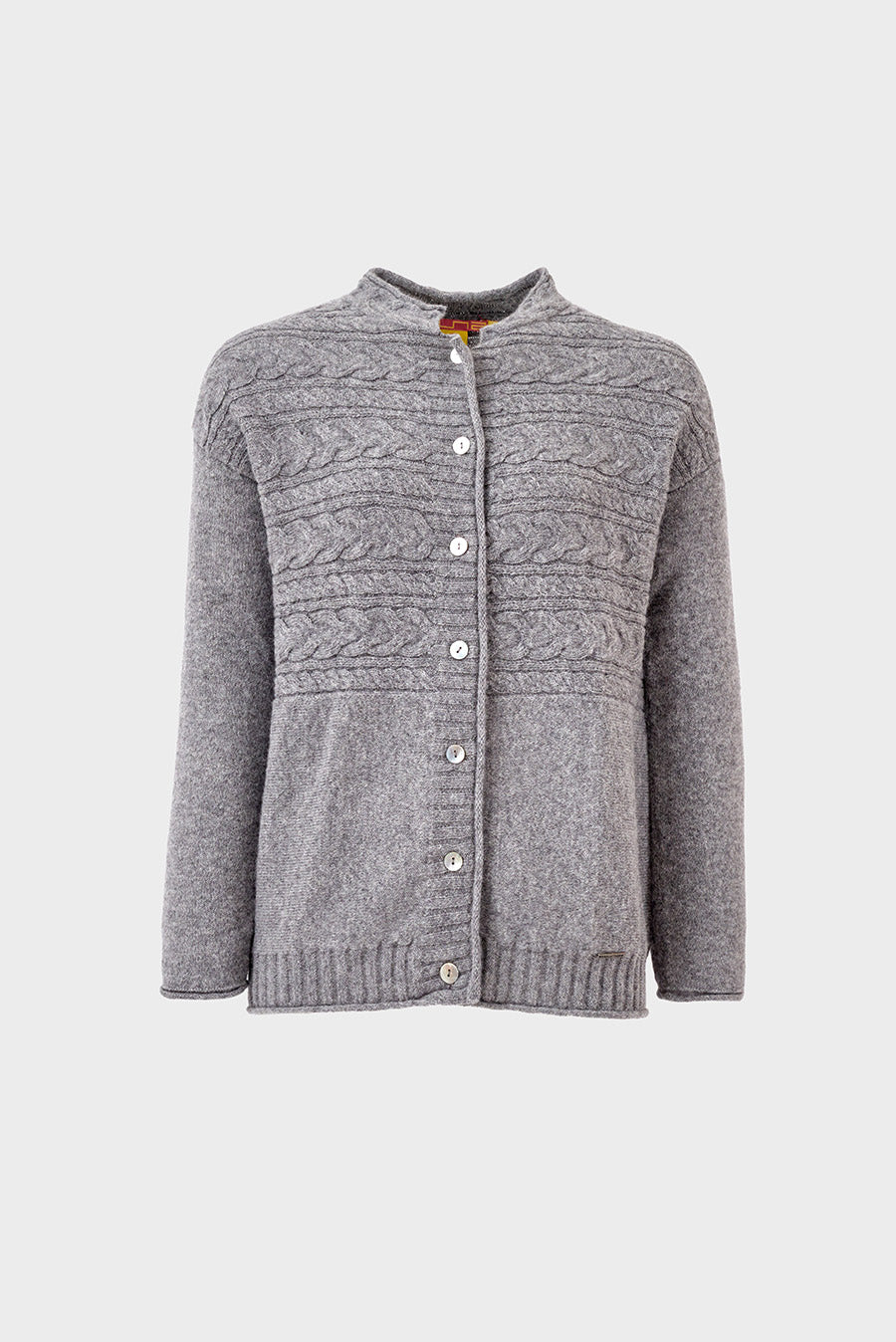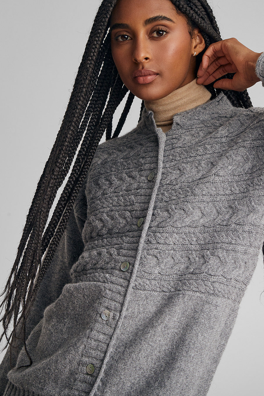 Animamos el estilo de este cálido cárdigan de baby alpaca aplicándole un diseño de mix de trenzas, sisas rectas, mangas en Jersey y con botones. | Material predominante: Baby Alpaca