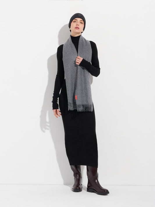 Chalina Adrian en tonalidad gris, de diseño de color entero con bordes terminados en flecos...