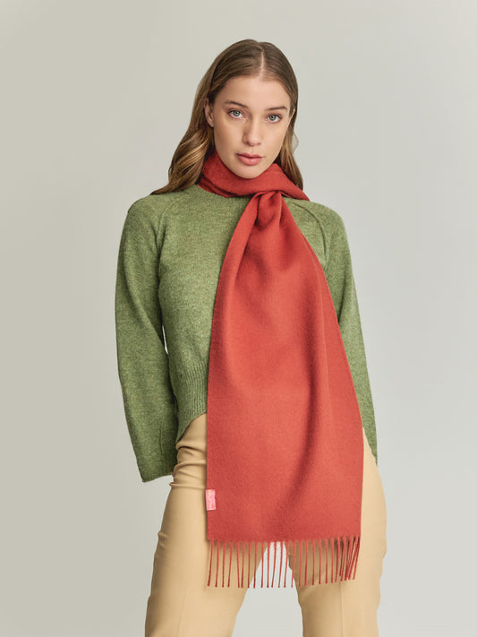 Chalina Adrian en tonalidad naranja, de diseño de color entero con bordes terminados en flecos...