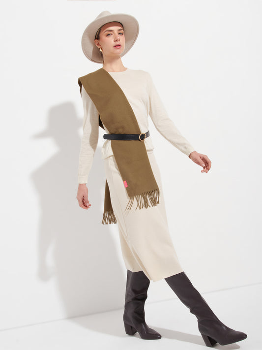 Chalina Adrian en tonalidad beige, de diseño de color entero con bordes terminados en flecos...