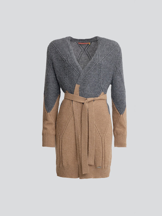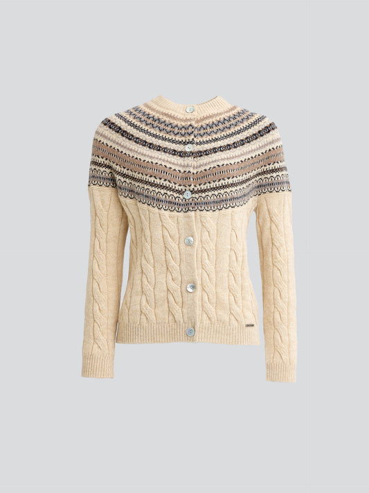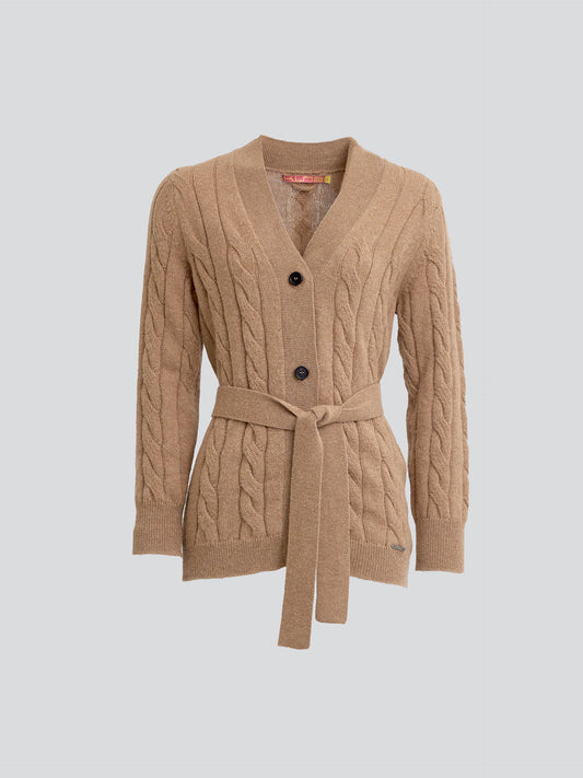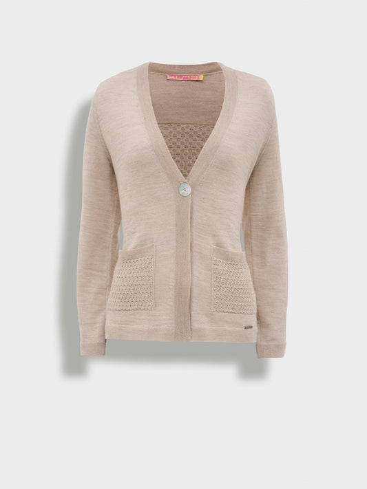 Cardigan Zanzibar en tonalidad beige, confeccionado en baby alpaca y seda. Presenta cuello en “V”...