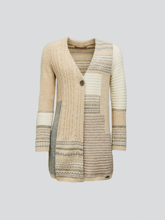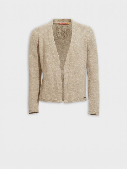 Cardigan Zoraya en tonalidad beige, de diseño abierto, sin botones ni cierres. Presenta escote en...