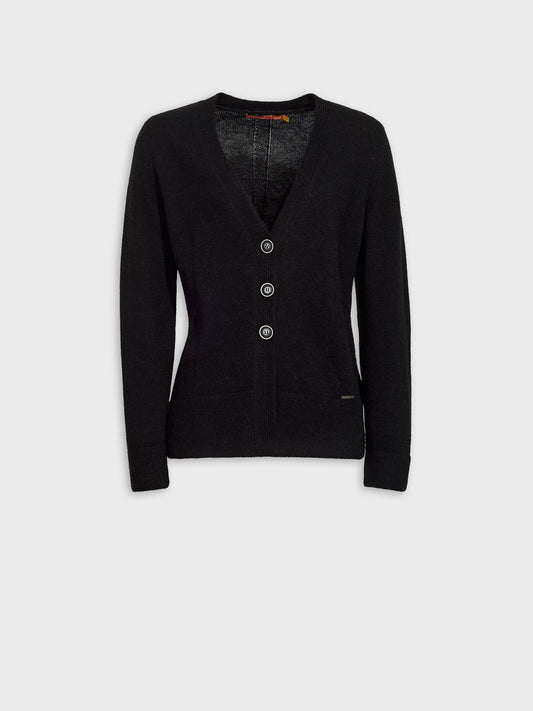 Cárdigan Zia en tonalidad negro, de corte clásico con botones, escote en "V". Confeccionado en...