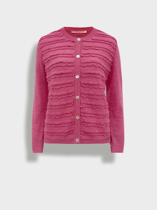 Cardigan Zarina en tonalidad fucsia, confeccionado en baby alpaca y seda. Presenta cuello redondo con...