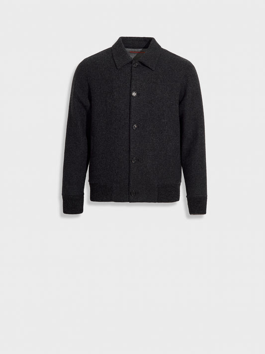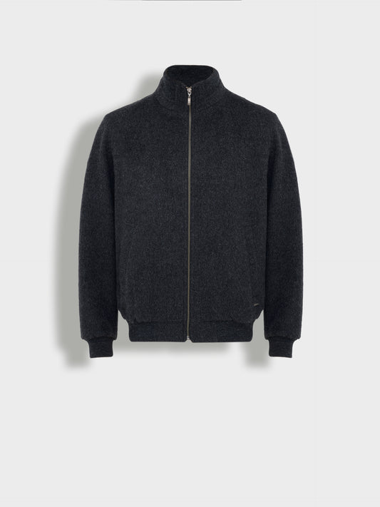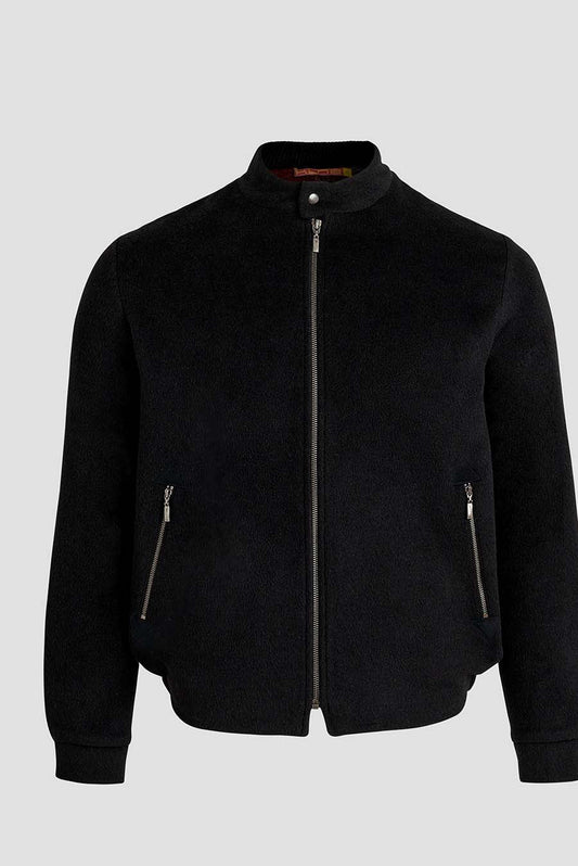 La icónica chaqueta bomber, confeccionada en tela de alpaca negra 100% natural, destaca por su...