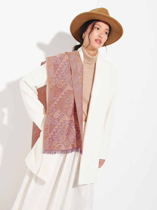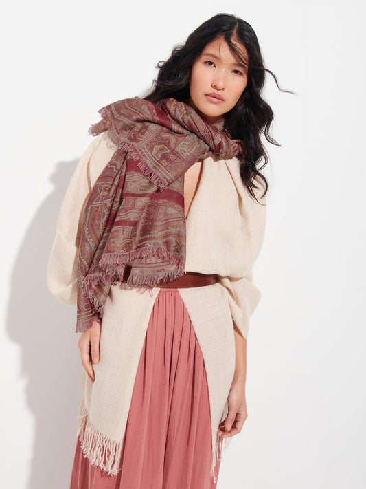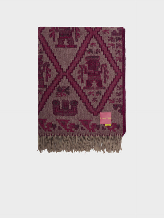 Manta Mochica 2 en tonalidad guinda, elaborada en 100% baby alpaca con técnica Jacquard en...