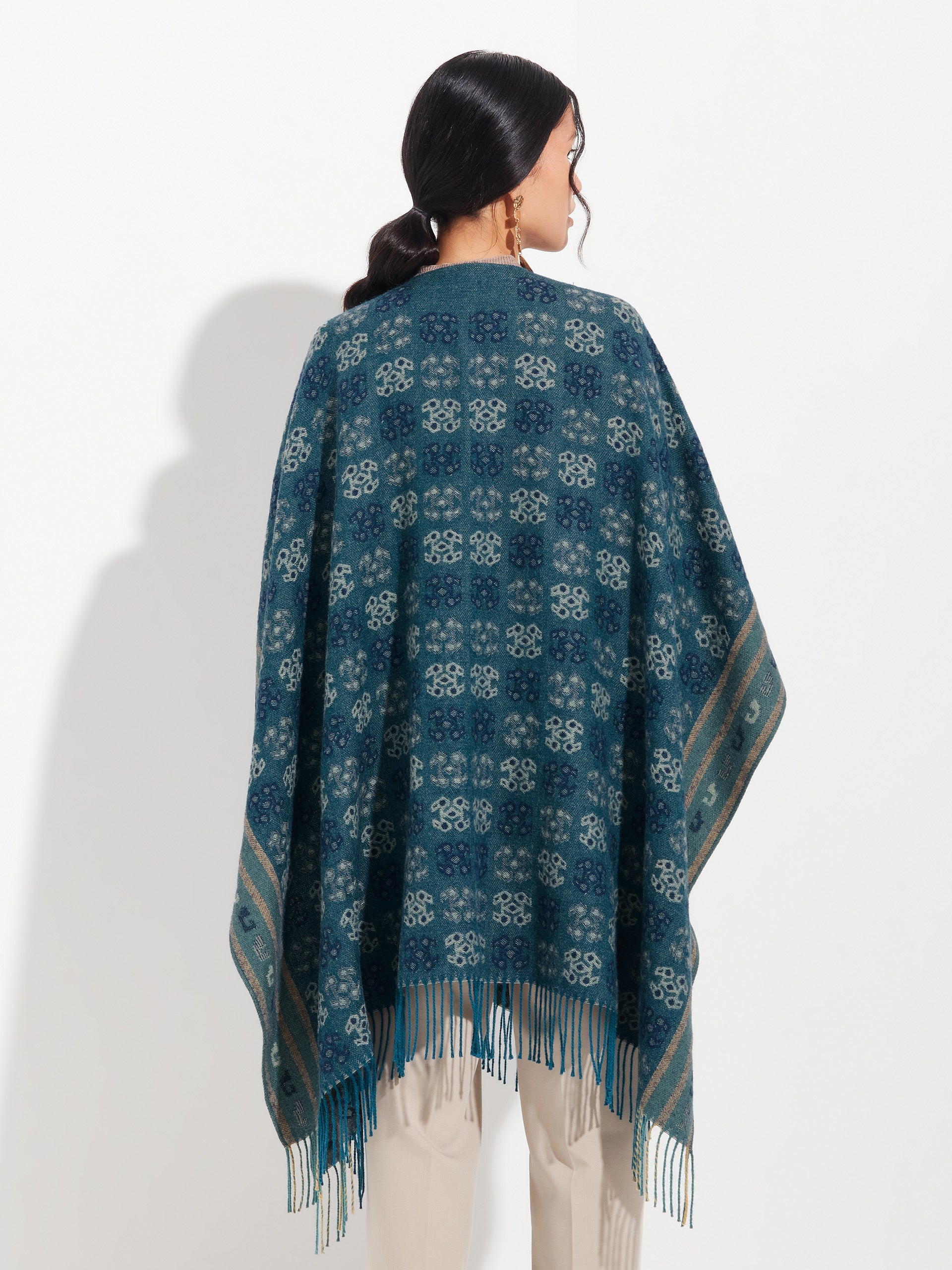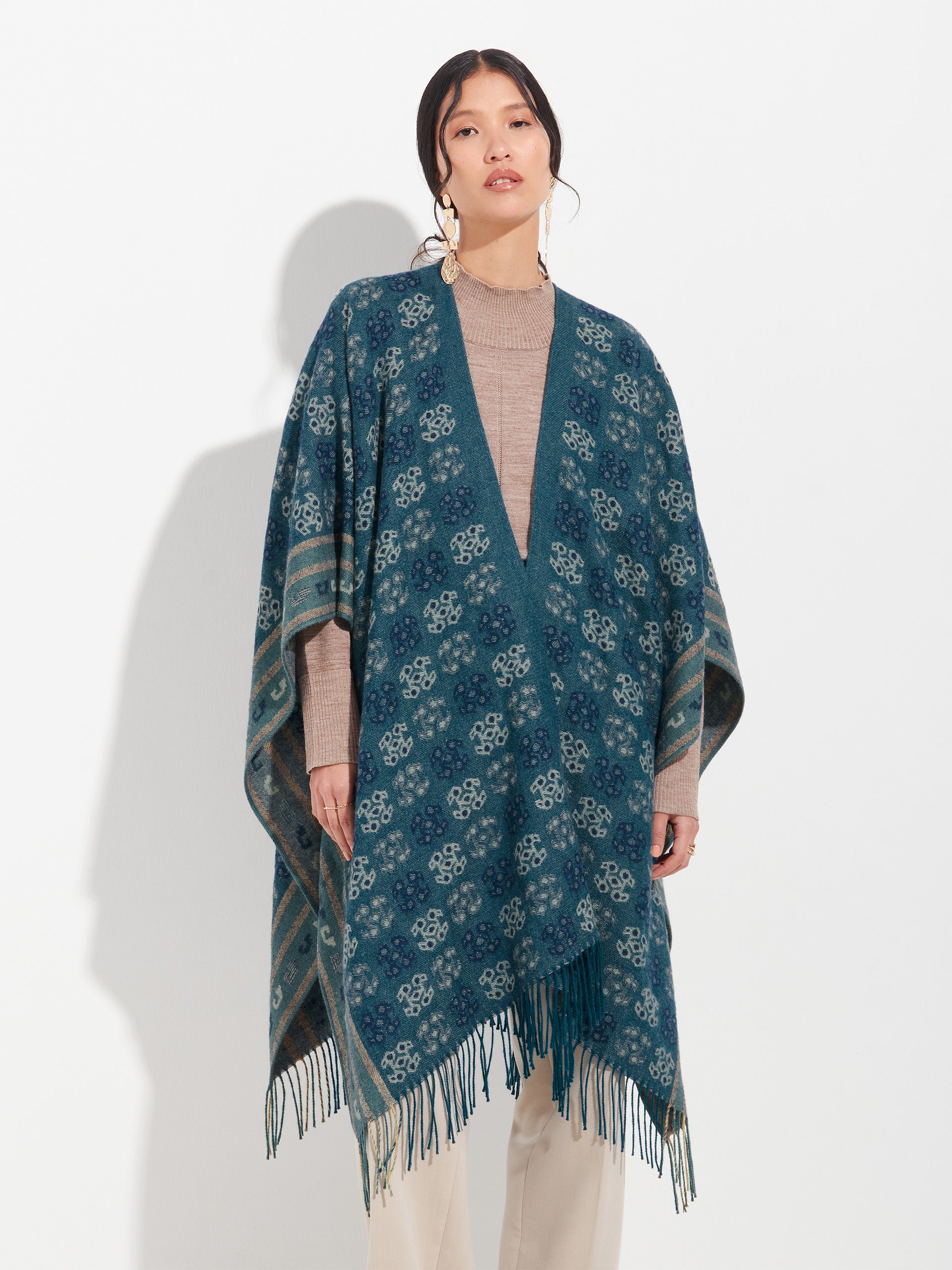 Poncho Chancay 35 en tonalidad azul, elaborado en 100% baby alpaca con técnica Jacquard en doble cara. Es una prenda reversible, inspirada en la Cultura Chancay, que mantiene viva la tradición ancestral en un diseño representativo de la identidad cultural. | Material predominante: Baby Alpaca