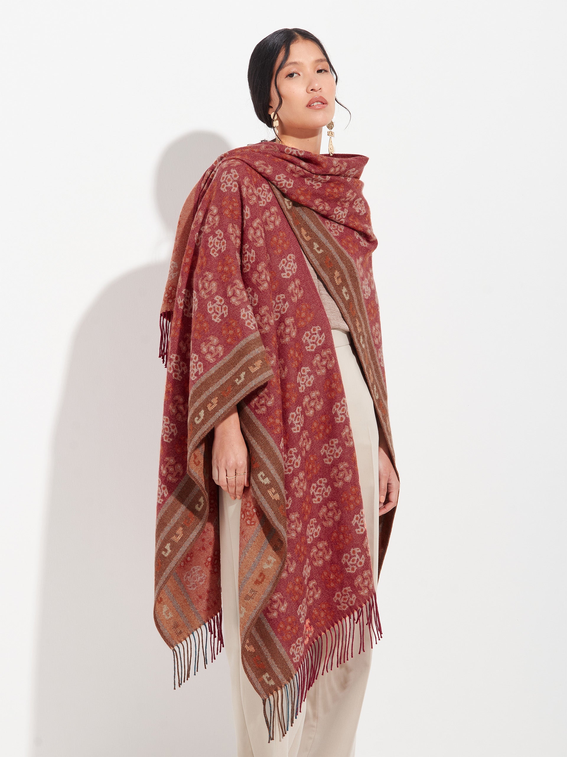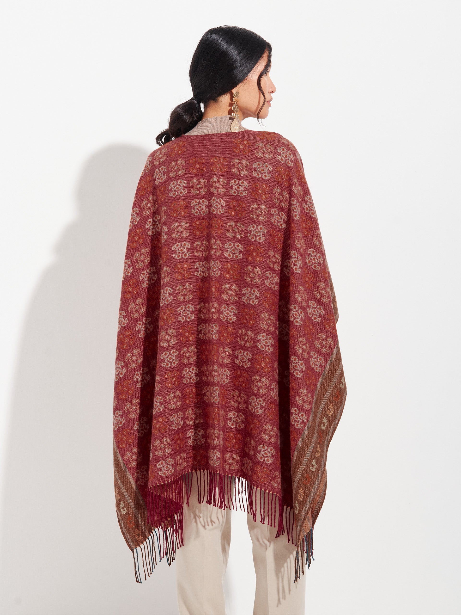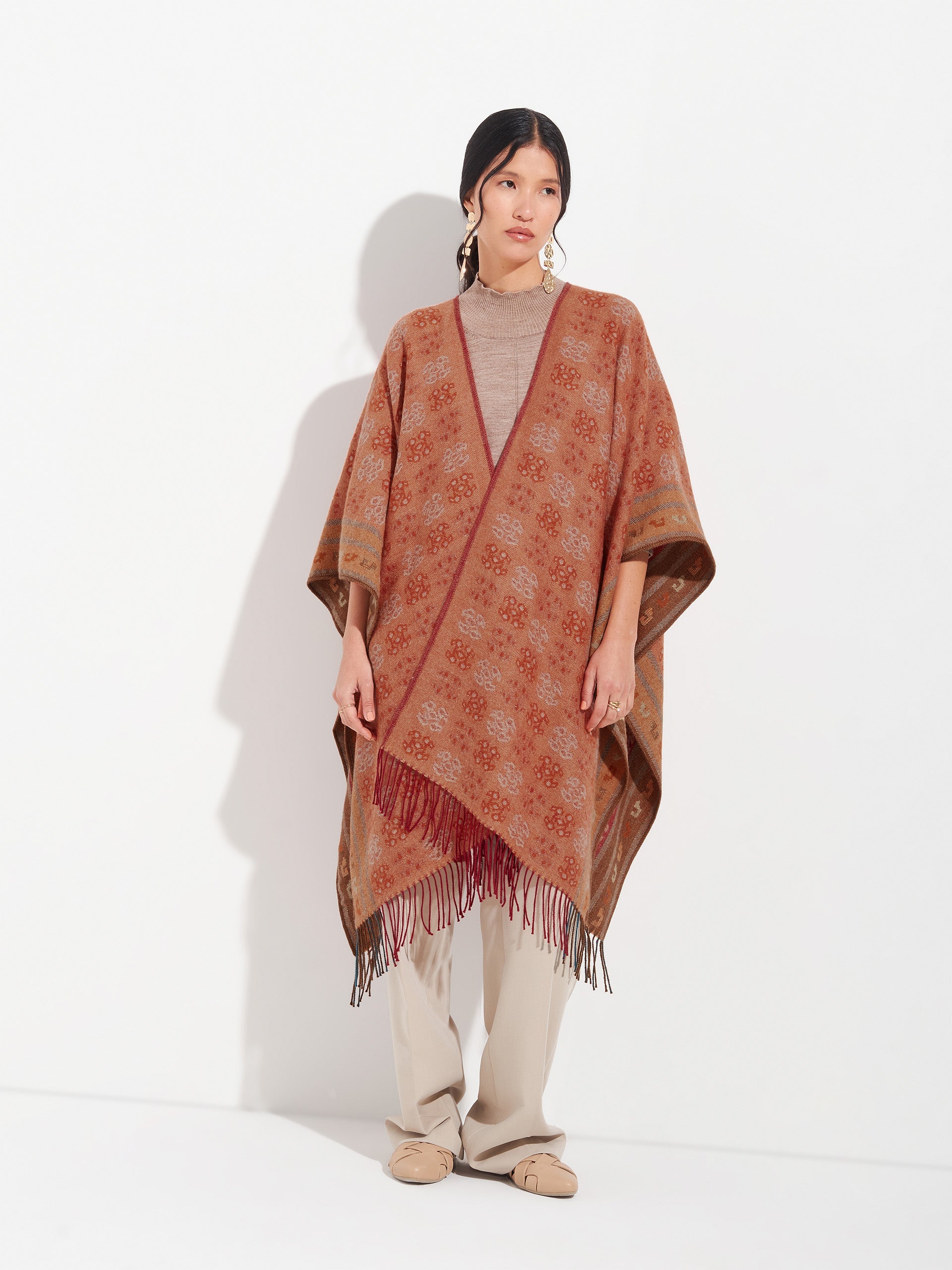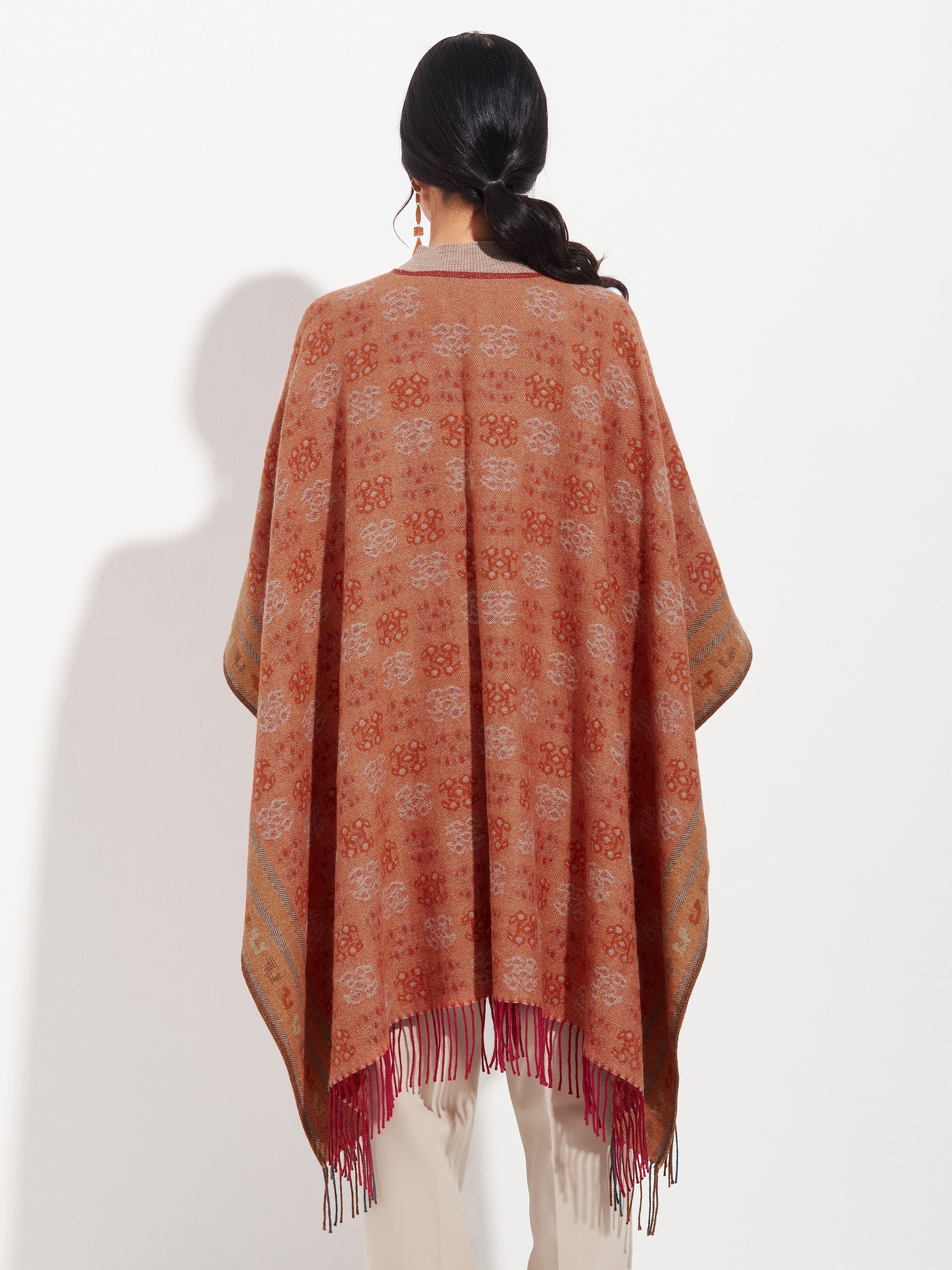 Poncho Chancay 35 en tonalidad naranja, elaborado en 100% baby alpaca con técnica Jacquard en doble cara. Es una prenda reversible, inspirada en la Cultura Chancay, que mantiene viva la tradición ancestral en un diseño representativo de la identidad cultural. | Material predominante: Baby Alpaca
