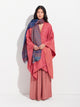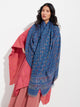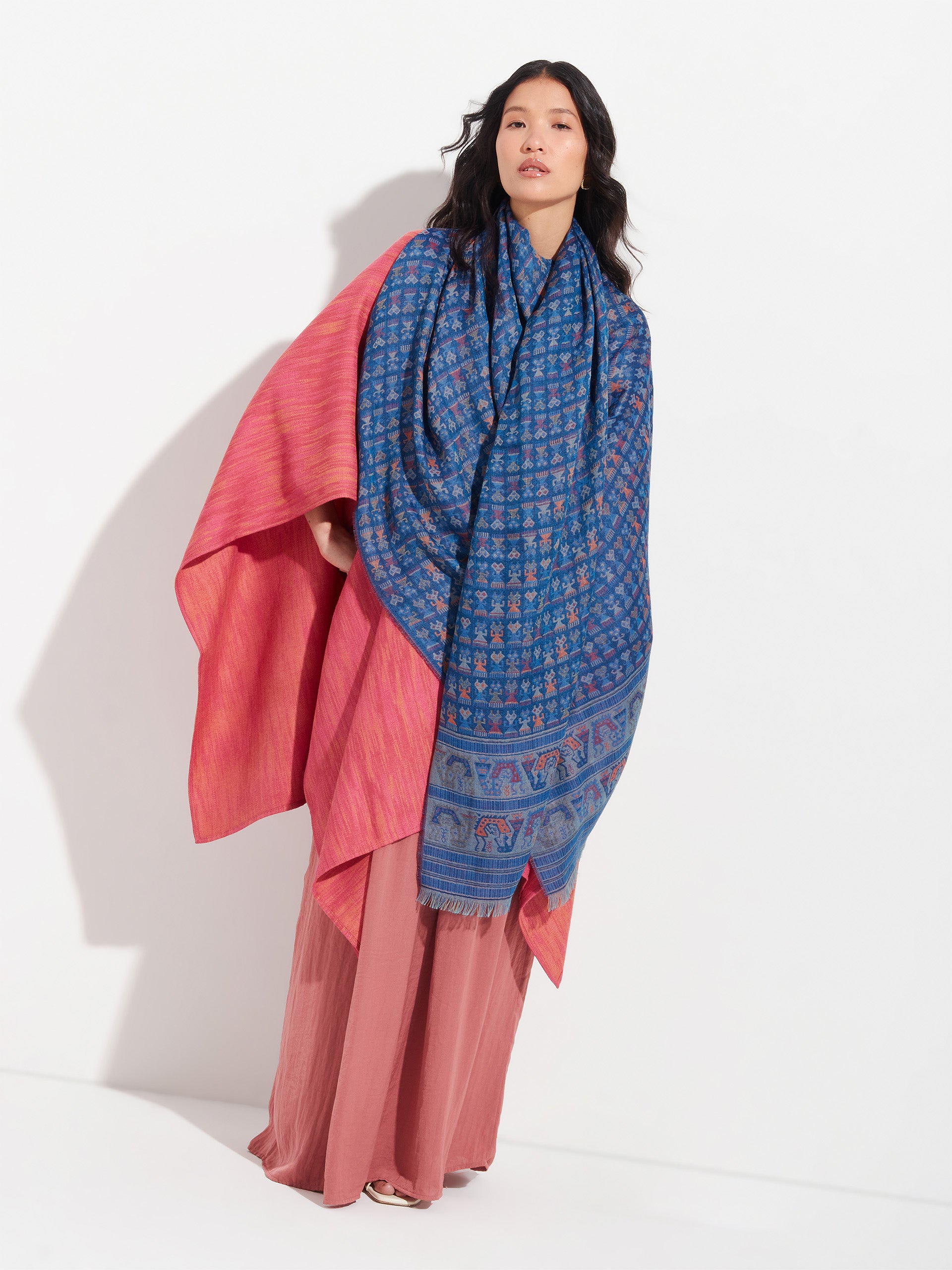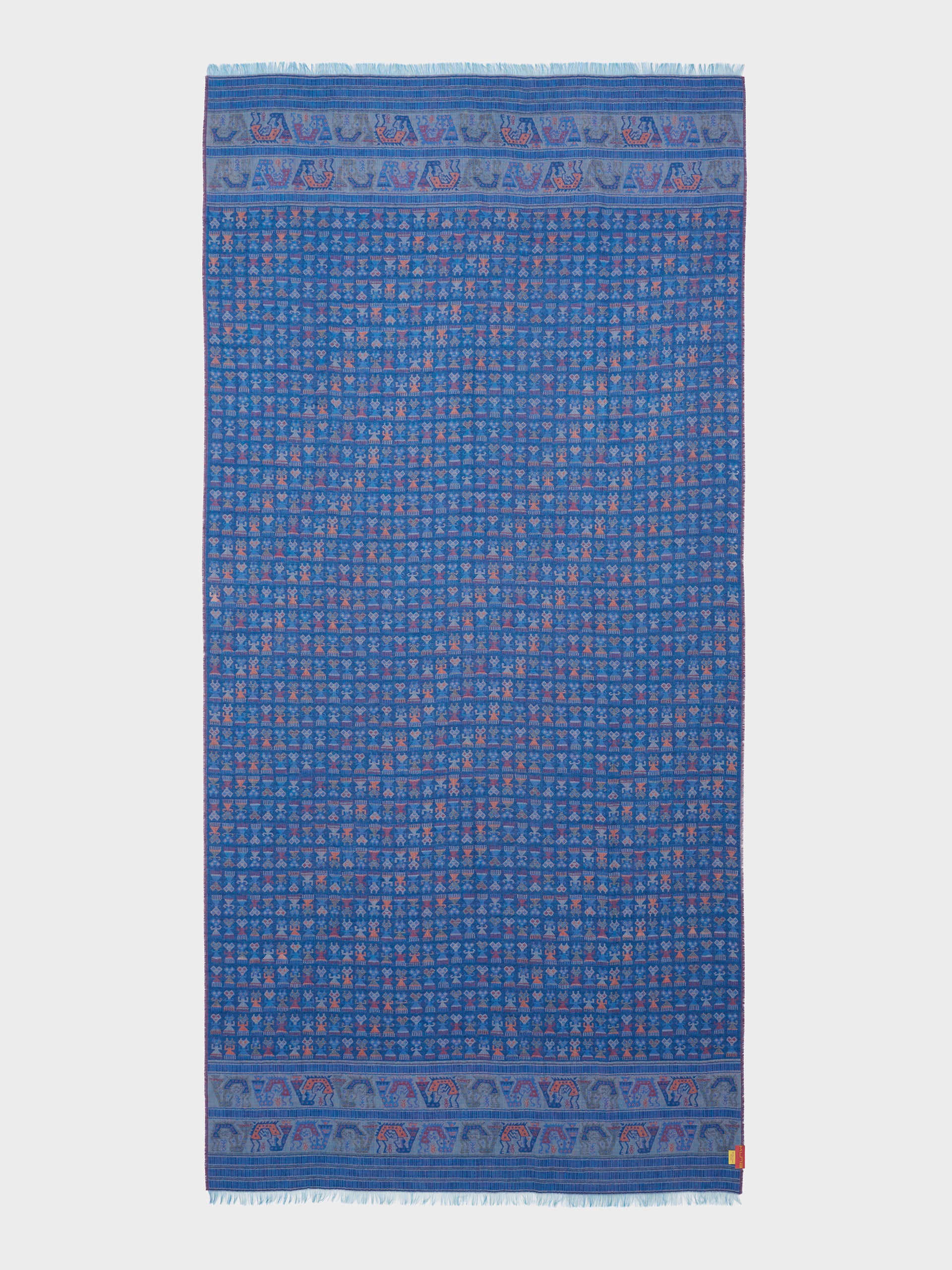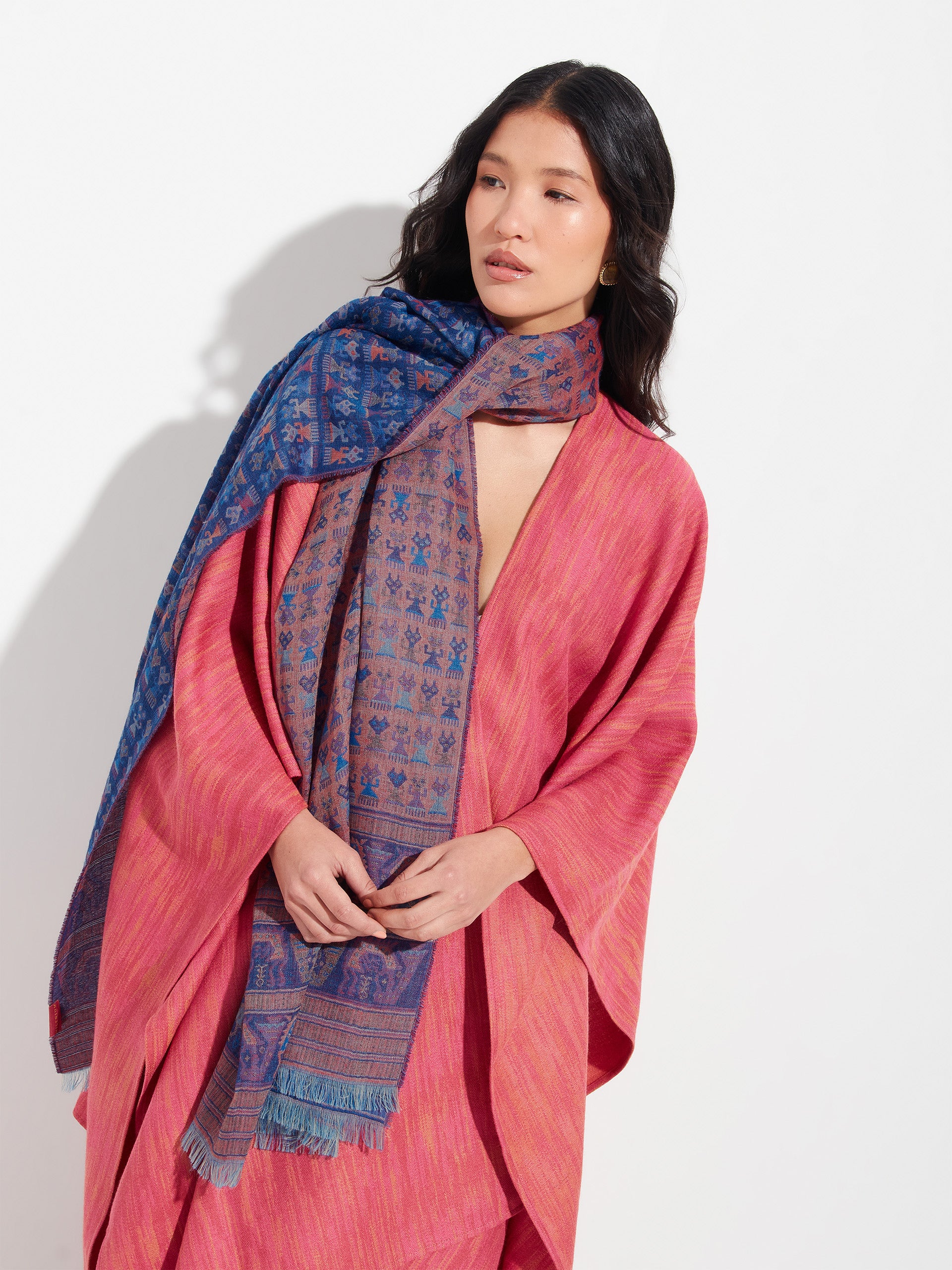 Estola Lambayeque 9 en tonalidad azul, elaborada en 50% Royal alpaca y 50% seda, con técnica Jacquard en doble tela e inserción de trama oculta. Con una medida de 200/196 x 93 cm, es una prenda reversible, inspirada en la Cultura Lambayeque, que reinterpreta la tradición ancestral a través de un diseño con esencia cultural. | Material predominante: Royal Alpaca y Seda