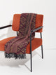 Manta Chincha 2 en tonalidad rojo, elaborada en 100% baby alpaca con técnica Jacquard en doble cara. Con una medida de 200/184 x 145 cm, está inspirada en la Cultura Chincha, que evoca la riqueza de las tradiciones antiguas a través de un diseño con identidad cultural. | Material predominante: Baby Alpaca