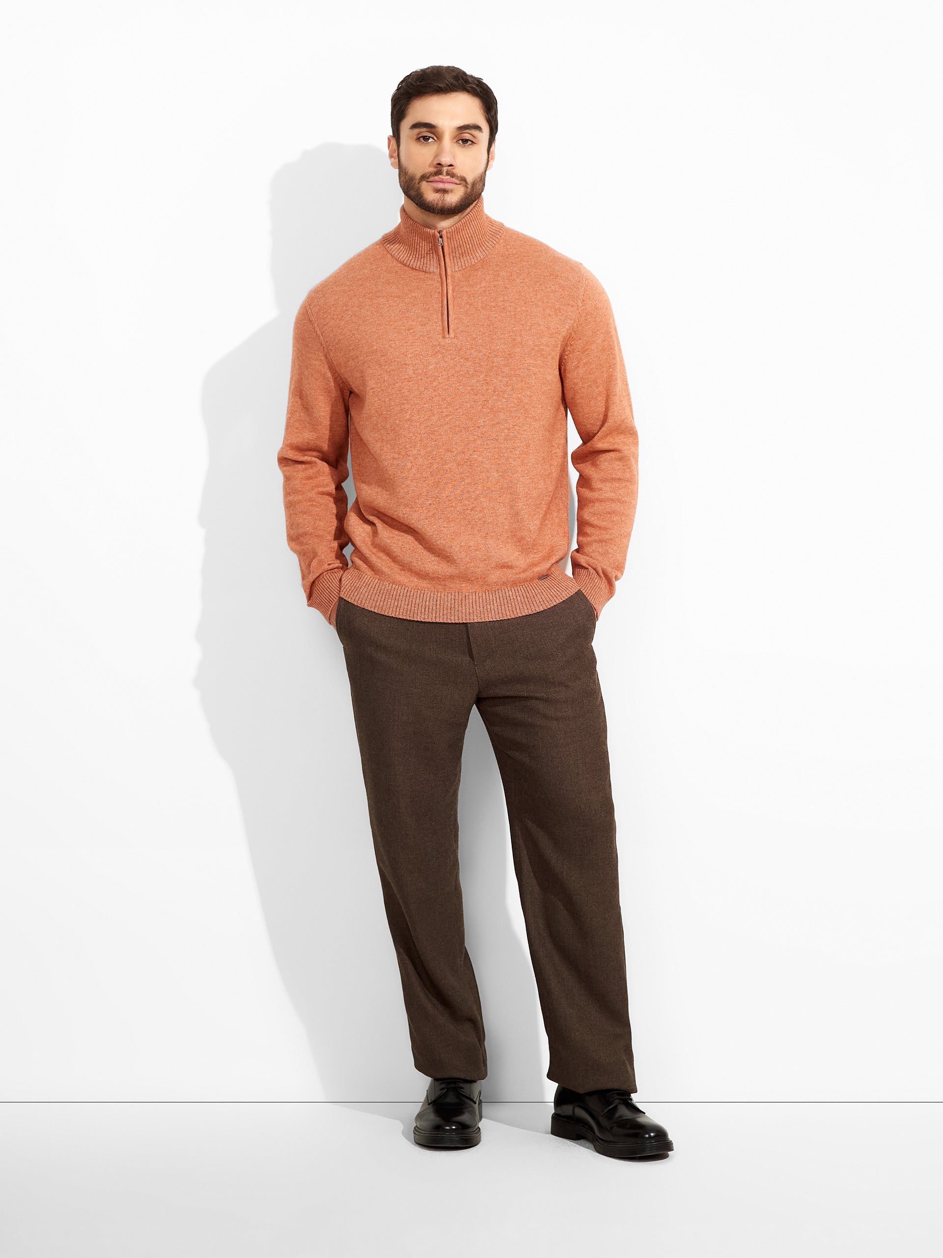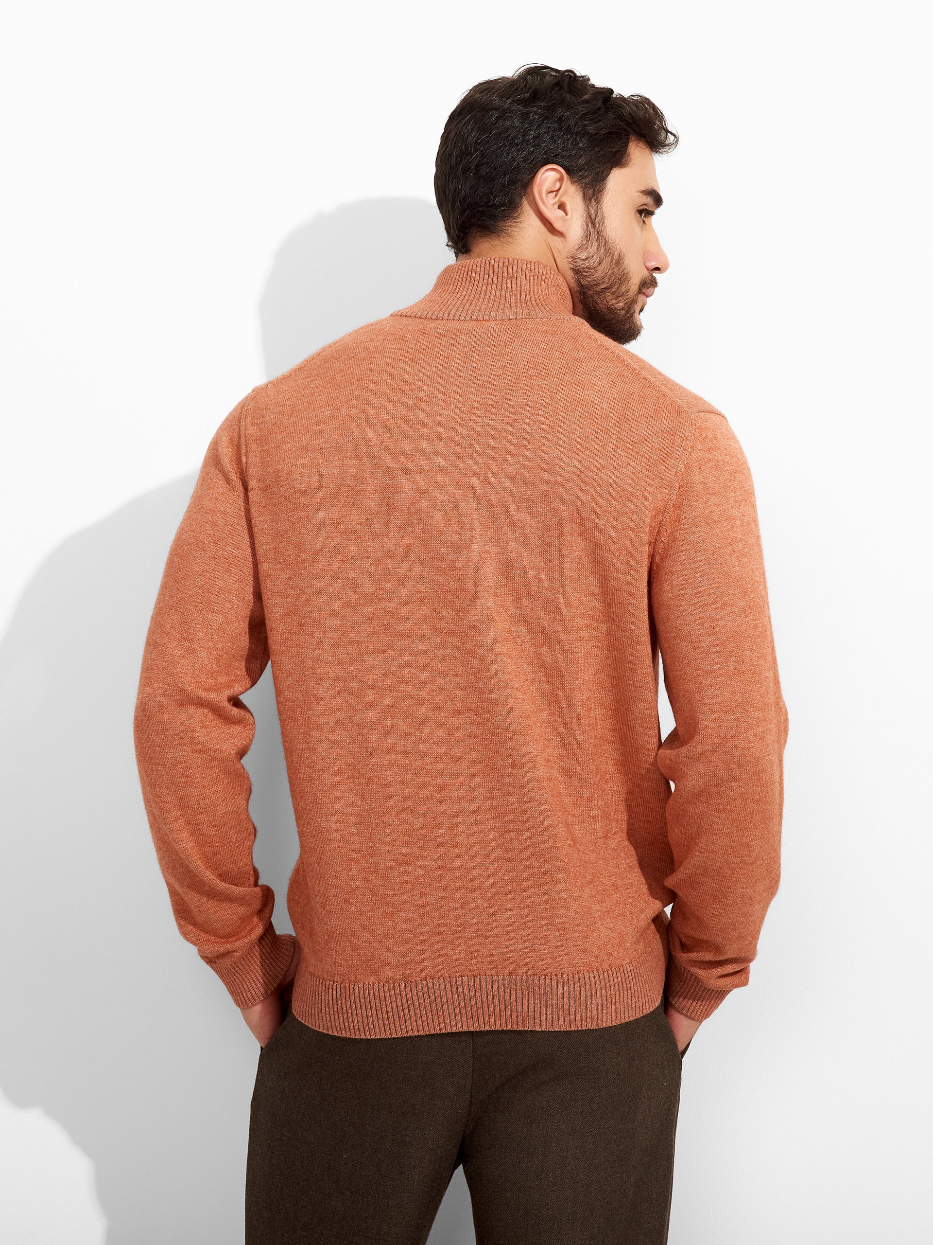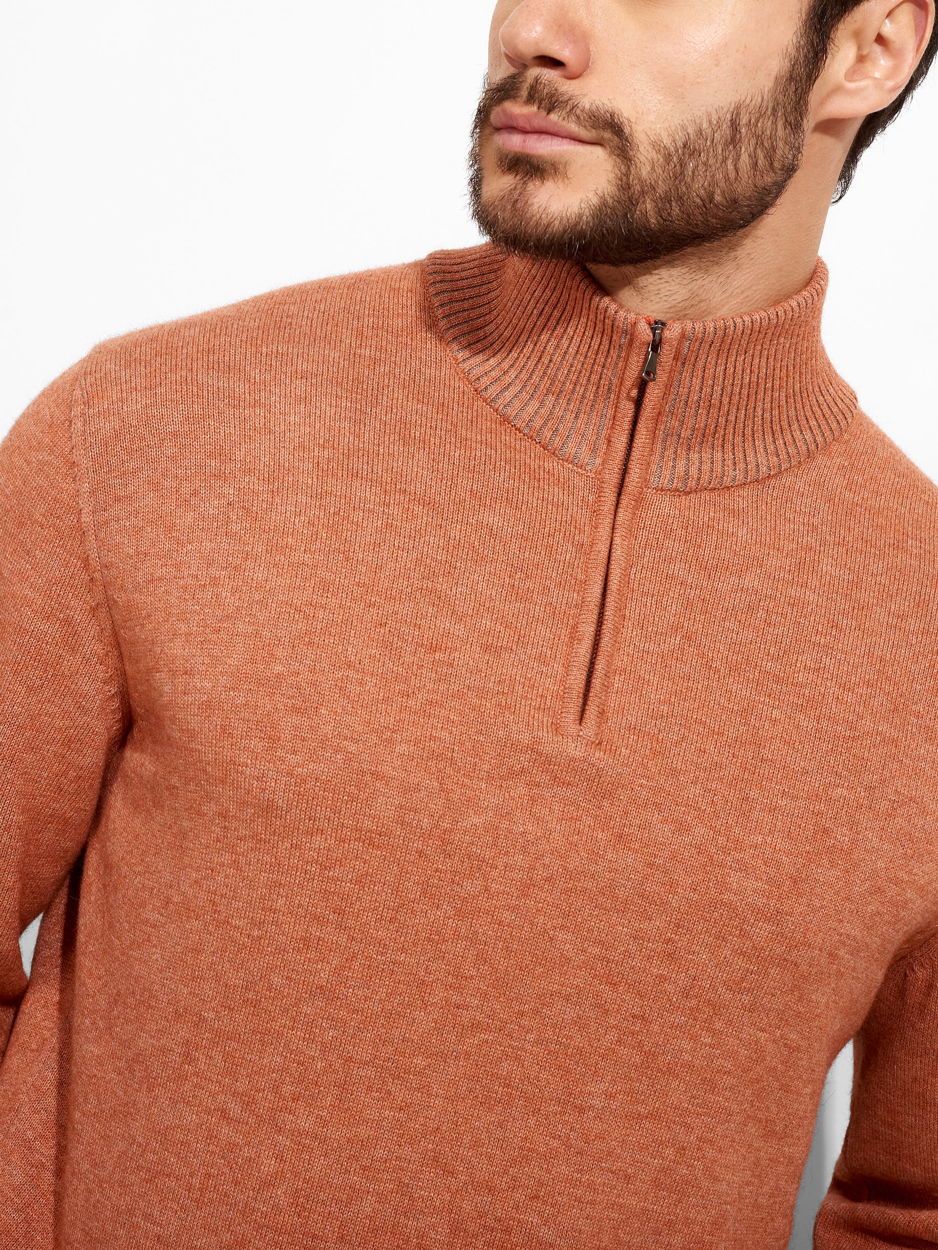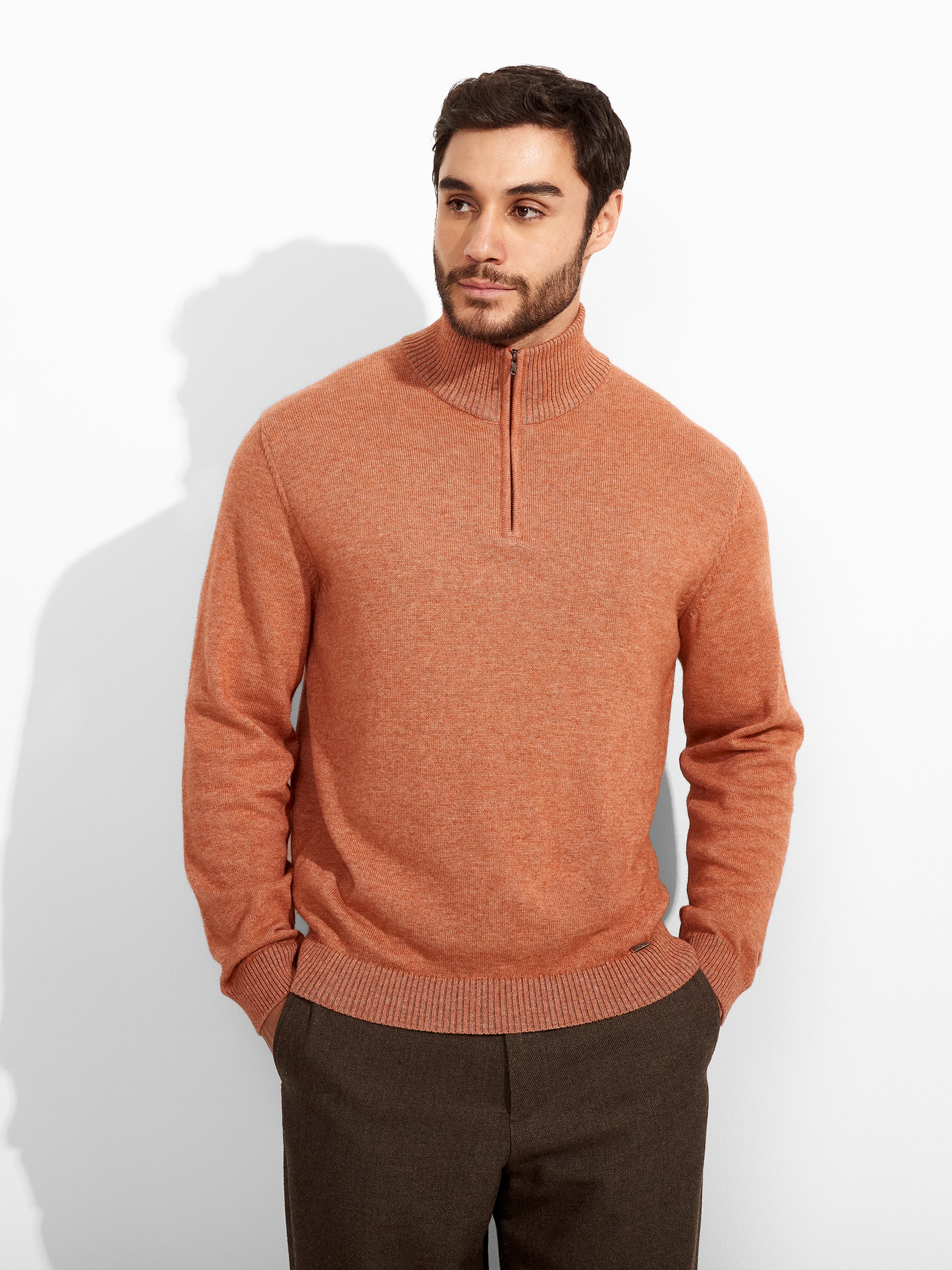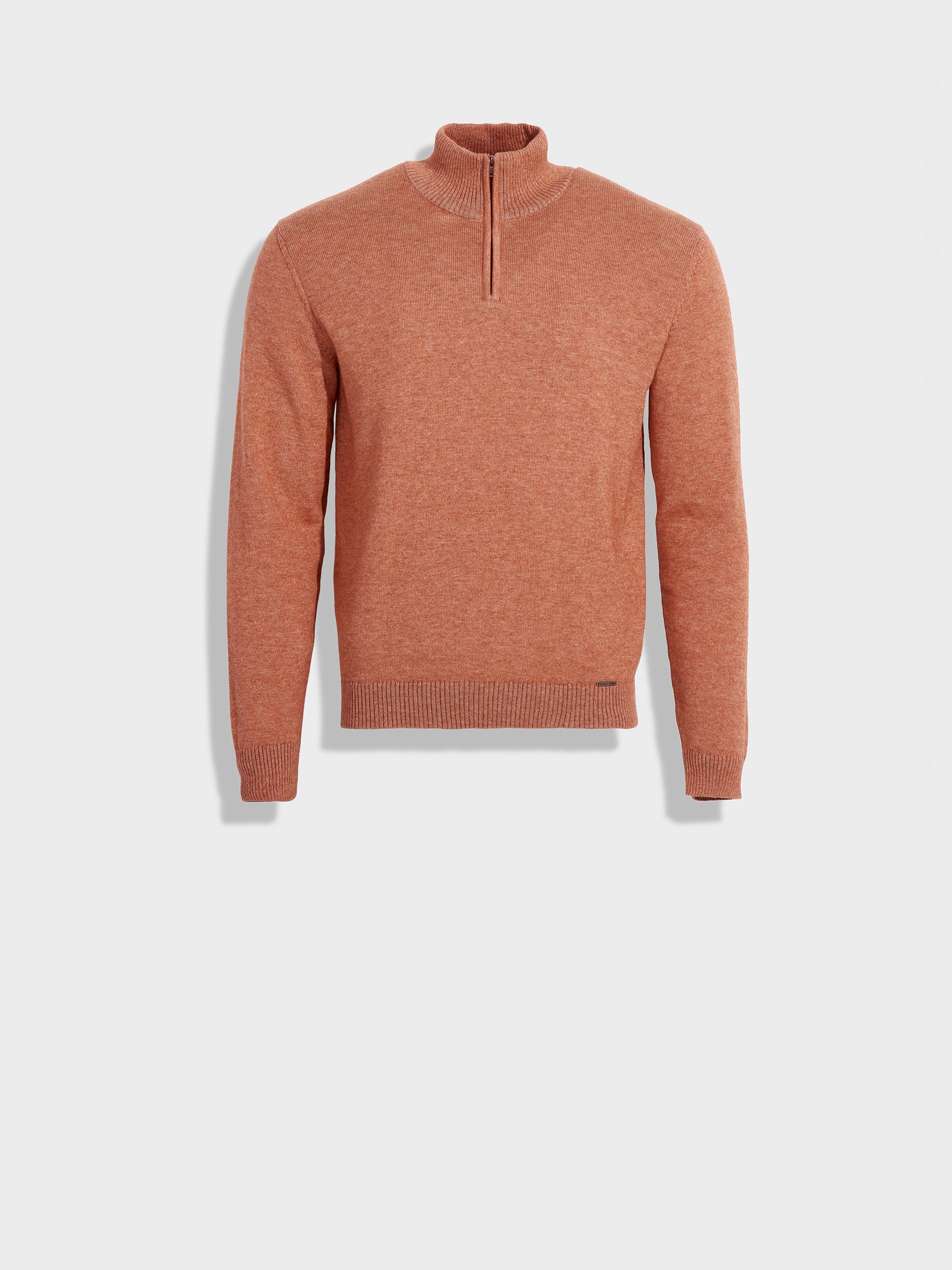 Suéter Zola en tonalidad naranja, con cuello alto y cremallera parcial. Presenta puños de punto acanalado. Confeccionado en una mezcla de algodón y baby alpaca que brinda suavidad y abrigo. | Material predominante: Algodón