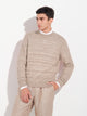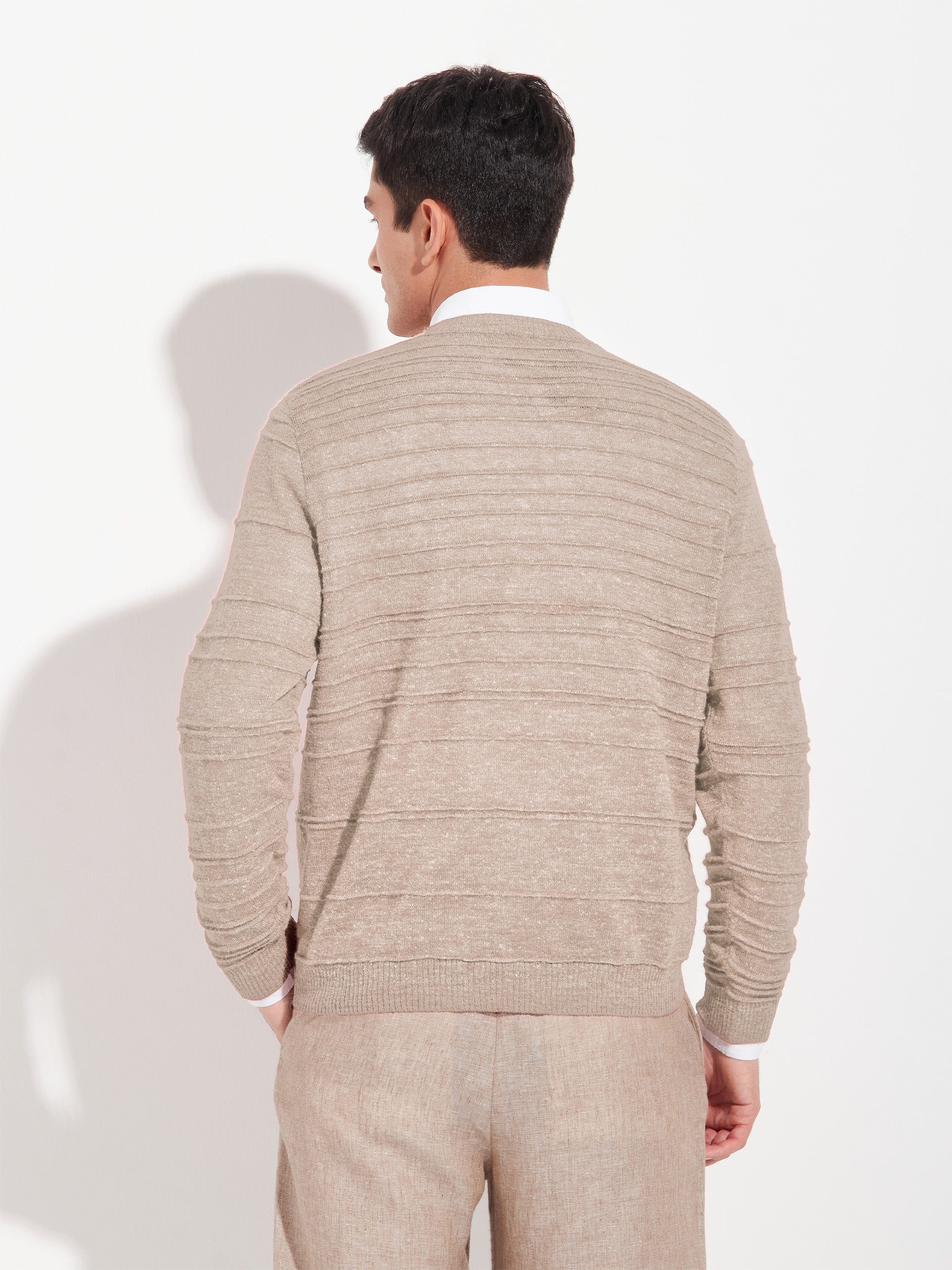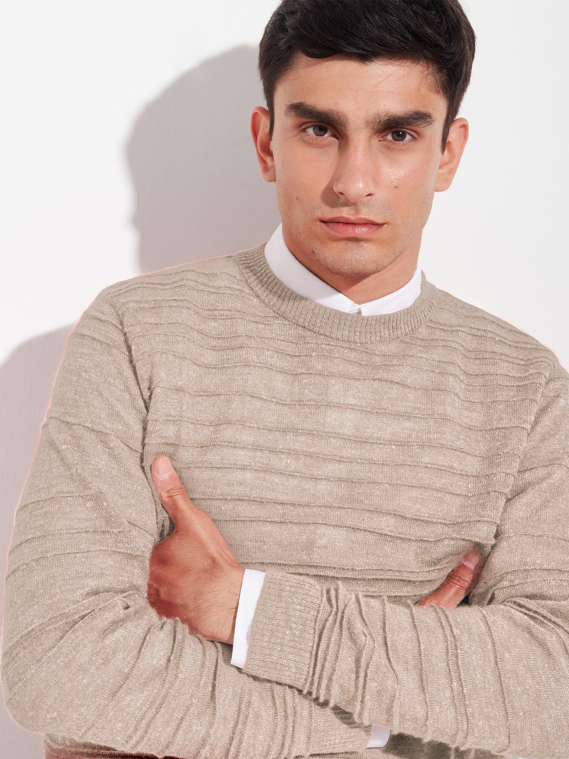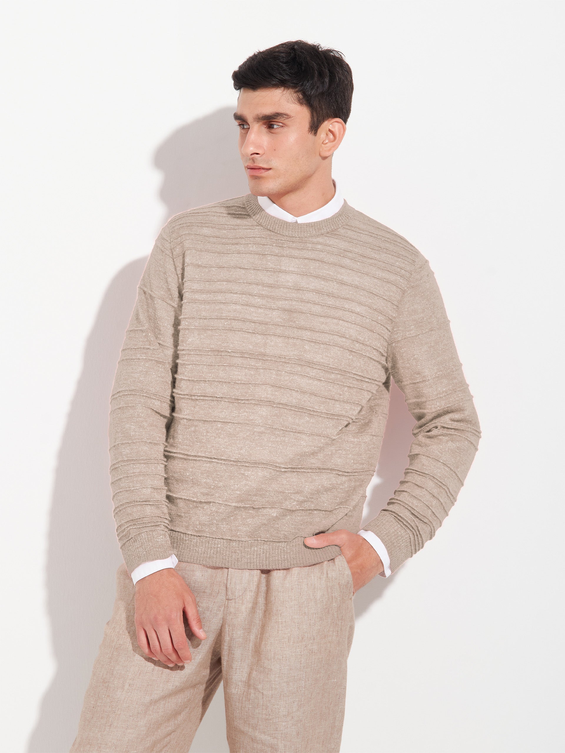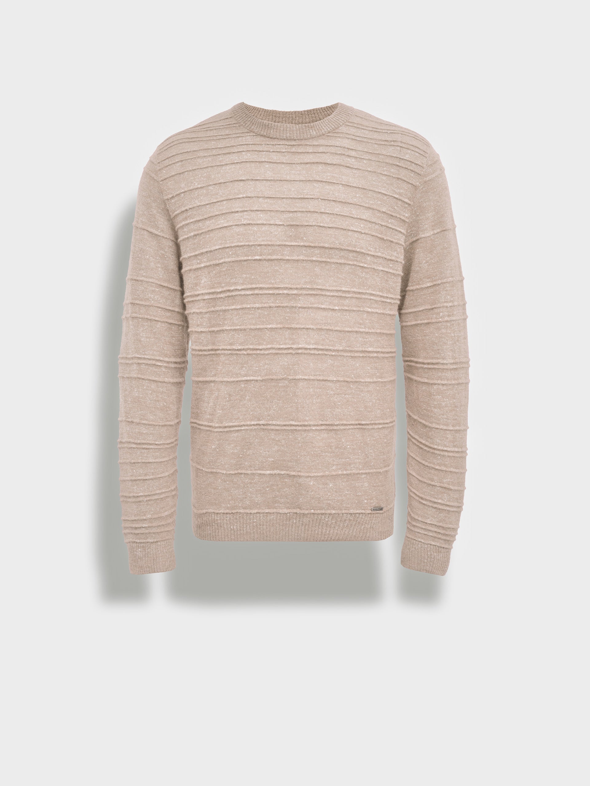Suéter Zidane en tonalidad roja, confeccionado en una mezcla de baby alpaca y lino. Presenta cuello redondo y punto jersey estructurado, brindando una textura definida y un estilo contemporáneo con la suavidad característica de la baby alpaca. | Material predominante: Baby Alpaca