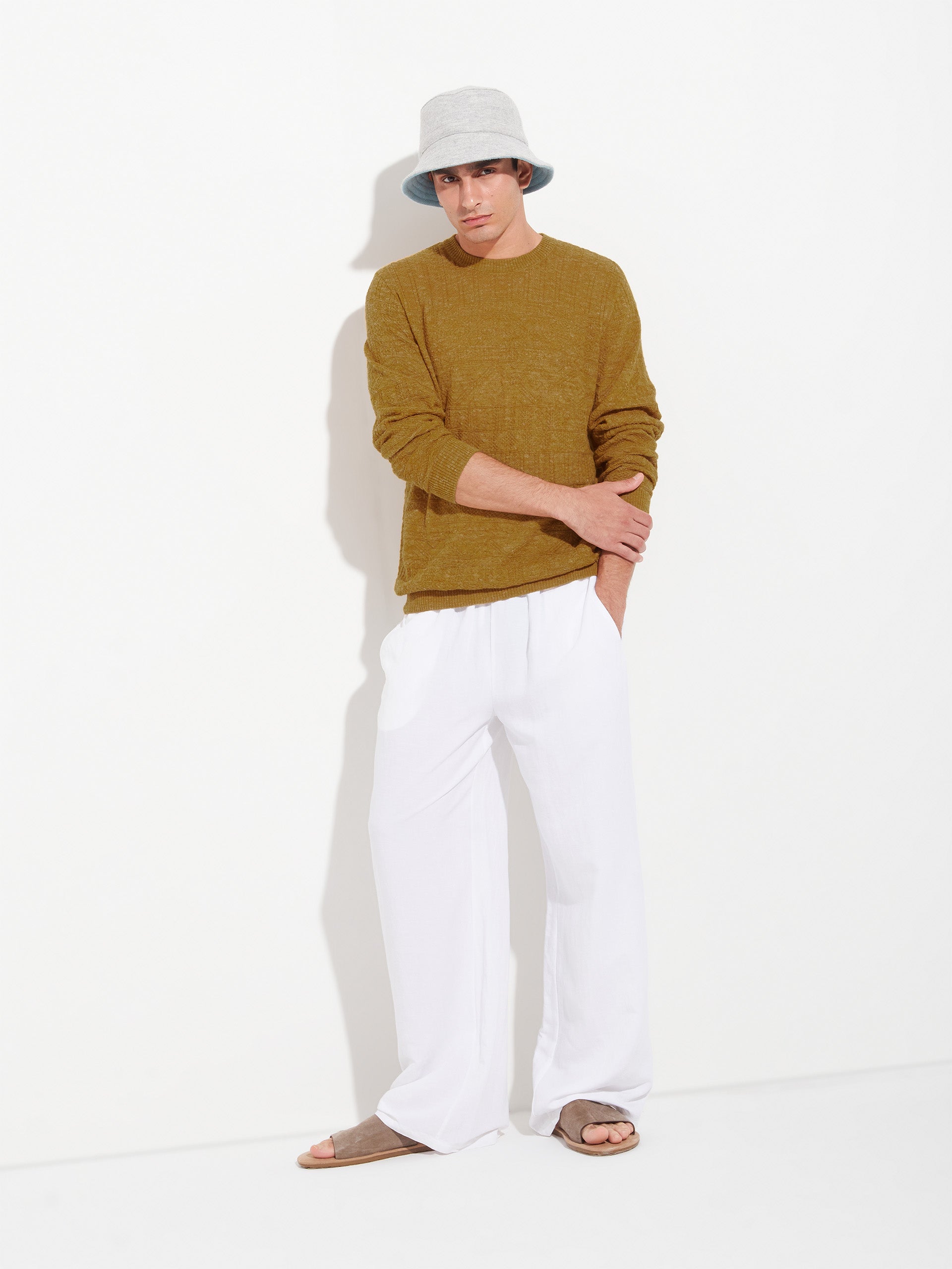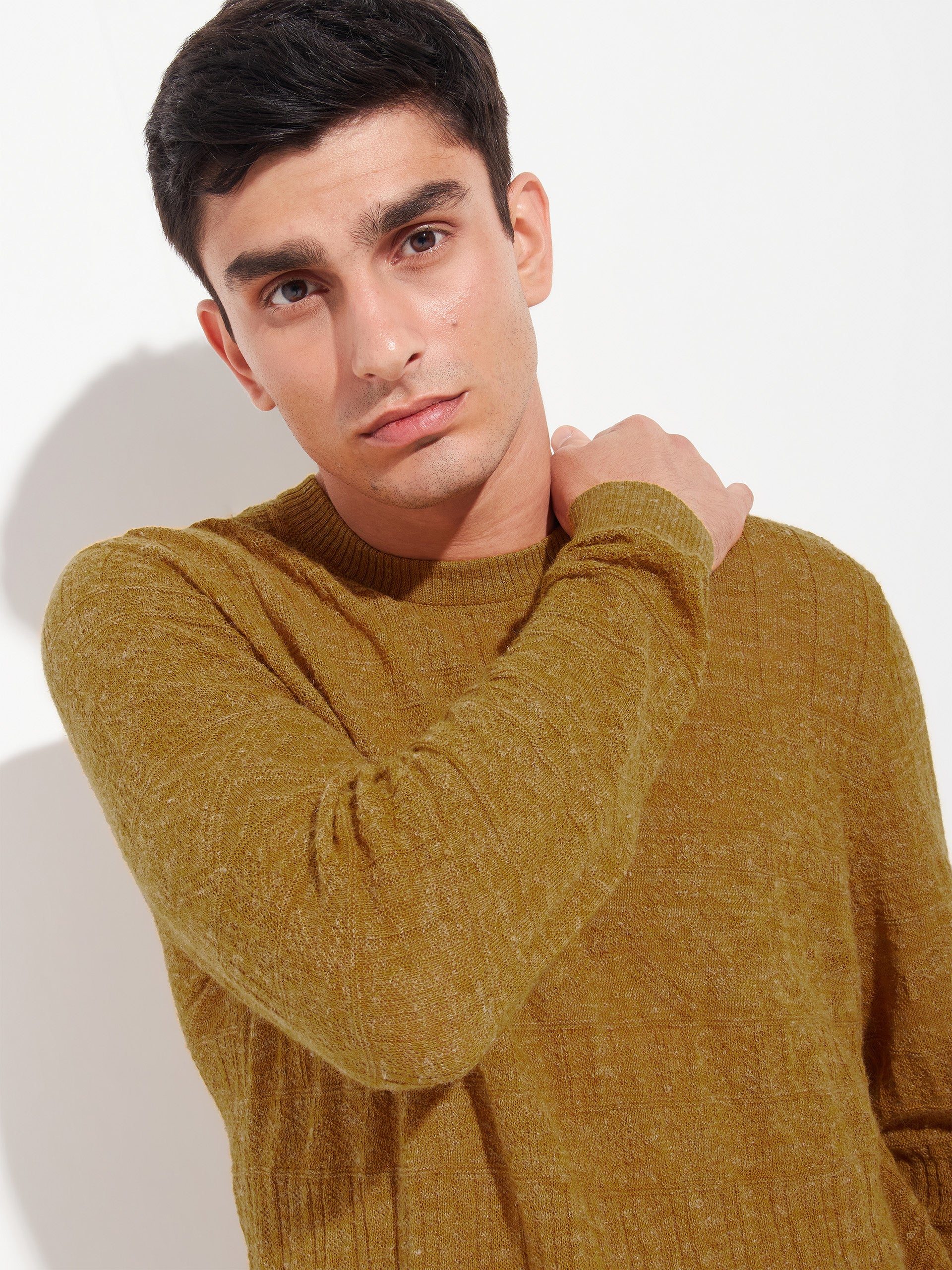 Suéter Zoom en tonalidad amarilla, confeccionado en una mezcla de baby alpaca y lino. Presenta cuello redondo y un punto estructurado en el reverso y derecho, que aporta textura y un acabado refinado. Ideal para un look sofisticado y confortable.. | Material predominante: Baby Alpaca