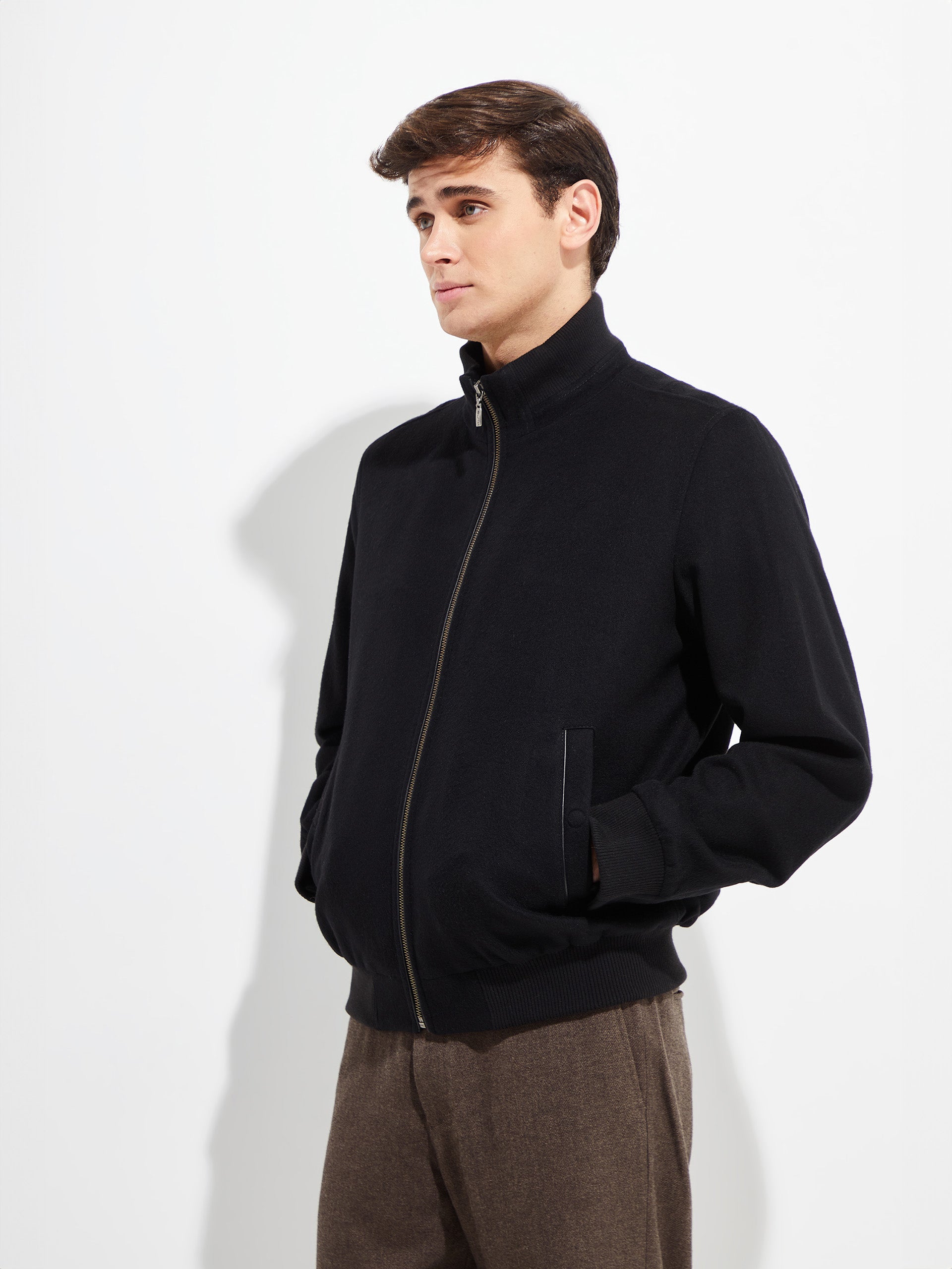 Refinada casaca de vicuña con forro de seda, diseñada con amplios bolsillos y un cierre metálico que puede ser cubierto por un cruce de la misma tela con broches metálicos. Este clásico es un referente en la moda masculina, combinando elegancia y funcionalidad en una pieza atemporal que realza cualquier guardarropa. | Material predominante: VICUÑA