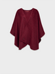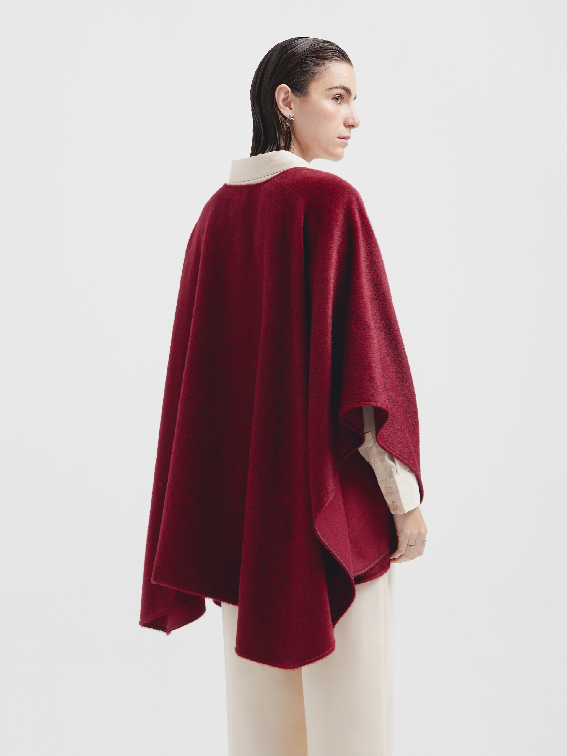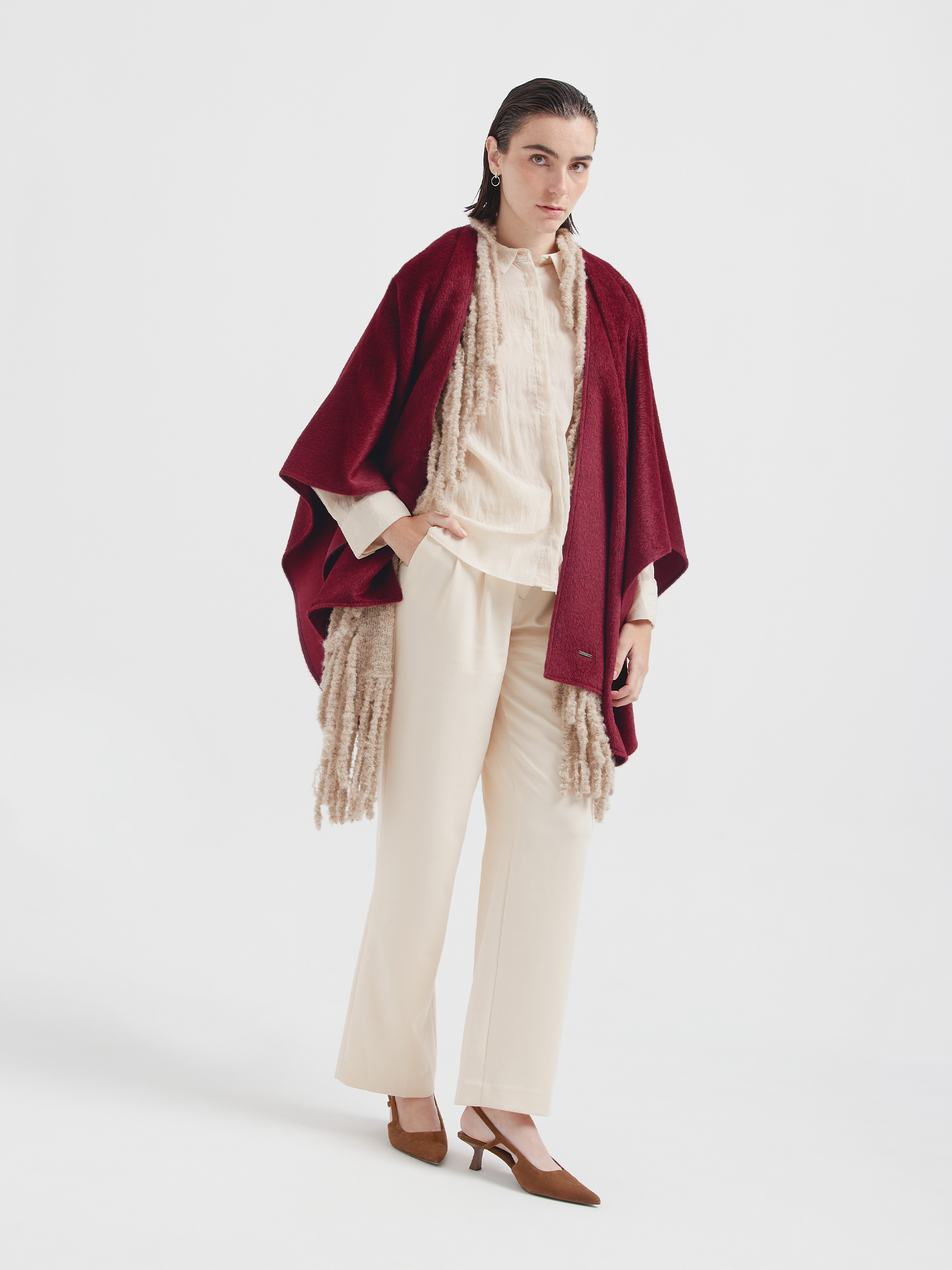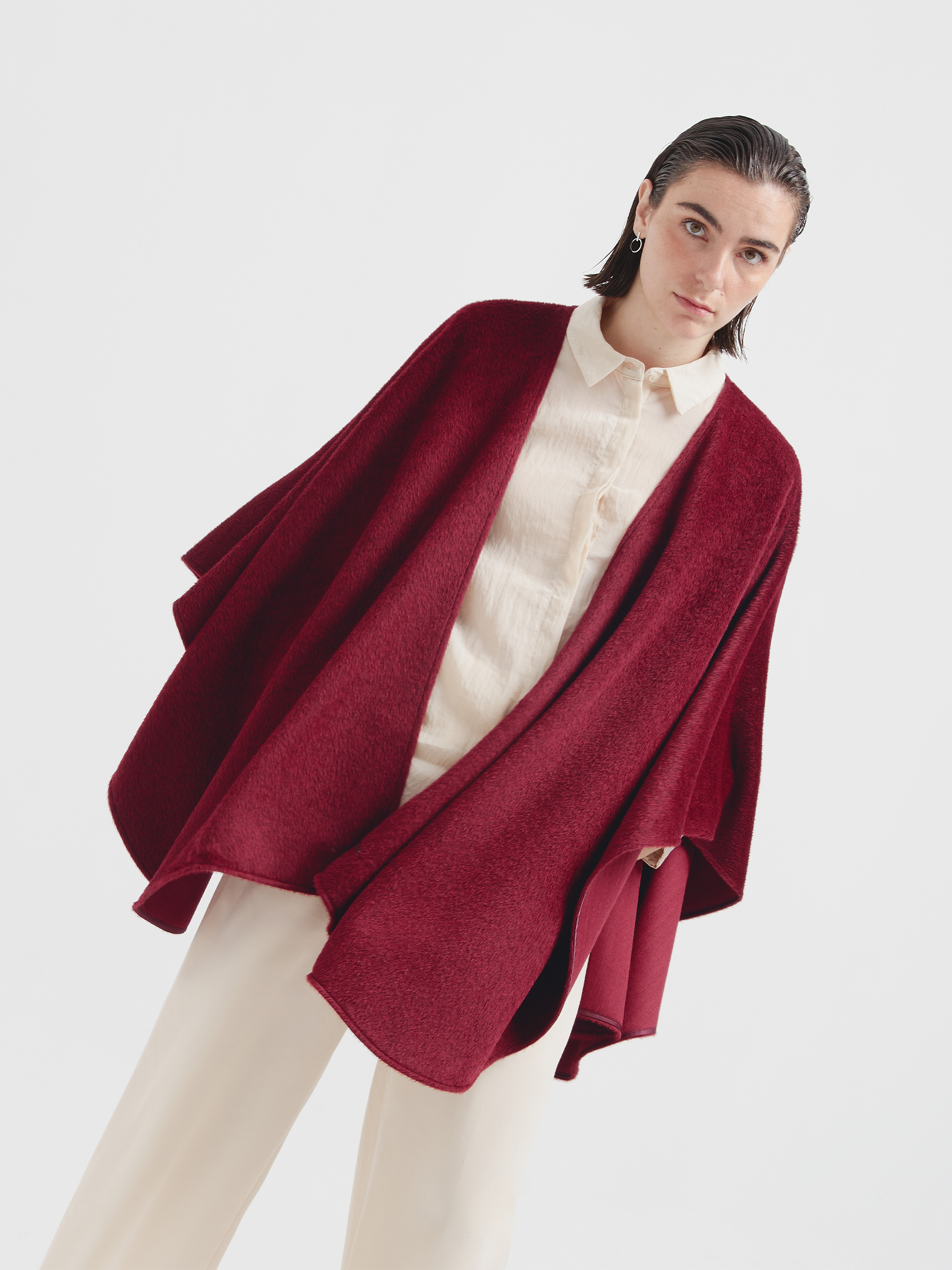 Capa Agil en tonalidad guinda, elaborada en una mezcla de baby alpaca suri y lana. Esta prenda para mujer destaca por la textura sedosa y el brillo natural característico de la fibra suri. Su diseño presenta una silueta envolvente de caída fluida y minimalista, resaltando por su elegancia en color entero y una calidez superior. | Material predominante: Baby Alpaca Suri