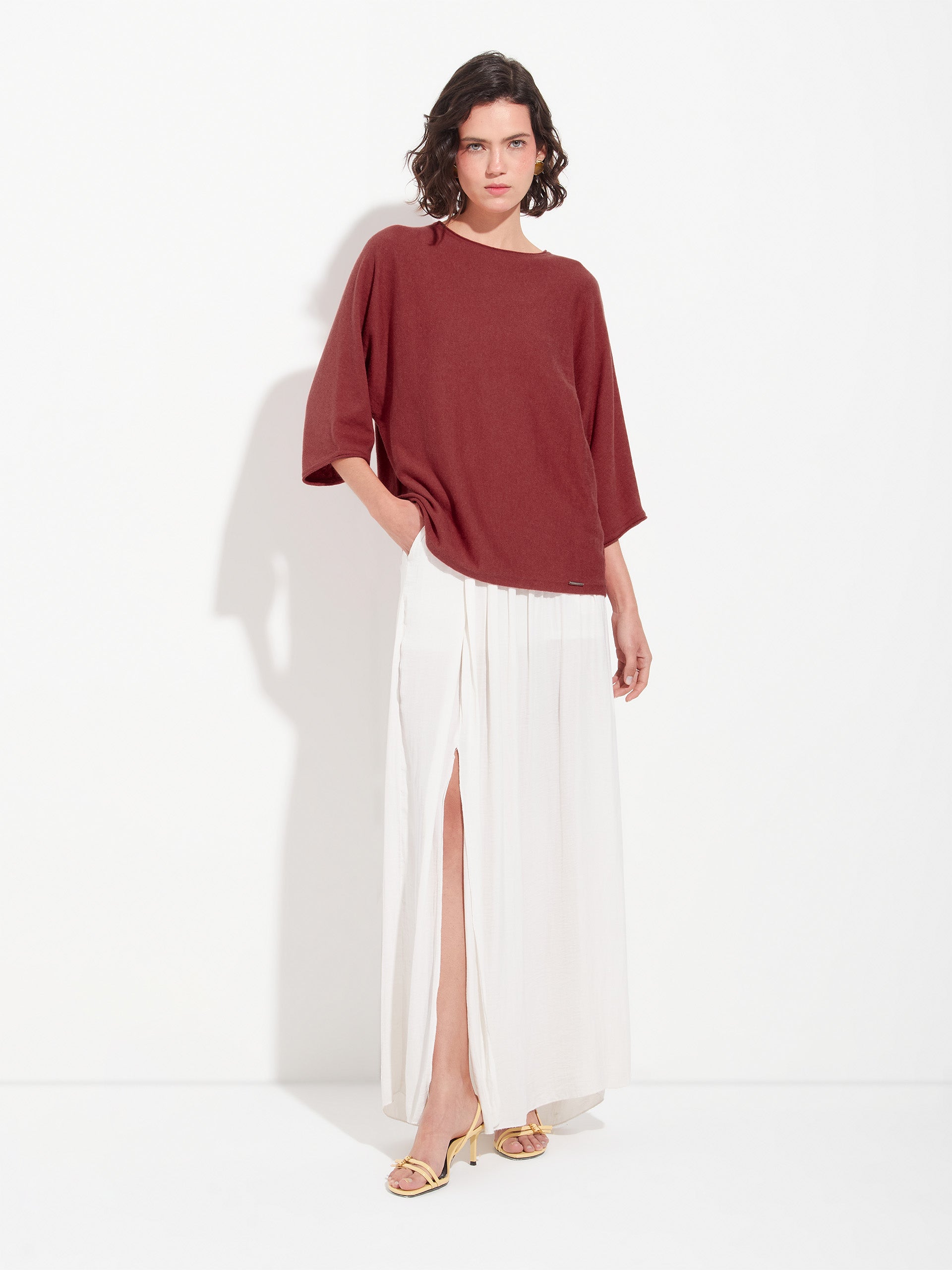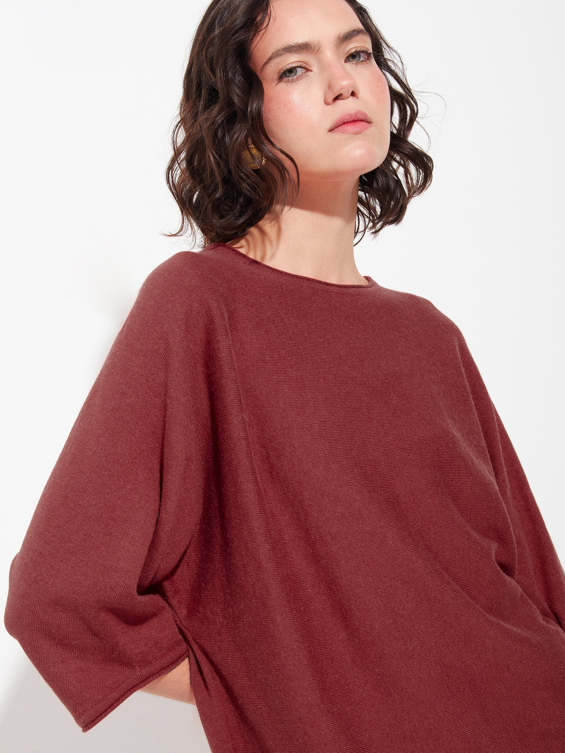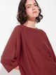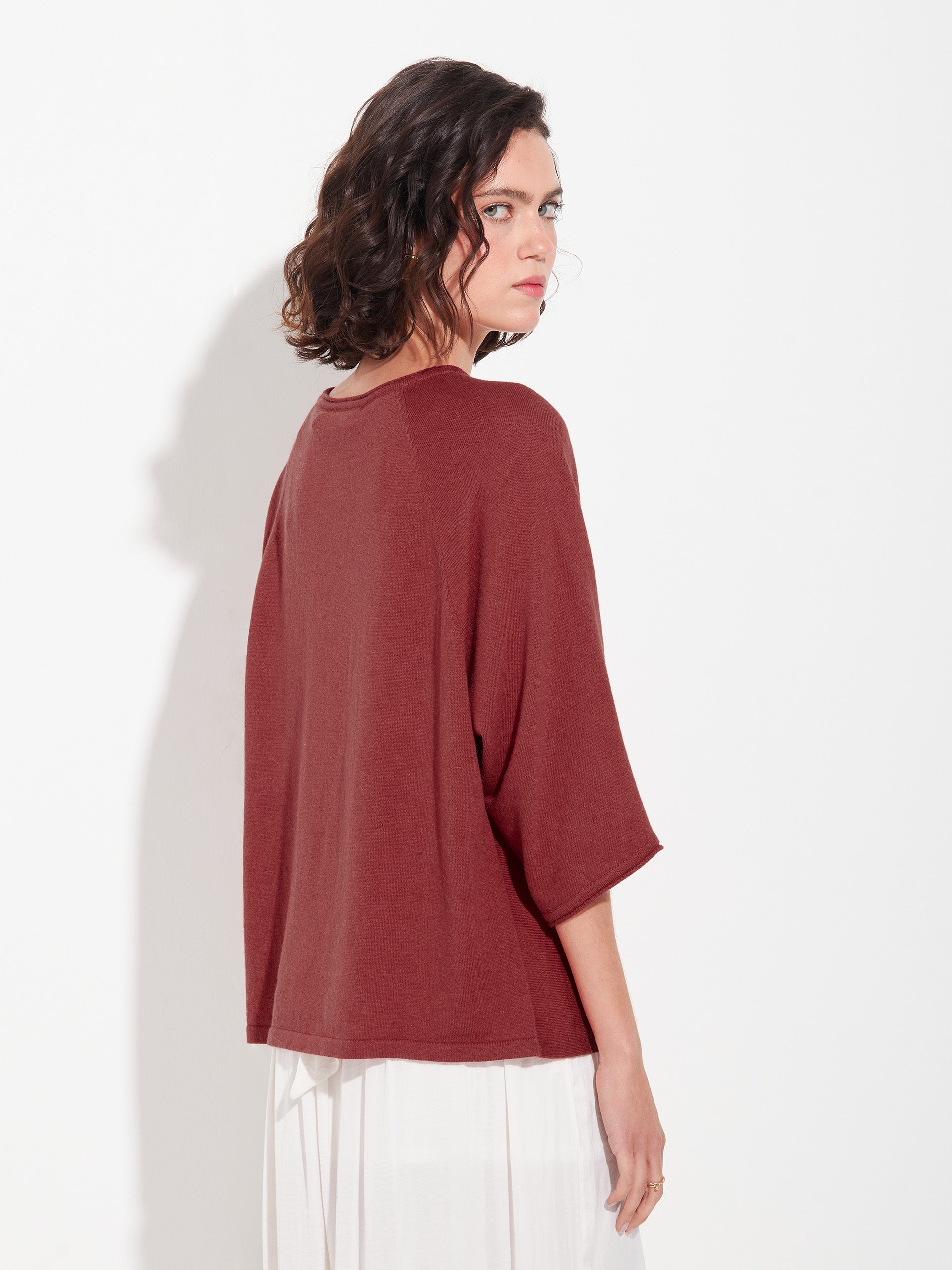 Polo Zwing en tonalidad roja, confeccionado con una mezcla de algodón orgánico y baby alpaca. Presenta cuello redondo y mangas tres cuartos, elaborado en punto jersey que aporta suavidad y ligereza. Una prenda versátil y confortable, ideal para un estilo casual con un toque natural. | Material predominante: Algodon
