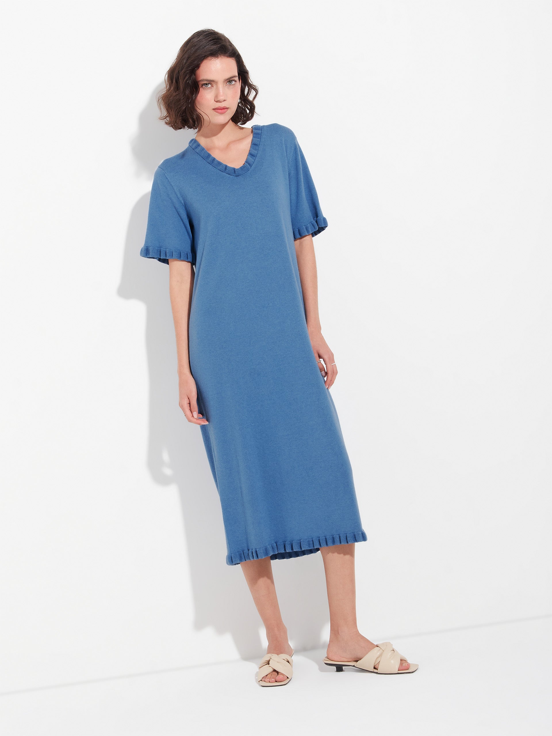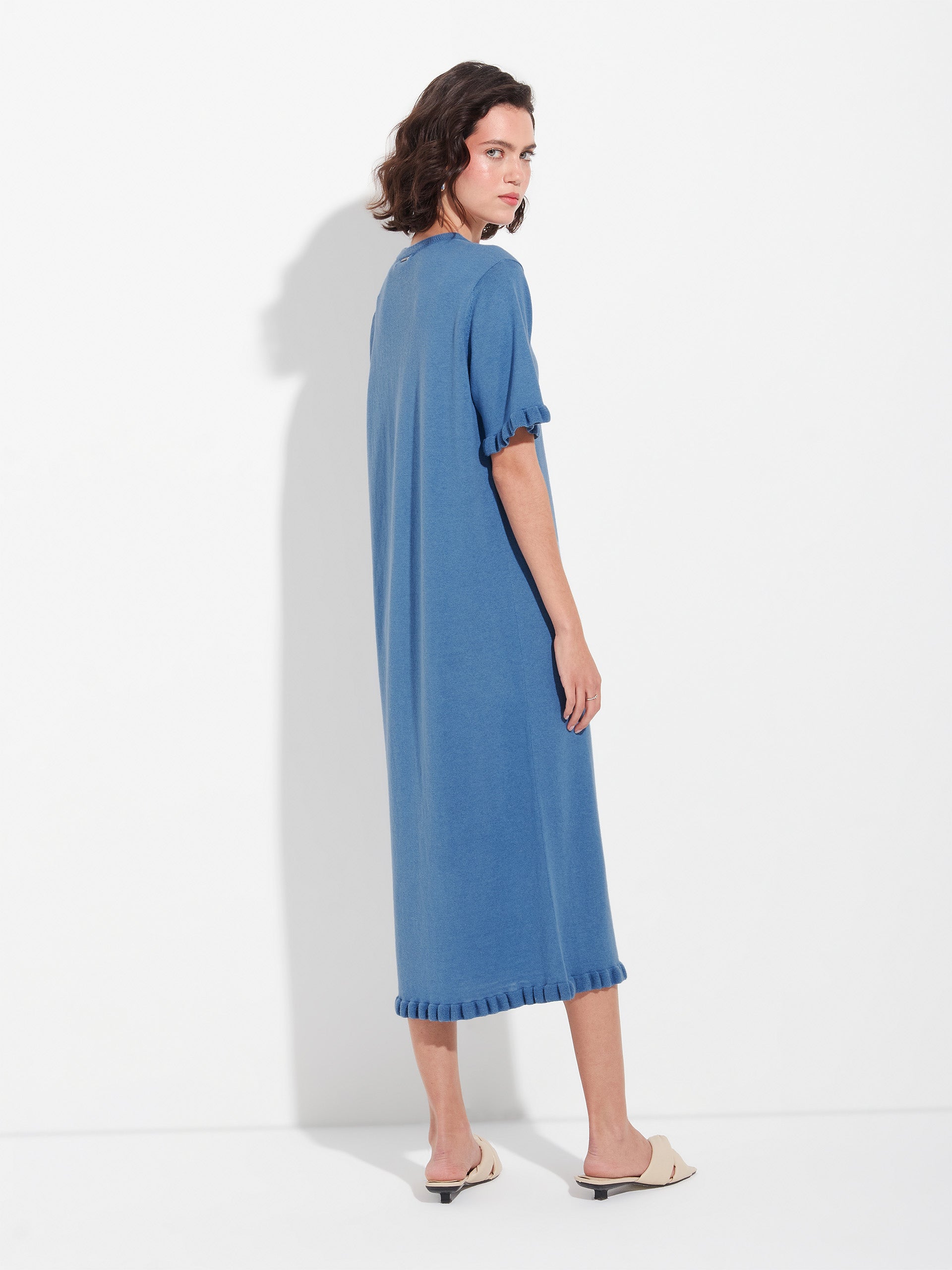 Vestido Zabrina en tonalidad azul, confeccionado con una mezcla de algodón orgánico y baby alpaca. Presenta punto llano con abertura y bolsillos, ofreciendo una textura suave y un diseño cómodo de estilo moderno y natural. | Material predominante: Algodon