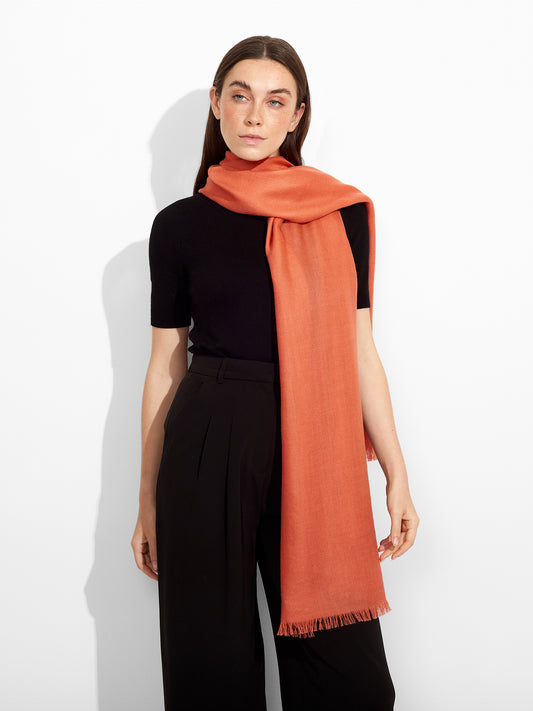 Estola Teaberry en tonalidad naranja, de color entero, presenta bordes con flecos finos que aportan...