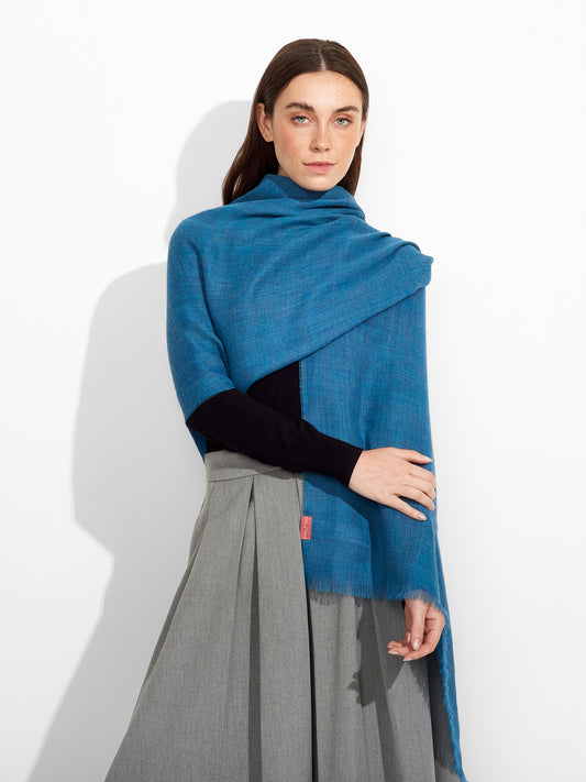 Estola Zaina en tonalidad celeste, de ligero efecto tornasol, presenta bordes con flecos finos. Confeccionada...