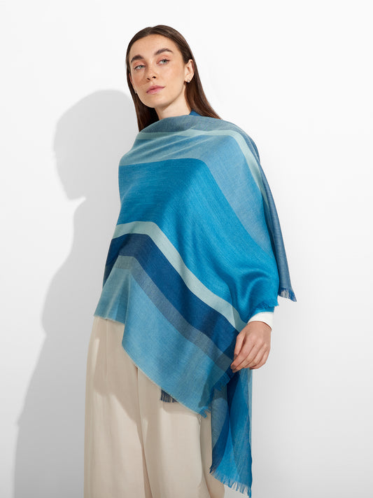 Estola Zane en tonalidad azul, presenta tejido jaquard con un diseño de líneas irregulares y...