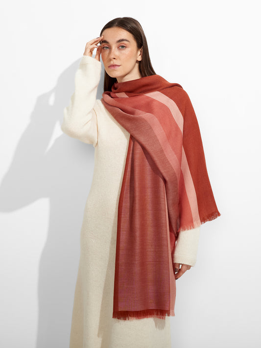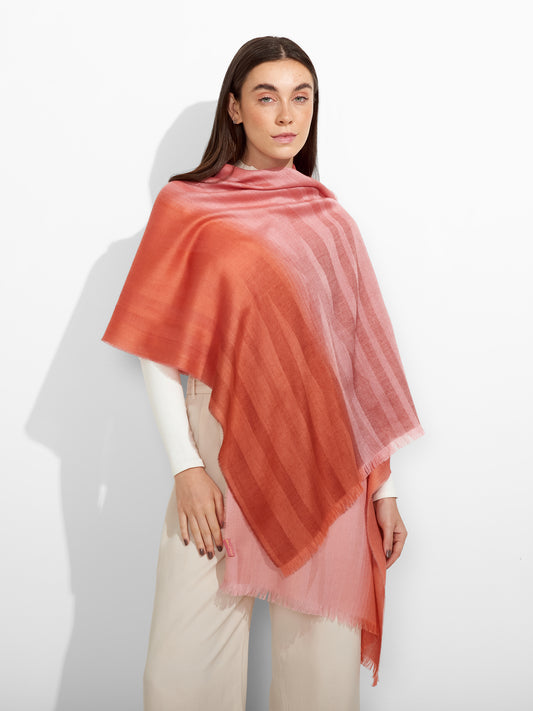 Estola Zulma en tonalidad rojo, con un diseño de colores degradados, presenta bordes con flecos...