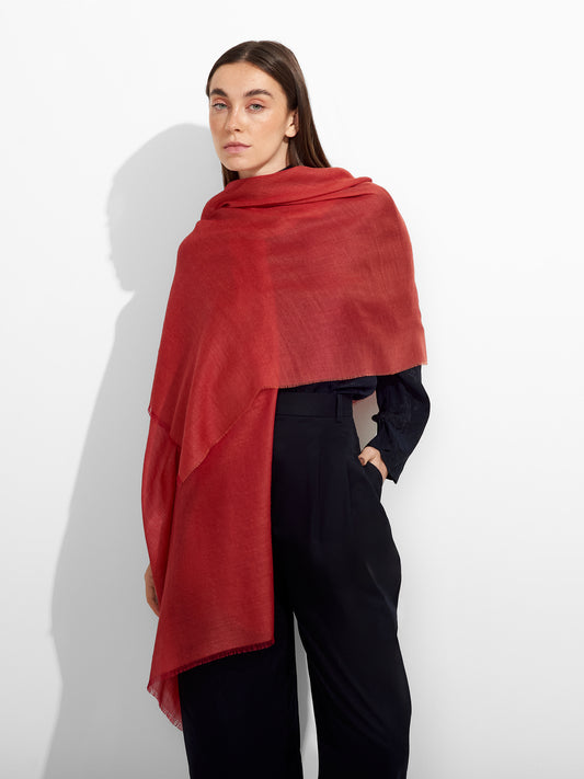 Estola Zaina en tonalidad rojo, de ligero efecto tornasol, presenta bordes con flecos finos. Confeccionada...