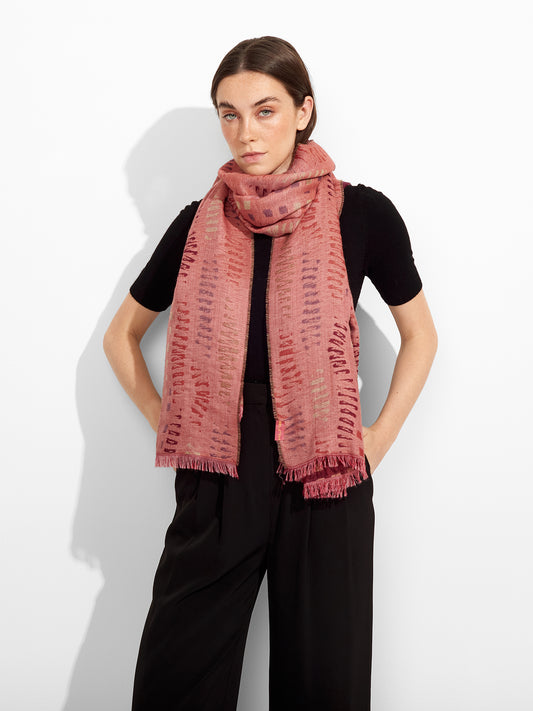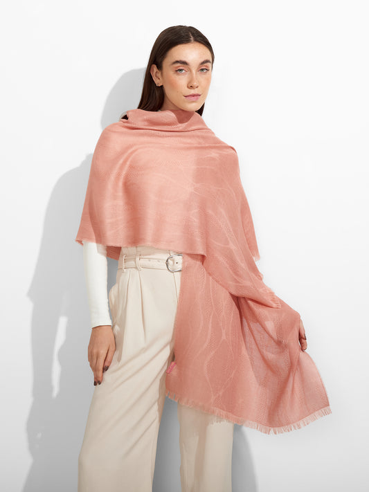 Estola Zane en tonalidad rosado, presenta tejido jaquard con un diseño de líneas irregulares y...