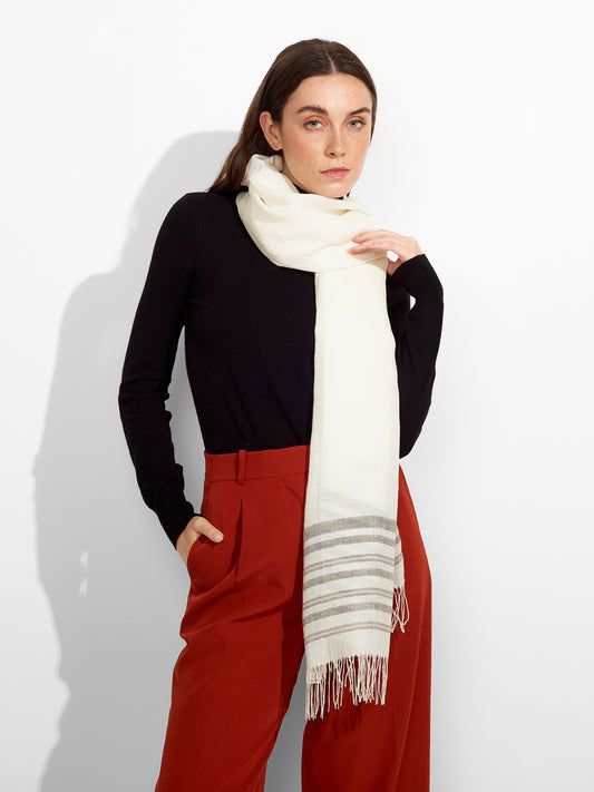 Estola Mao en tonalidad ecru, con un diseño de rayas en un extremo, presenta bordes...