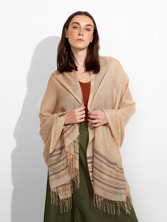 Estola Mao en tonalidad beige, con un diseño de rayas en un extremo, presenta bordes...