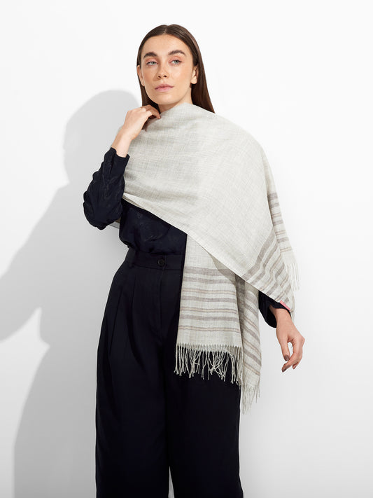 Estola Mao en tonalidad gris, con un diseño de rayas en un extremo, presenta bordes...