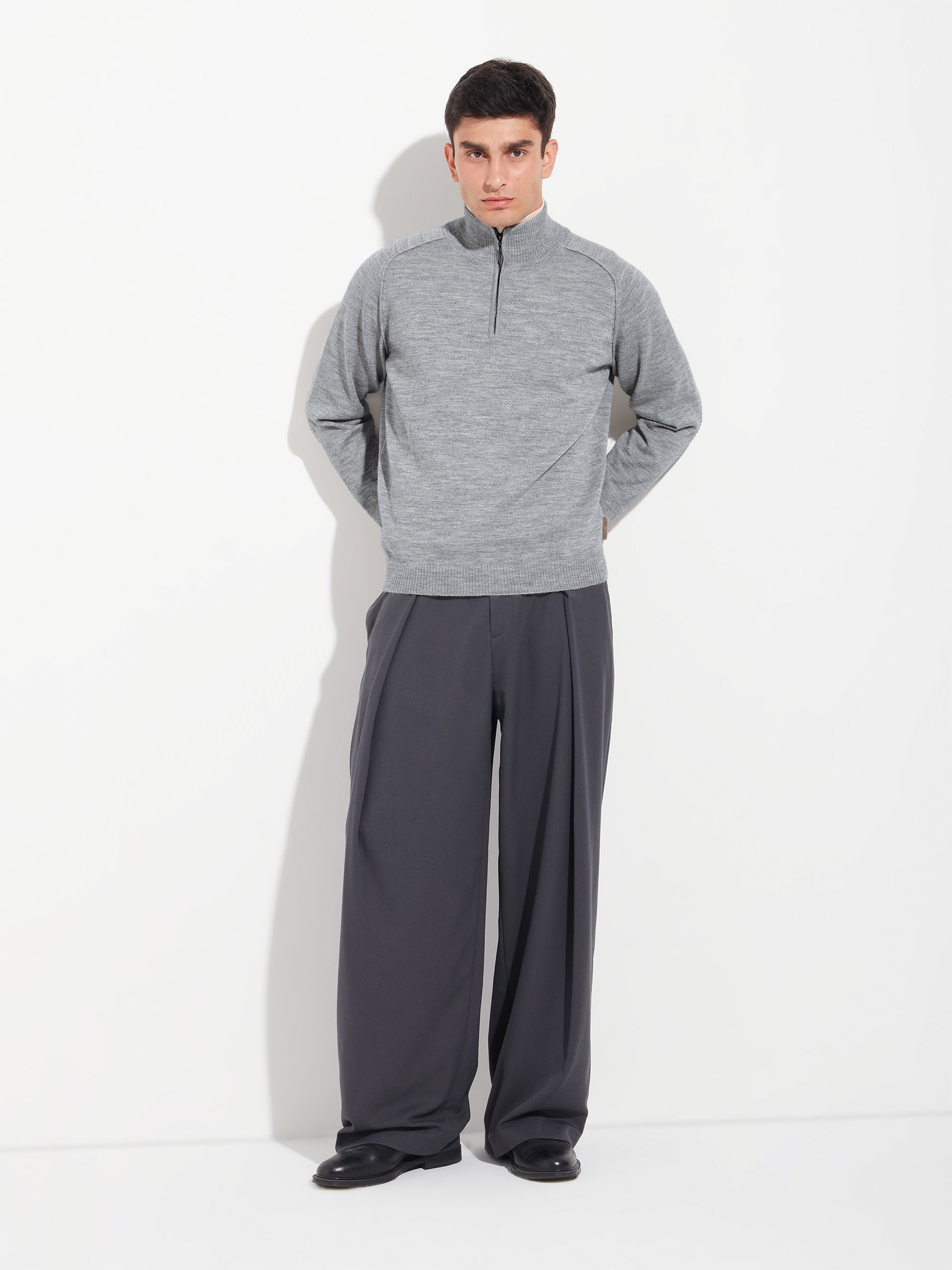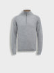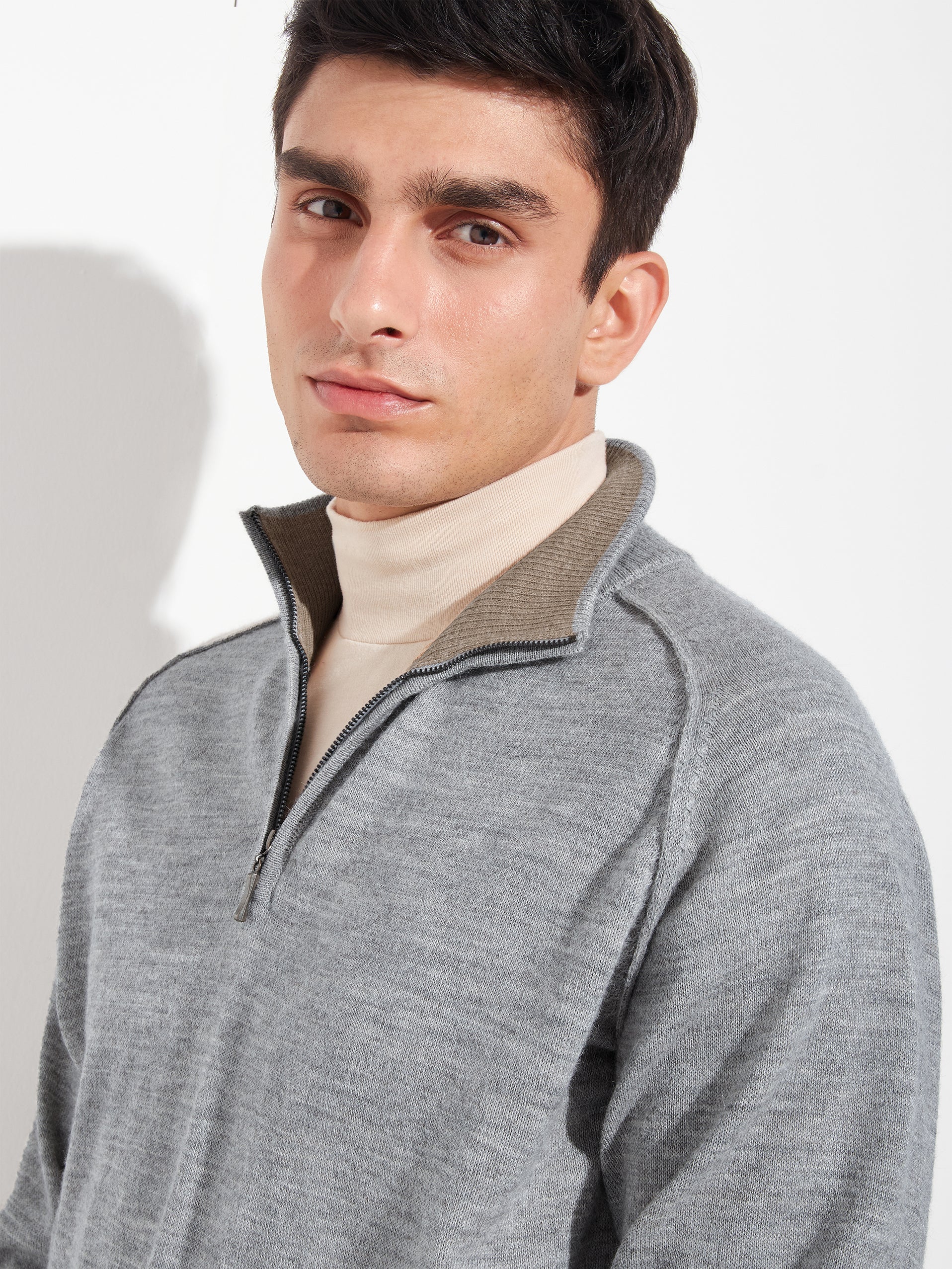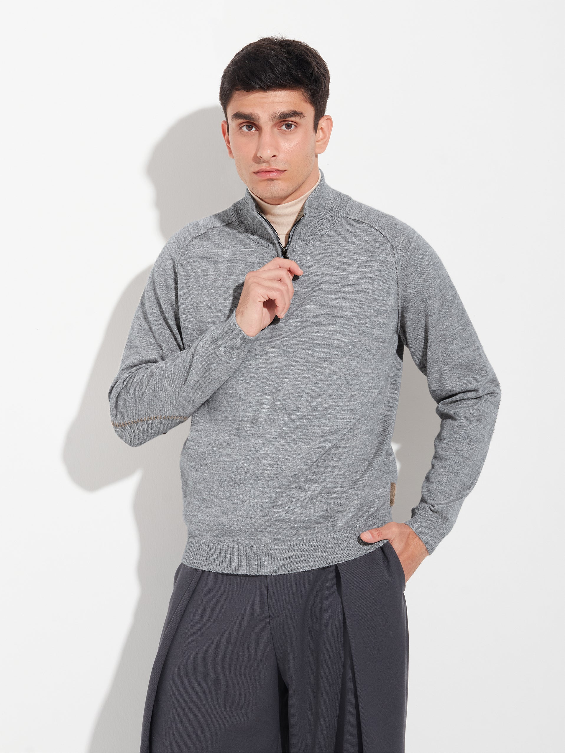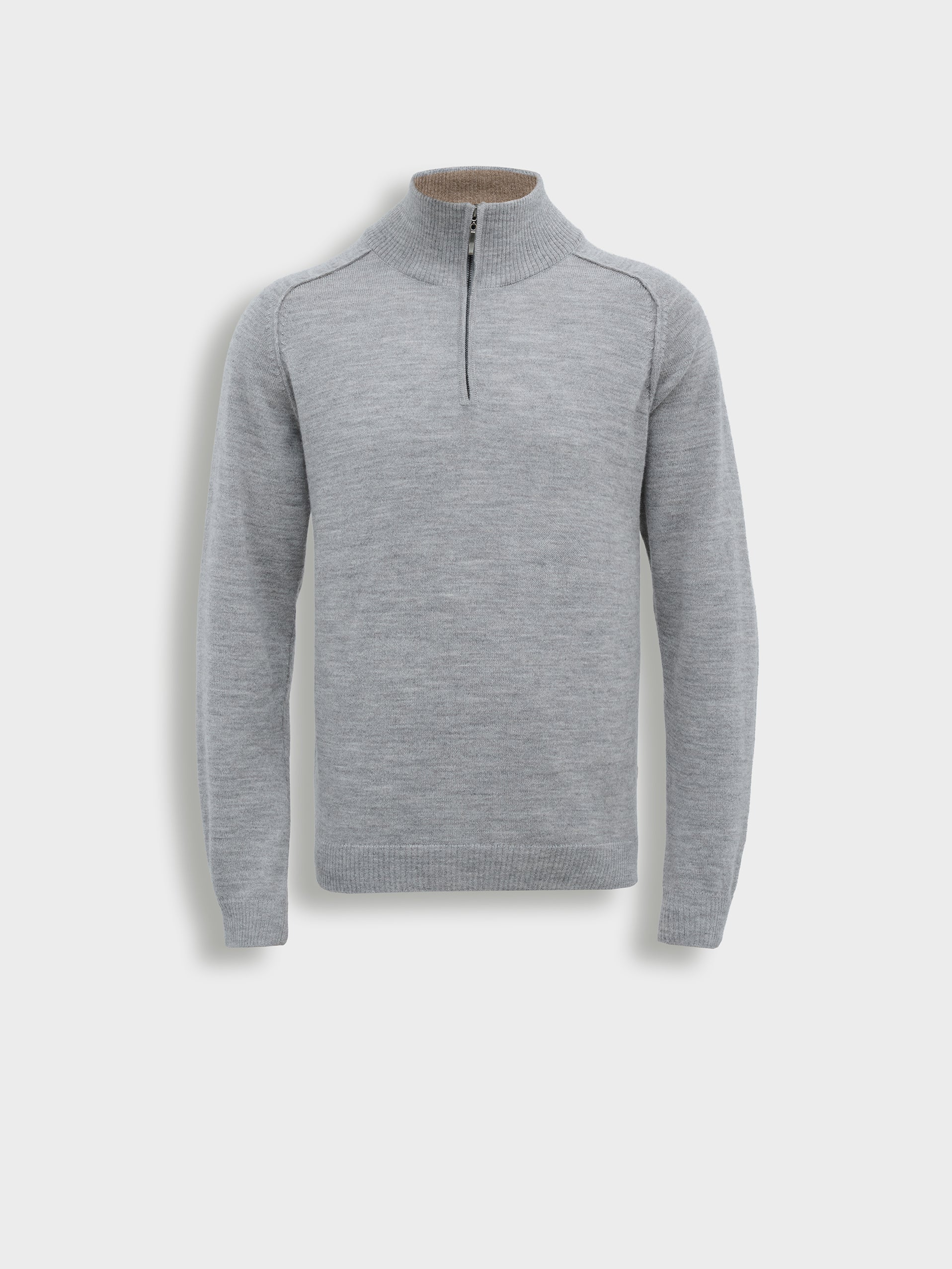 Suéter Bugatti en tonalidad gris, con cuello alto y cierre frontal. Confeccionado en 100% baby alpaca RAS y tejido en punto jersey. Presenta contraste de color en el interior del cuello y coderas integradas al tejido, que aportan un detalle funcional y distintivo. | Material predominante: Baby Alpaca