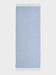 Estola Zabila en tonalidad celeste, elaborada en baby alpaca, seda y lino. Presenta líneas horizontales en panamá sobre fondo tafetán y acabado desflecado. Su textura ligera y su diseño rayado aportan un toque de distinción. | Material predominante: Lino