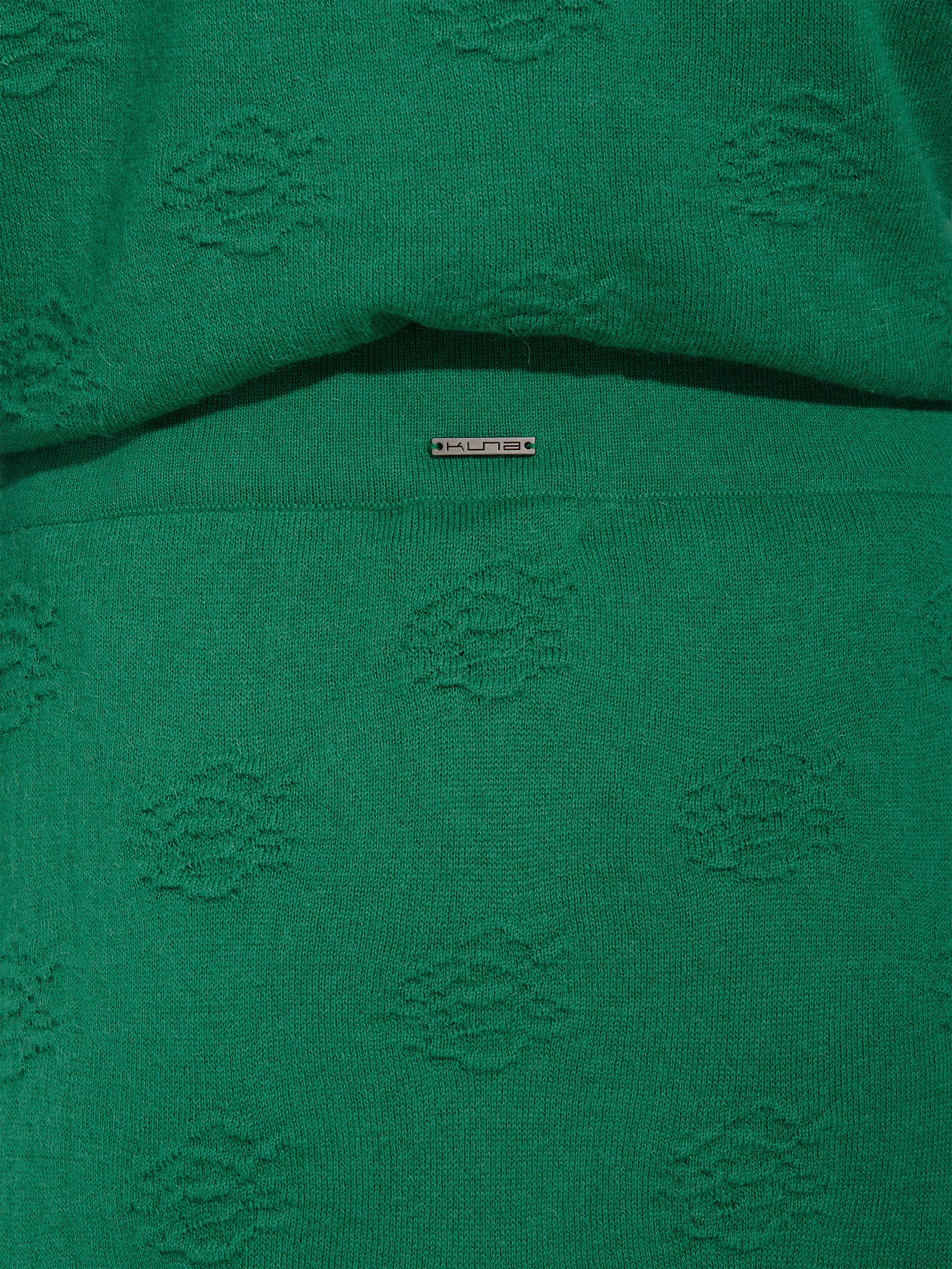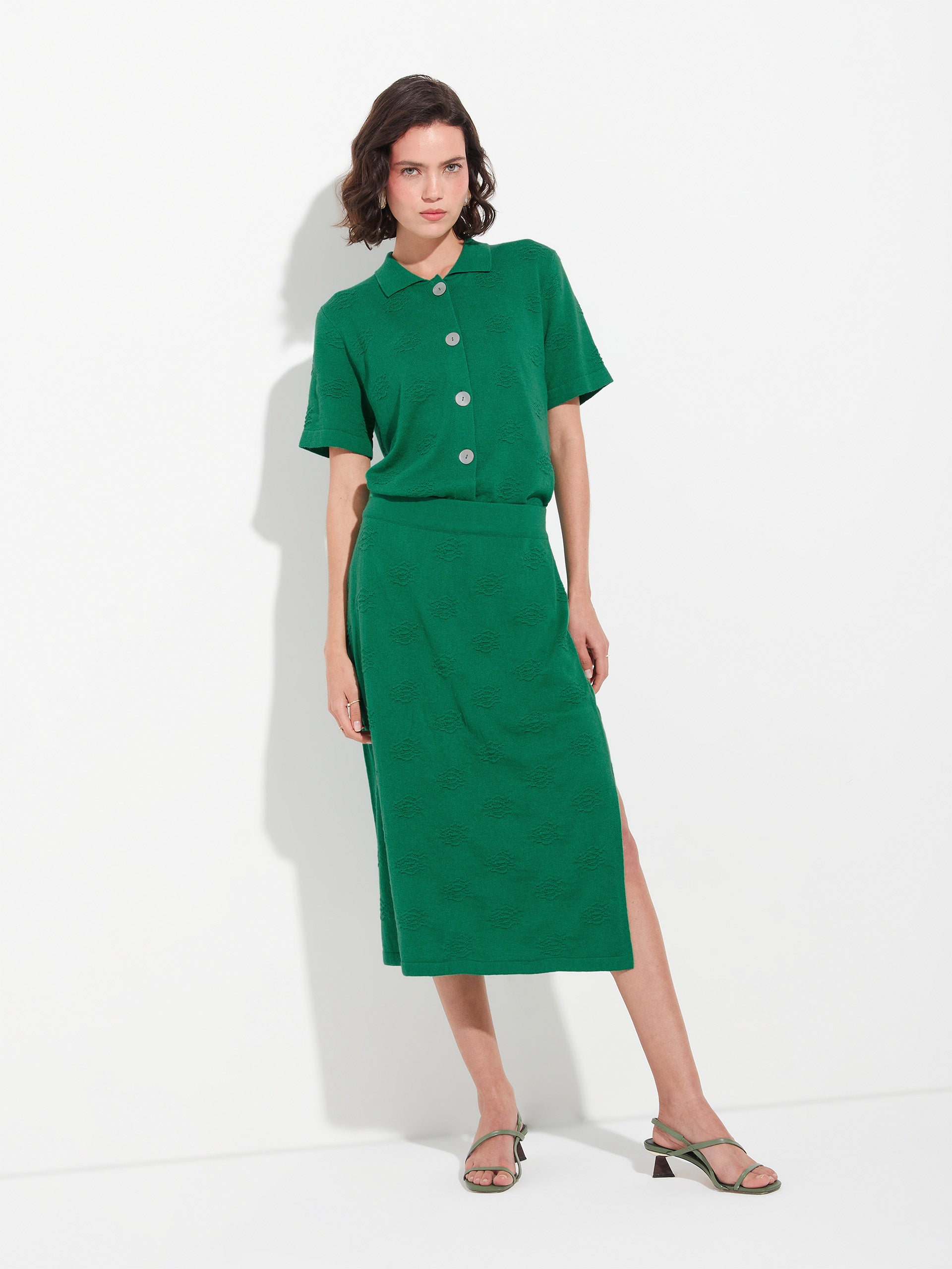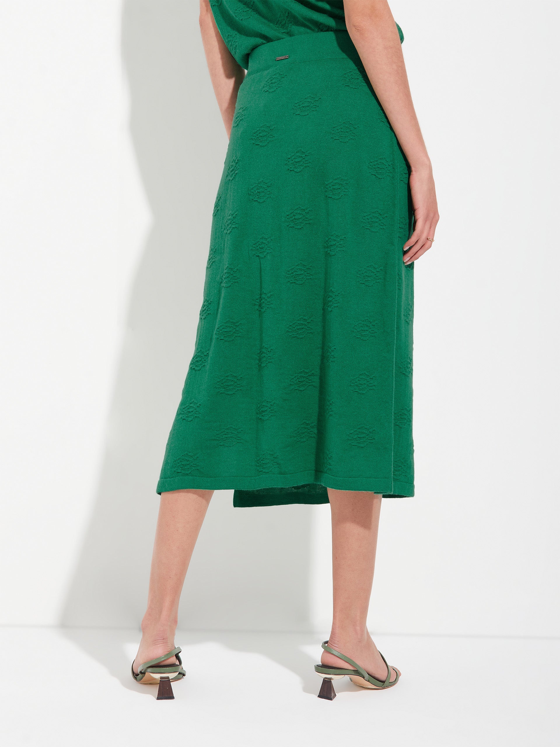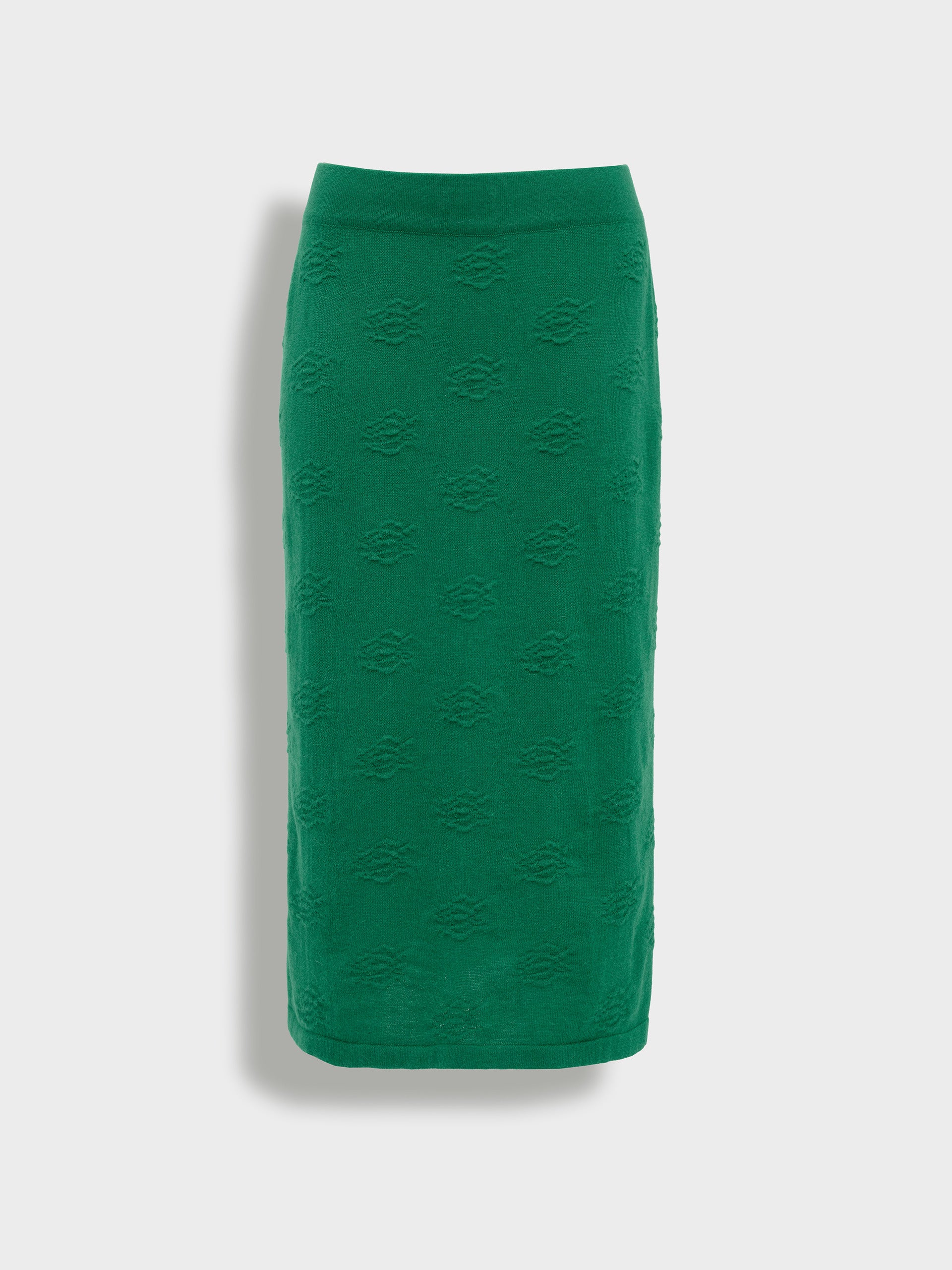 Falda Zabeth en tonalidad verde, confeccionada con algodón orgánico y baby alpaca. Es una falda tipo tubo de punto llano con un delicado recogido en forma de rosa bajo la cintura. Su diseño resalta la silueta con elegancia y suavidad. | Material predominante: Algodon