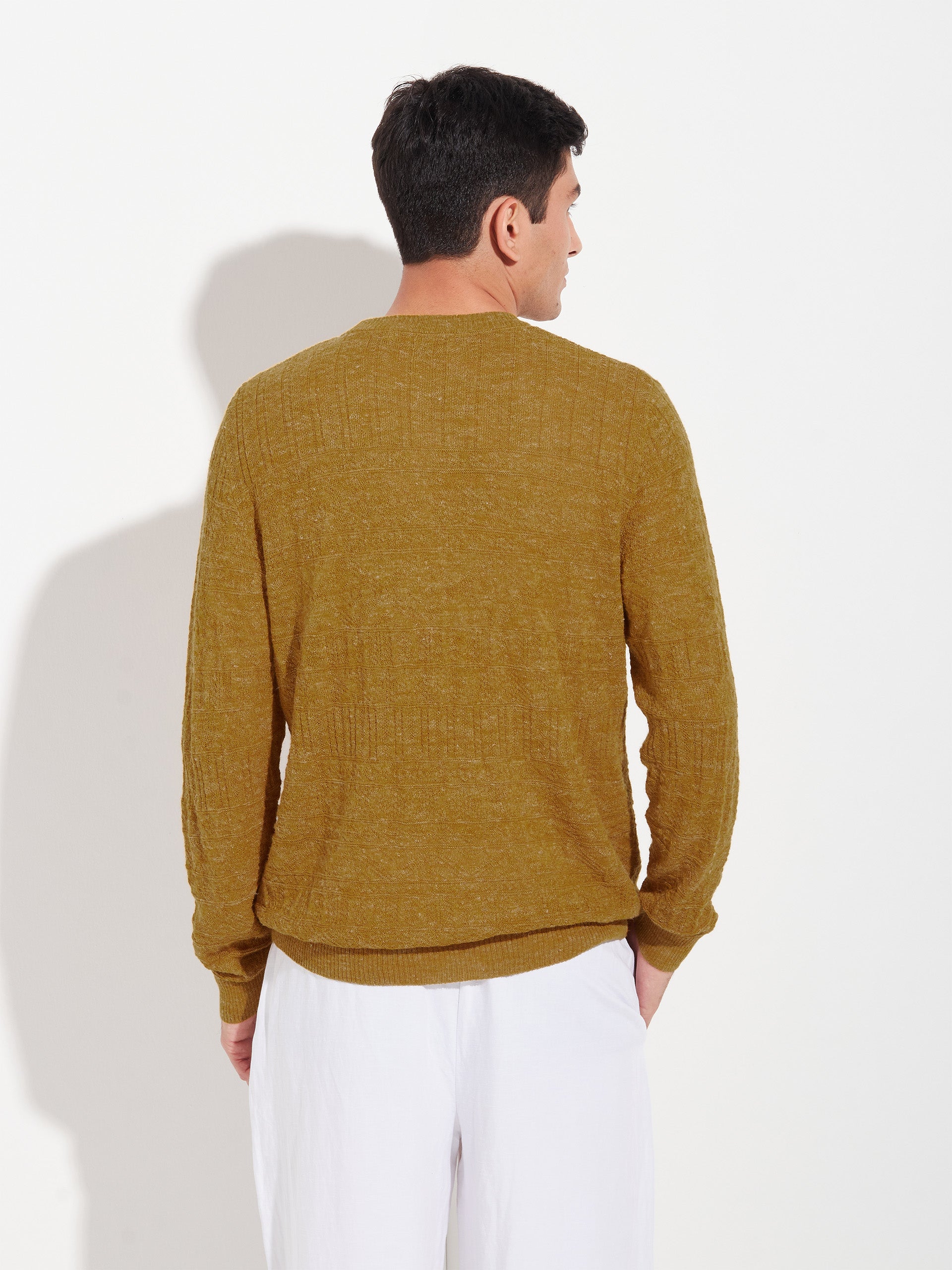 Suéter Zoom en tonalidad amarilla, confeccionado en una mezcla de baby alpaca y lino. Presenta cuello redondo y un punto estructurado en el reverso y derecho, que aporta textura y un acabado refinado. Ideal para un look sofisticado y confortable.. | Material predominante: Baby Alpaca