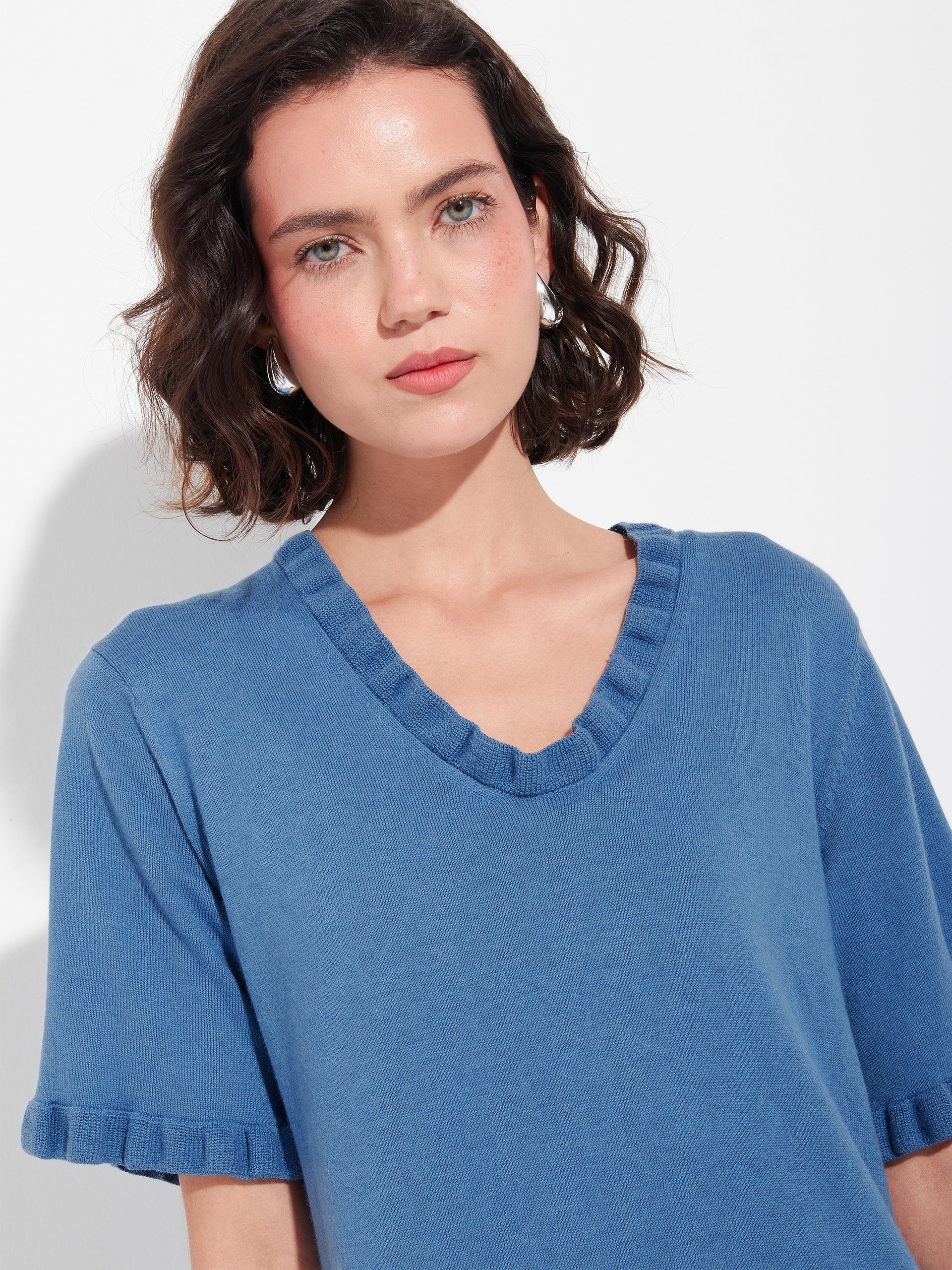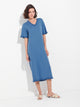 Vestido Zabrina en tonalidad azul, confeccionado con una mezcla de algodón orgánico y baby alpaca. Presenta punto llano con abertura y bolsillos, ofreciendo una textura suave y un diseño cómodo de estilo moderno y natural. | Material predominante: Algodon