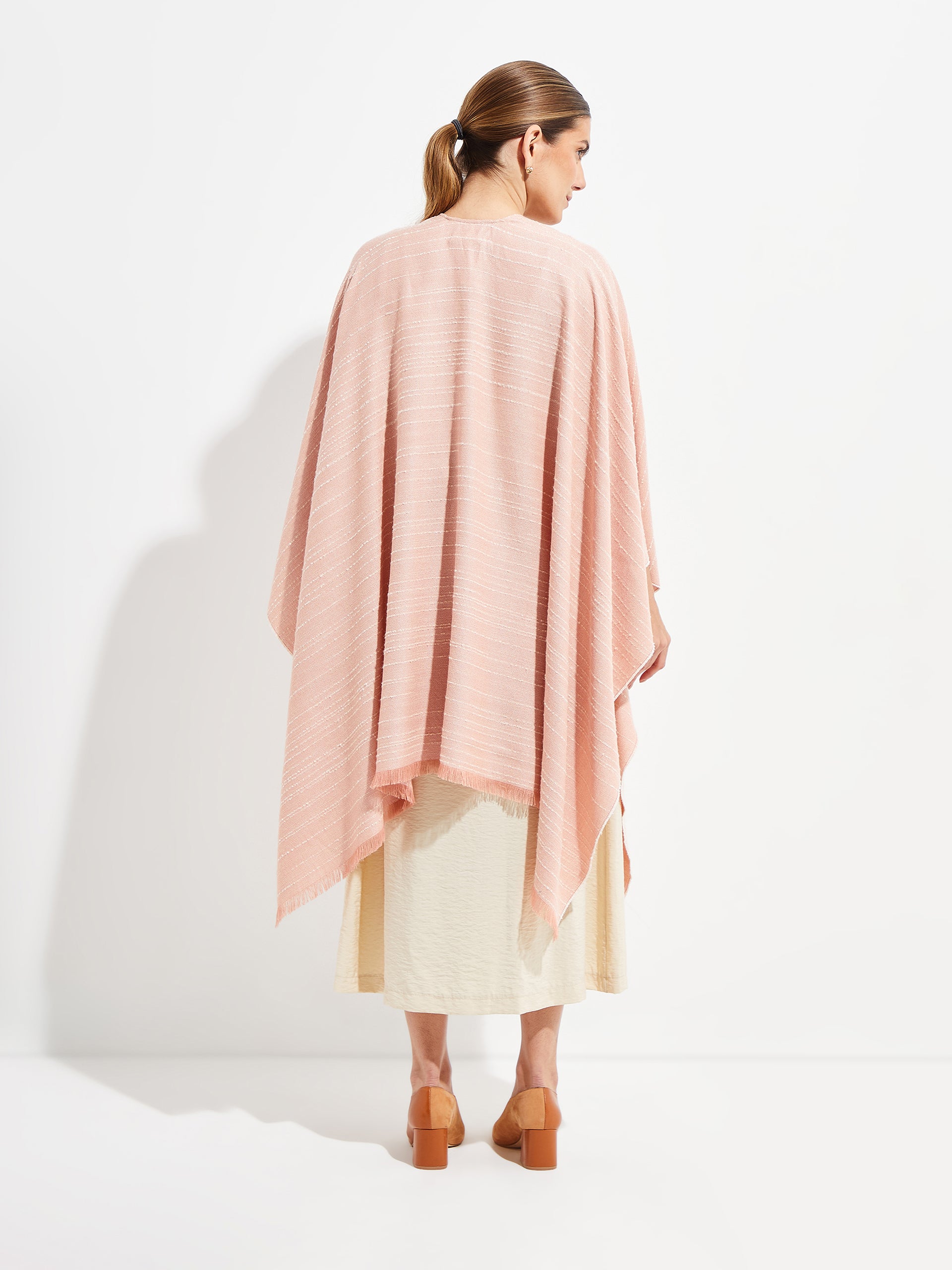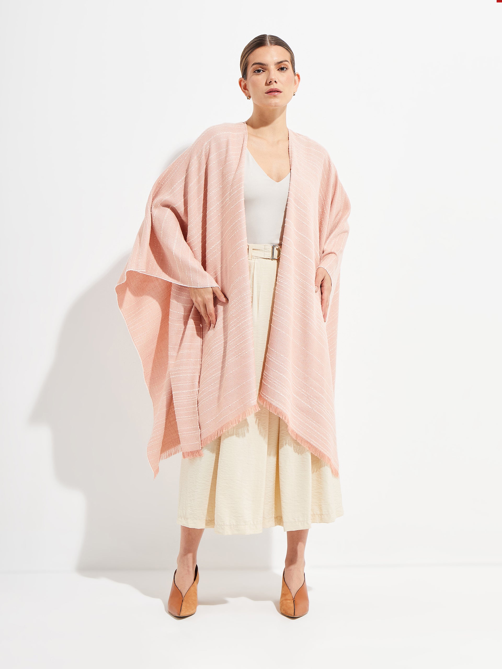 Ygriega is an exclusive cape made of baby alpaca, silk, bamboo and cotton. Its discreet striped design combines elegance and softness, offering a perfect balance between warmth and lightness. The mix of materials provides comfort and freshness, making it ideal for special occasions or everyday wear with a sophisticated touch. | Predominant material: Cotton