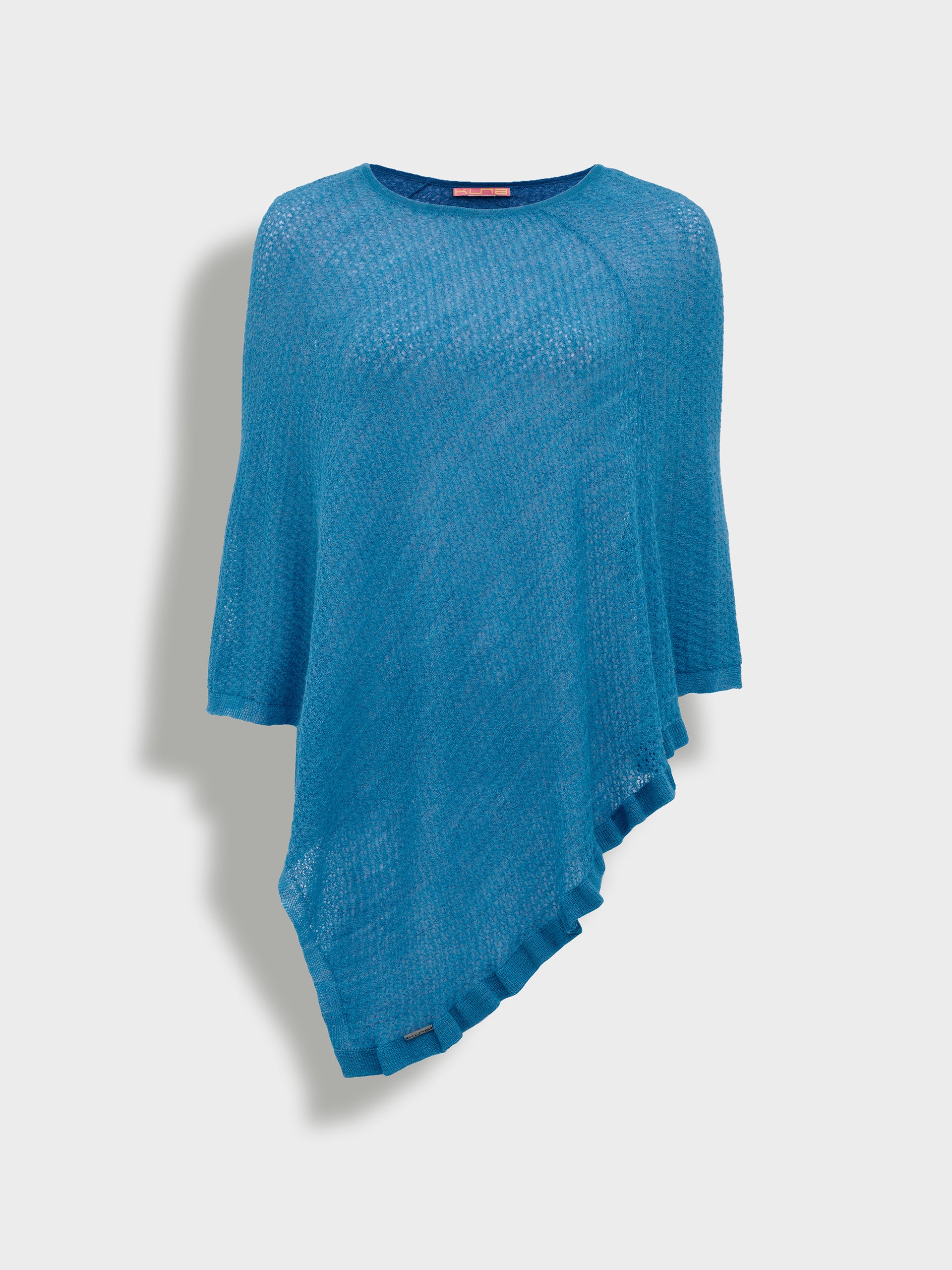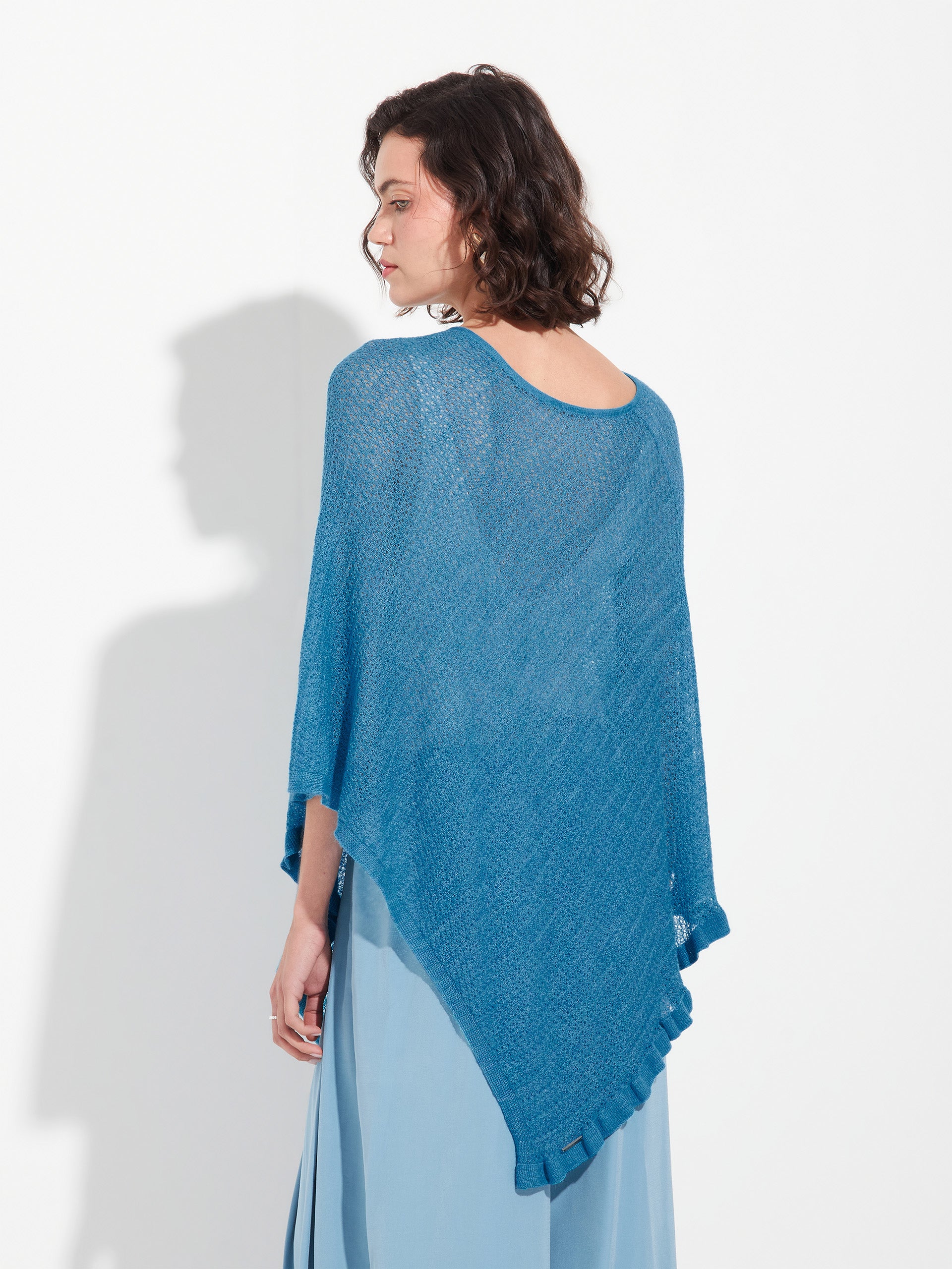 Capa Punto Zaeta en tonalidad azul, elaborada en baby alpaca y seda. Es un poncho cerrado con delicados detalles de volantes que añaden movimiento y feminidad a su diseño. | Material predominante: Baby Alpaca