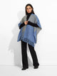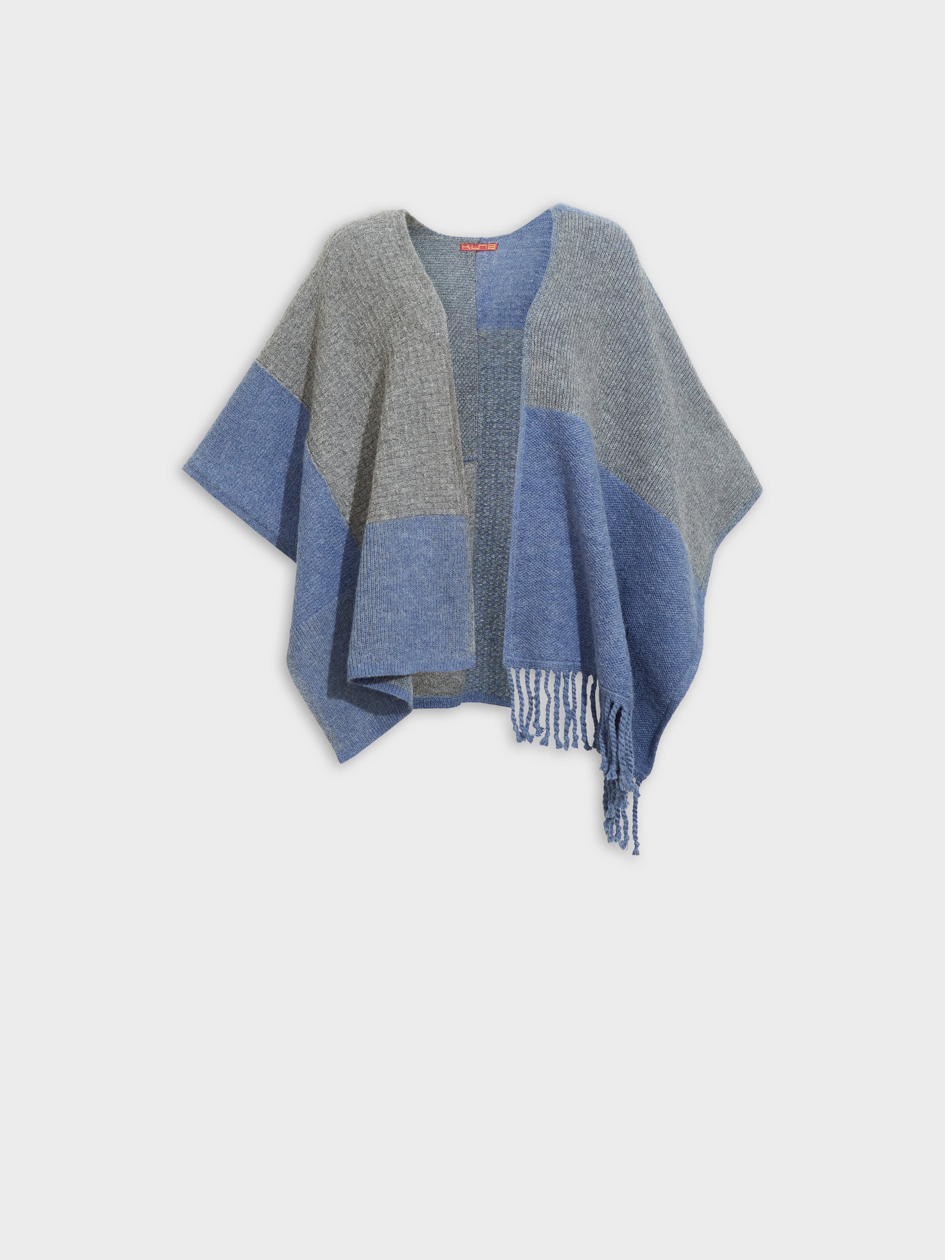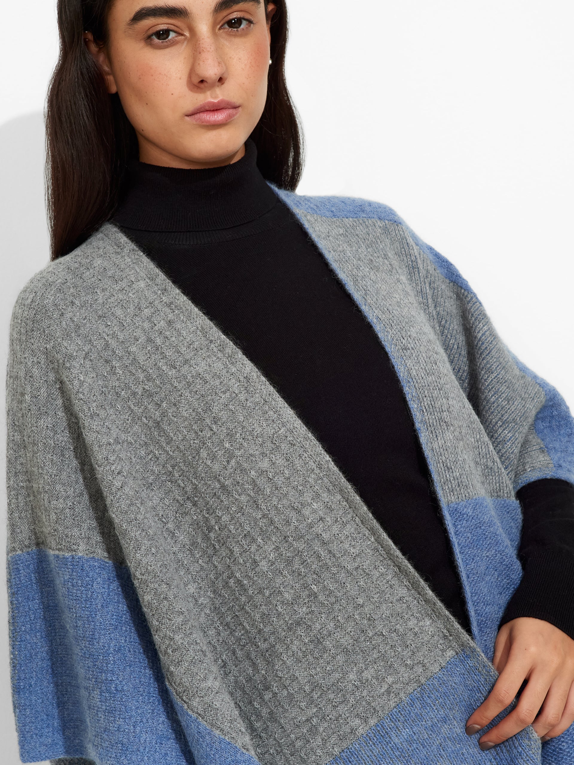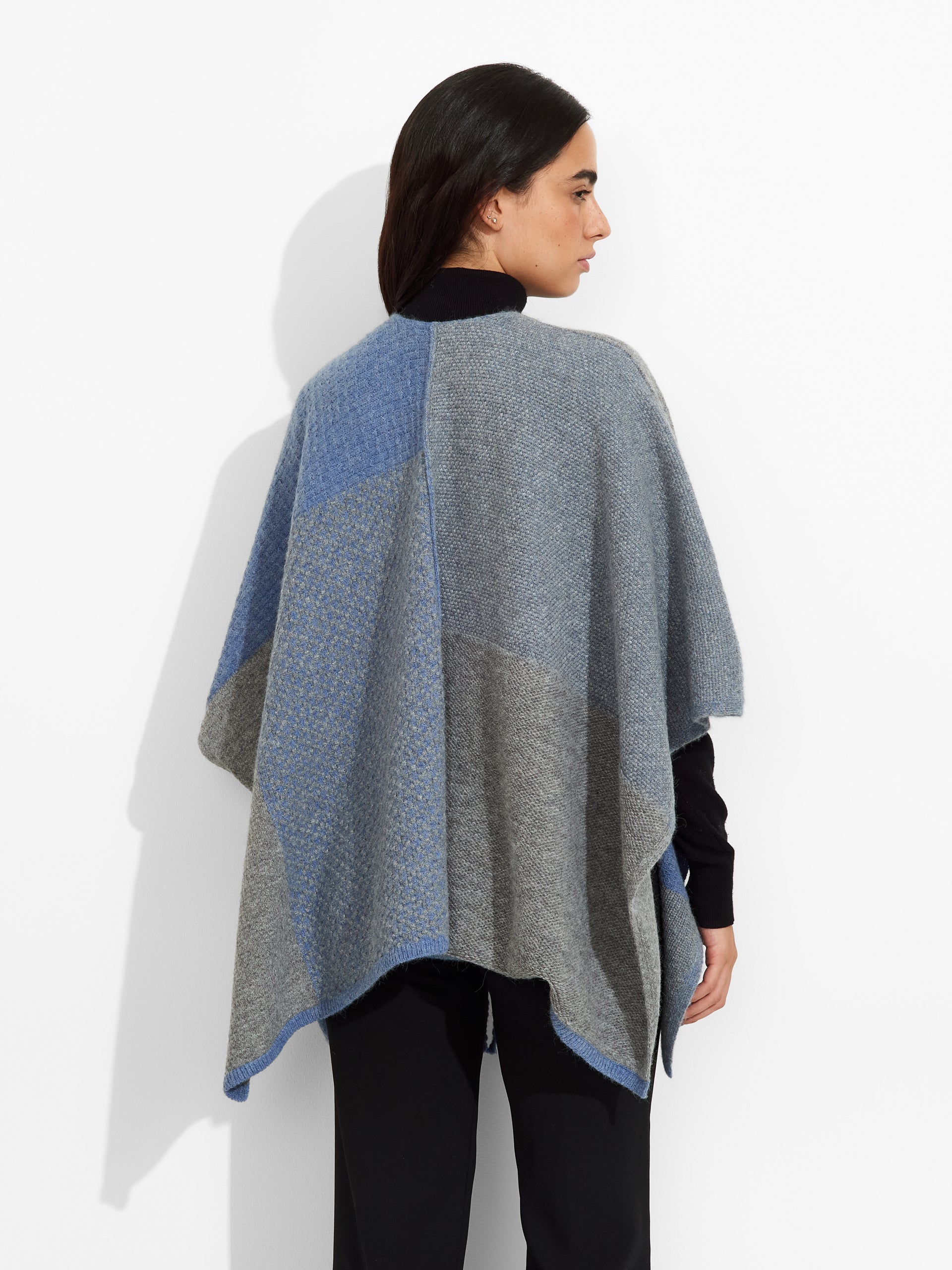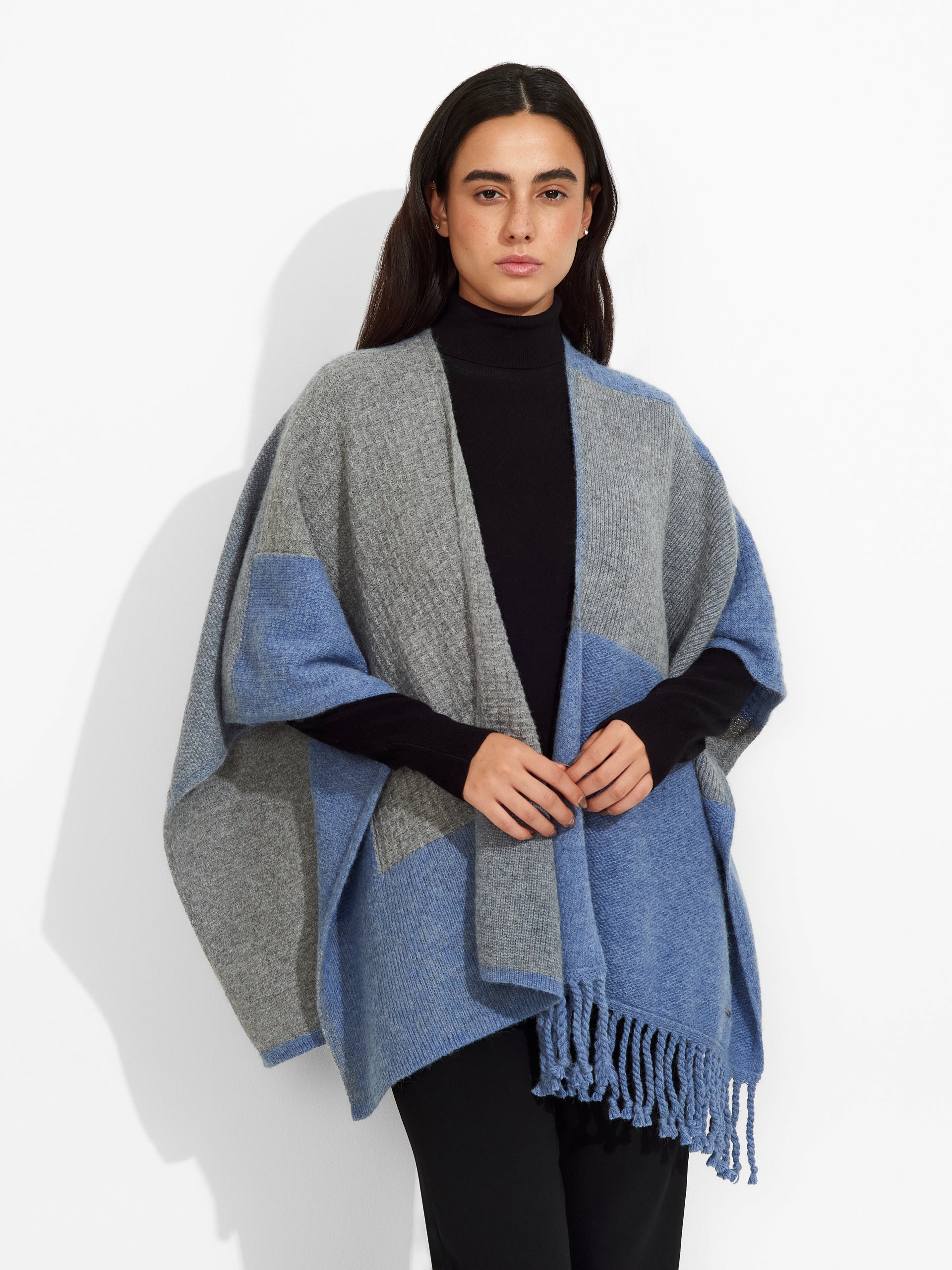 Poncho Zela en tonalidad celeste, de diseño abierto, presenta un patrón de formas geométricas y detalles de flecos en uno de los extremos. Confeccionado en baby alpaca, brinda calidez y suavidad. | Material predominante: Baby Alpaca