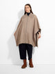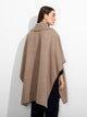Capa Zendaya en tonalidad marrón, con cierre metálico al frente y cuello aplicado. Presenta un tejido en medio inglés y bordes con acabado orlado. Confeccionada en baby alpaca, lana y nylon. | Material predominante: Baby Alpaca