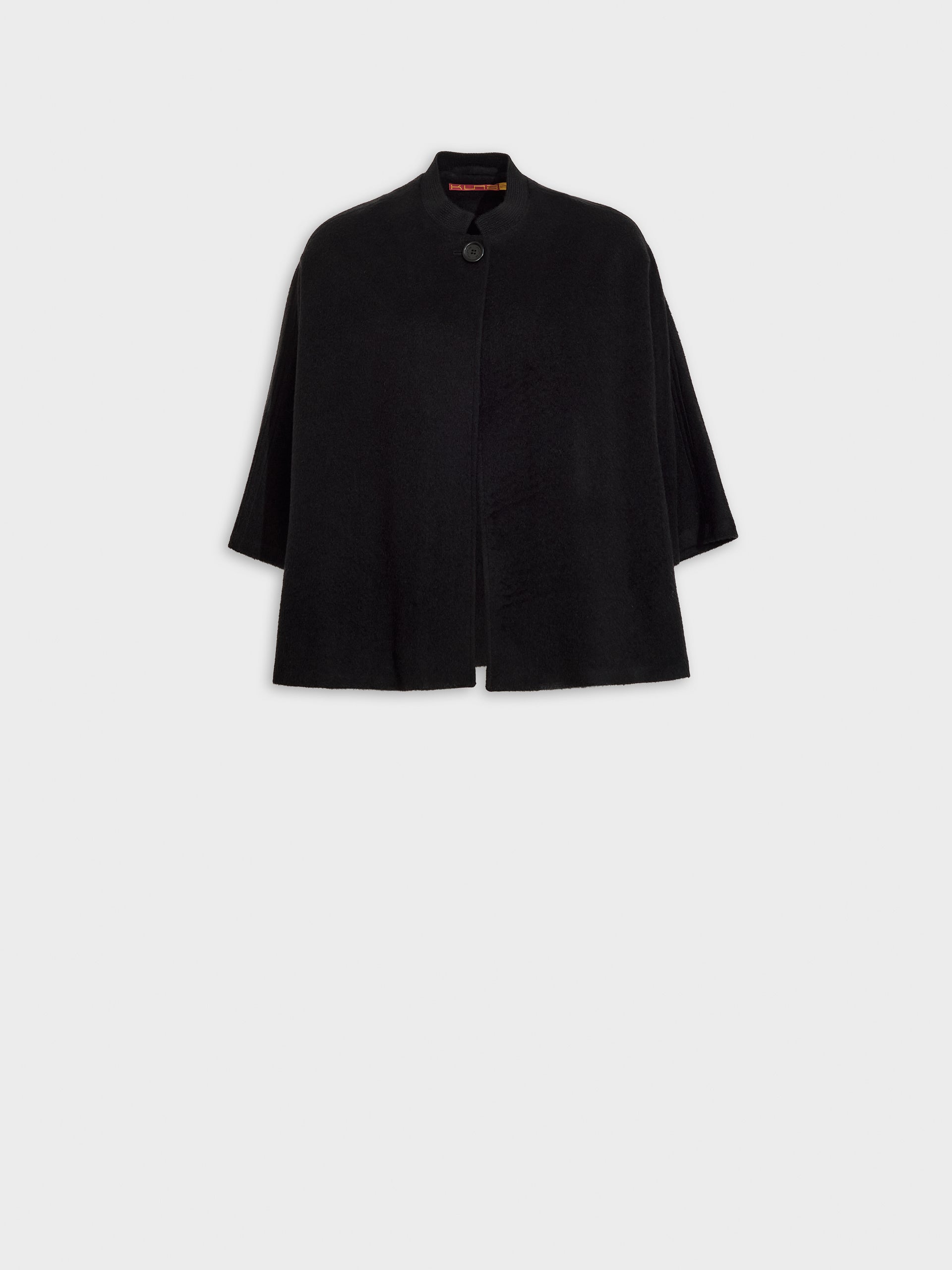 Capa Zenzolin en tonalidad negro, diseñada en color entero con cuello neru y un solo botón de cacho en la parte superior como cierre, tejido en punto milano. Confeccionada en una mezcla de baby alpaca y lana. | Material predominante: Baby Alpaca