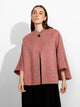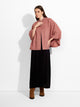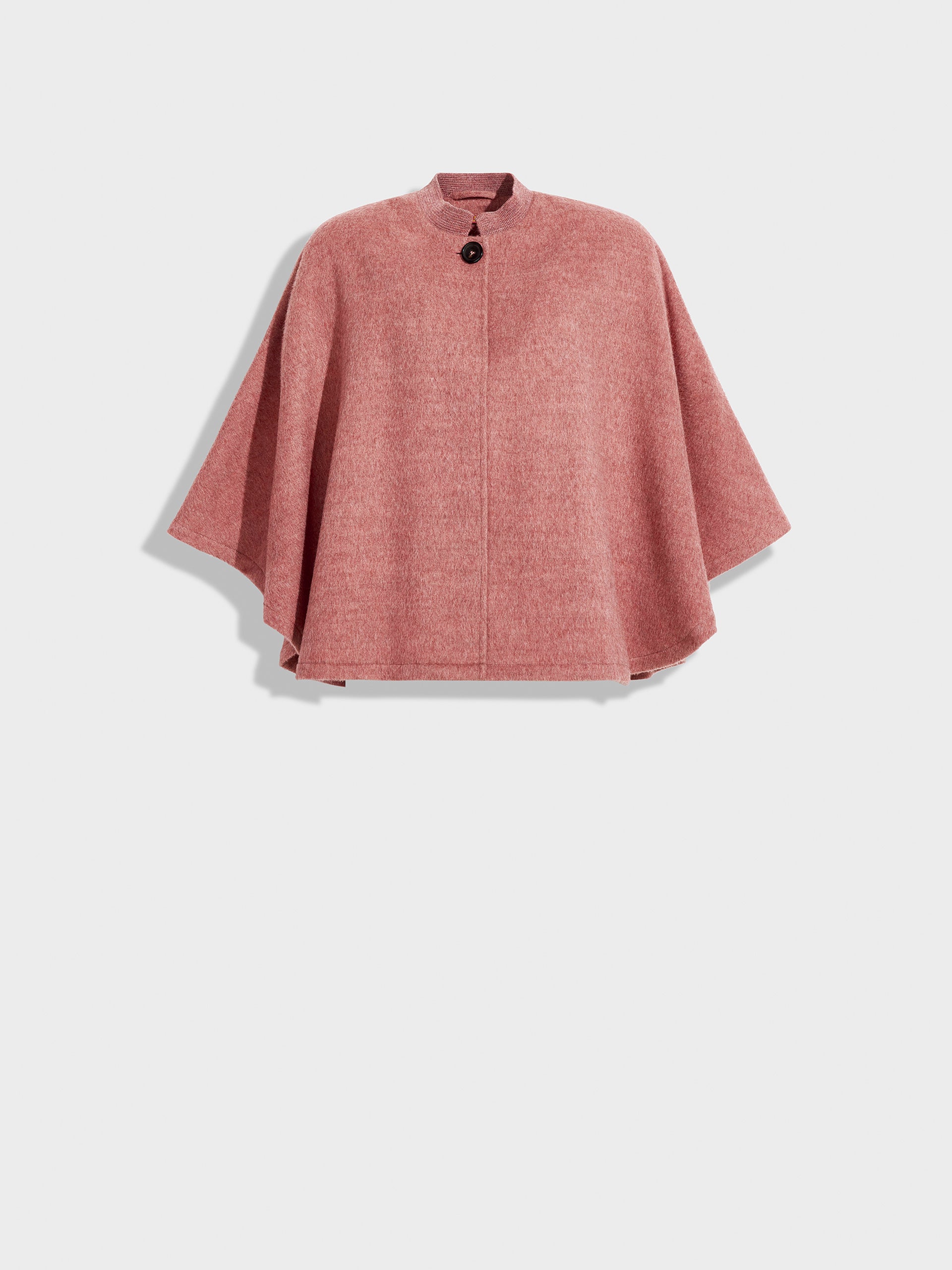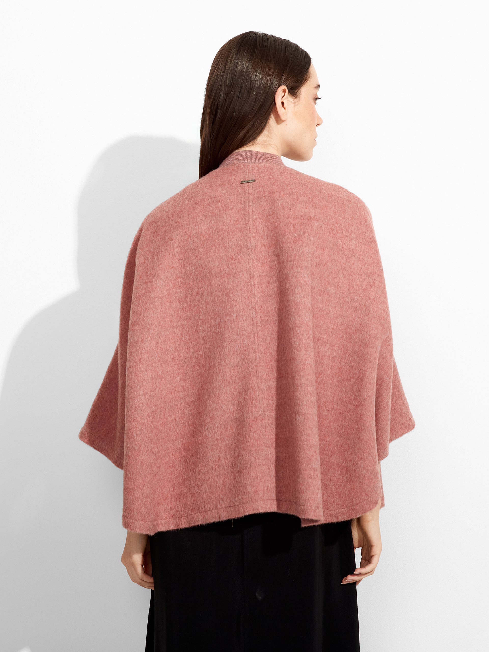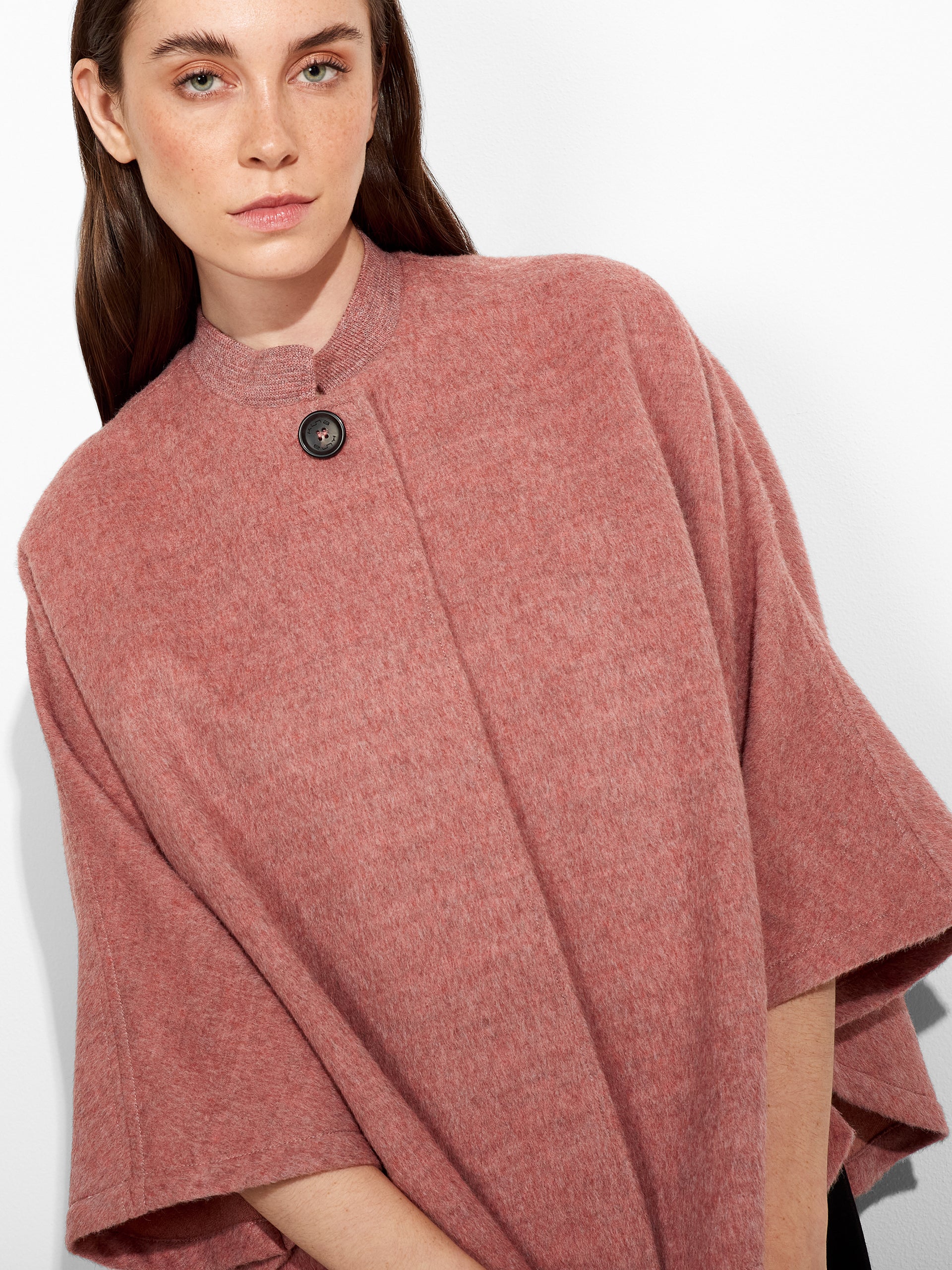 Capa Zenzolin en tonalidad rosado, diseñada en color entero con cuello neru y un solo botón de cacho en la parte superior como cierre, tejido en punto milano. Confeccionada en una mezcla de baby alpaca y lana. | Material predominante: Baby Alpaca