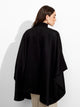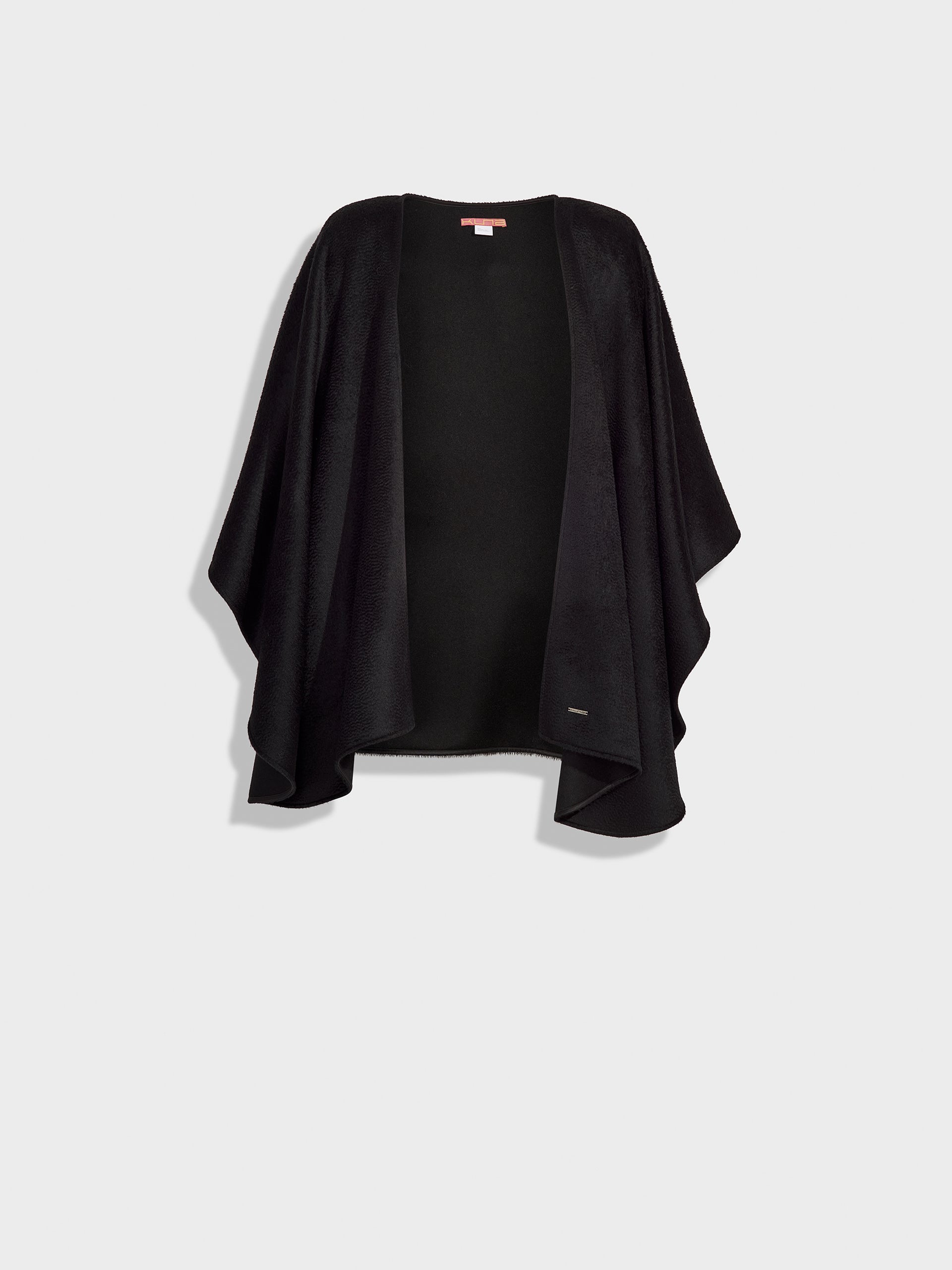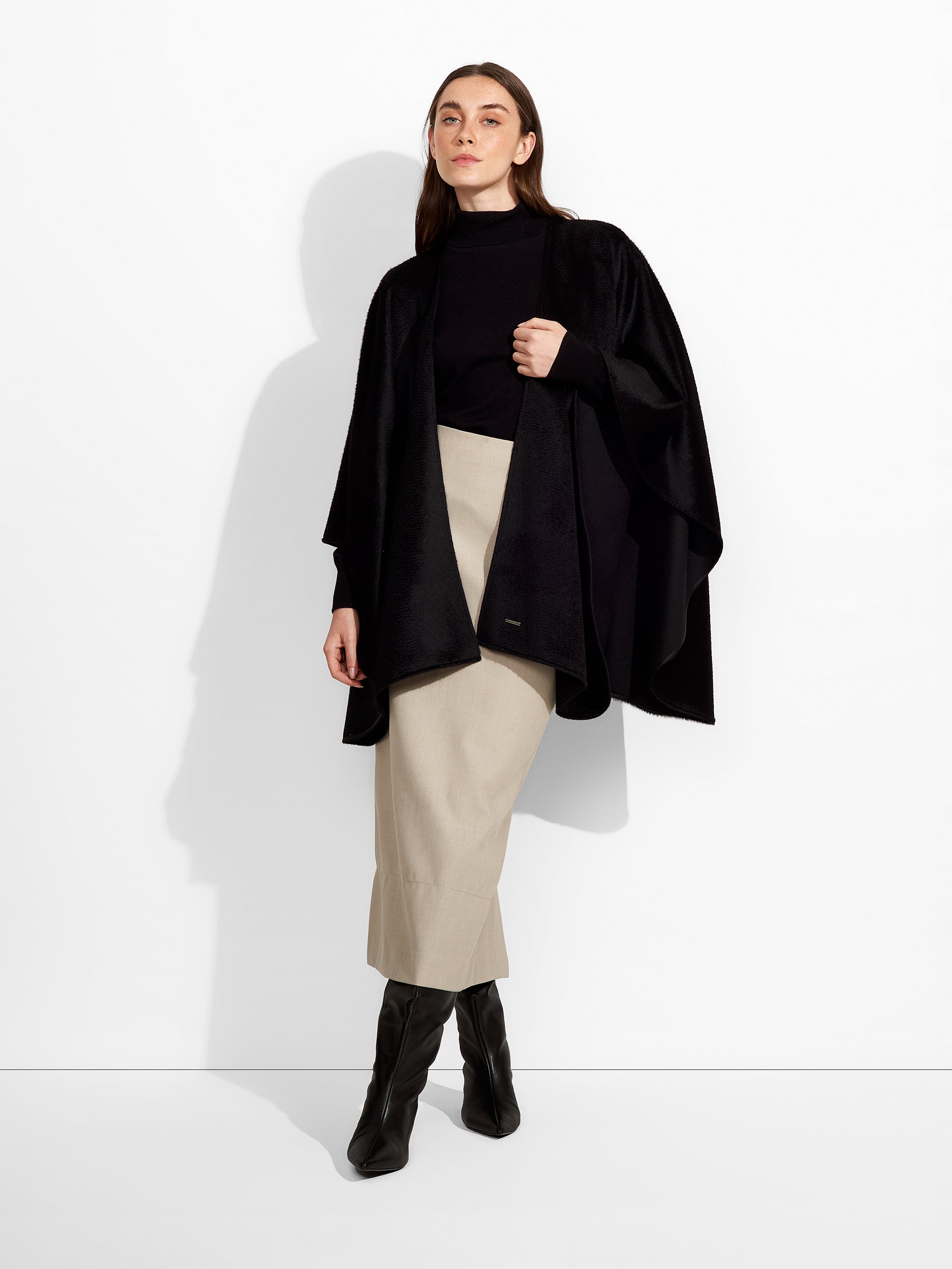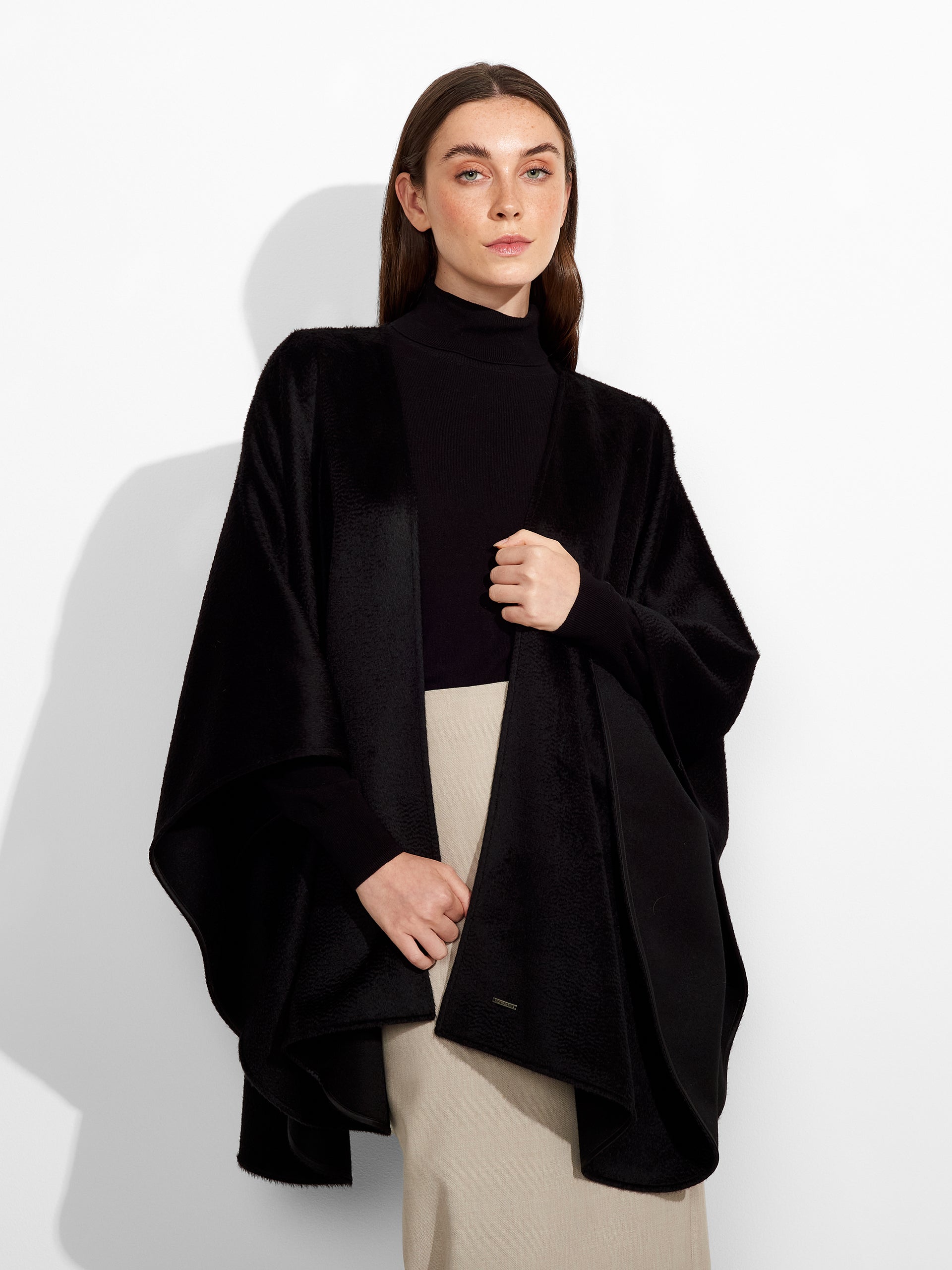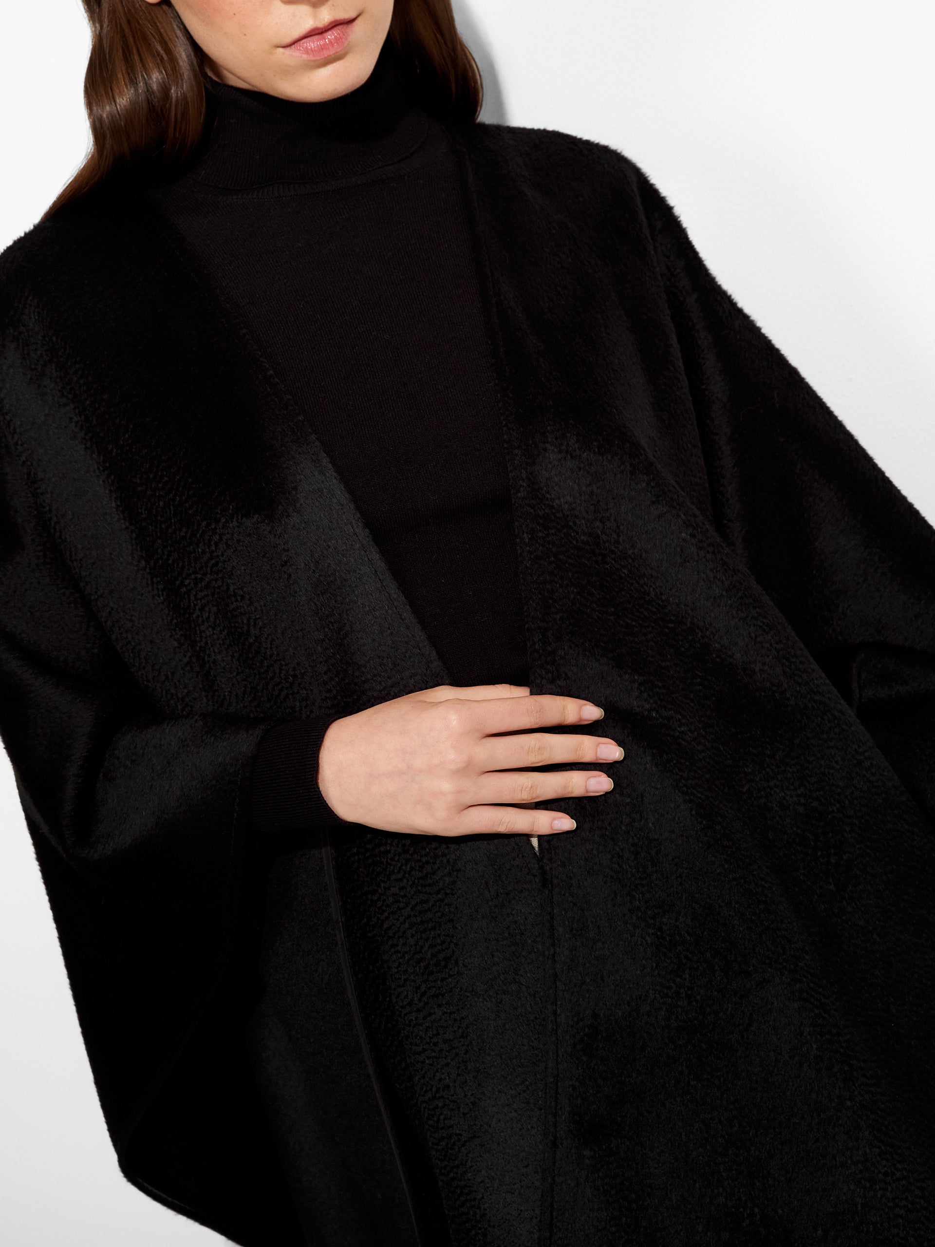 Capa Zibelin en tonalidad negro, de diseño abierto y silueta envolvente. Confeccionada en una mezcla de baby suri alpaca y lana, destaca por su textura suave que aporta calidez. | Material predominante: Baby Suri Alpaca