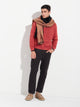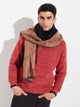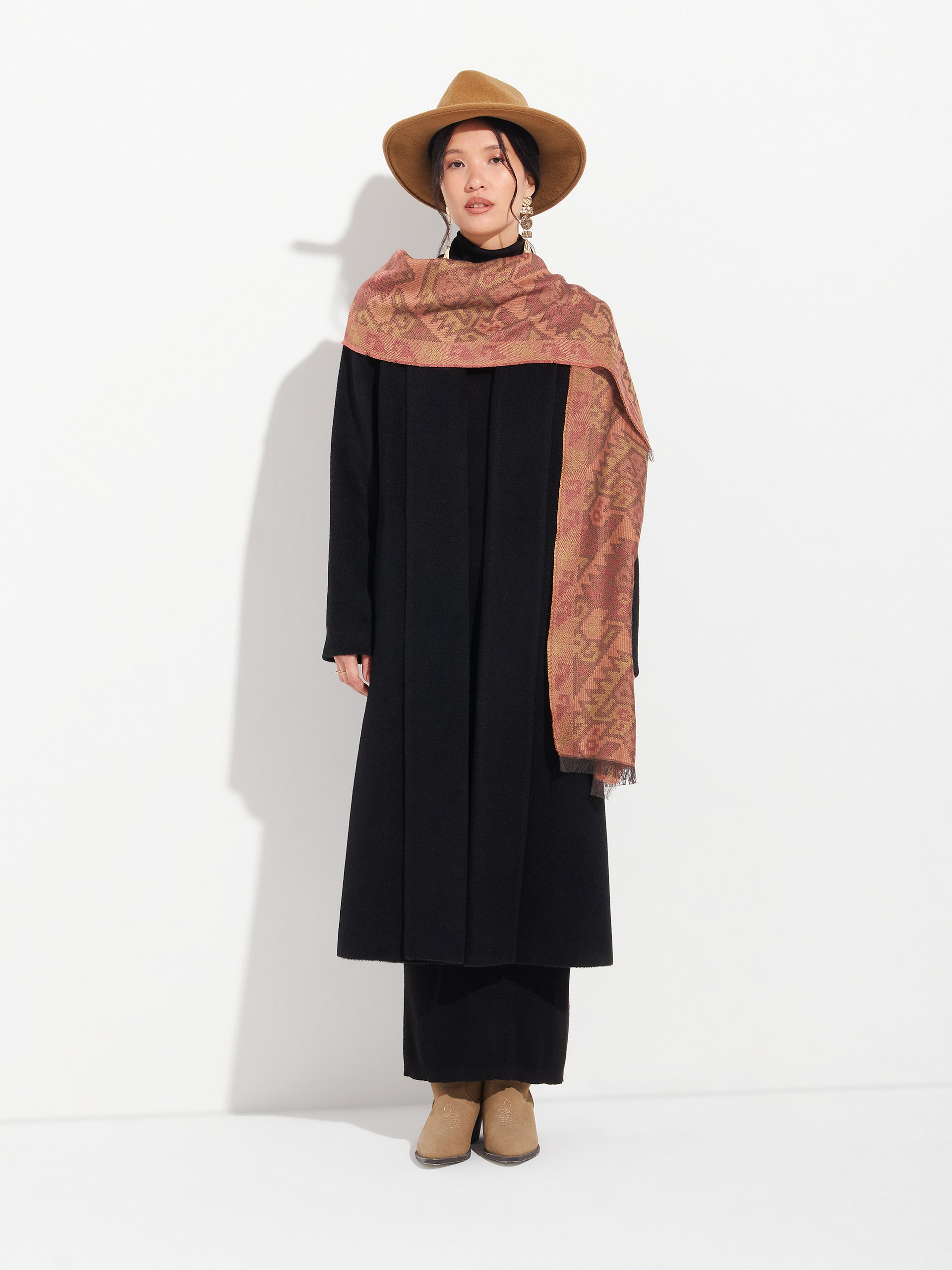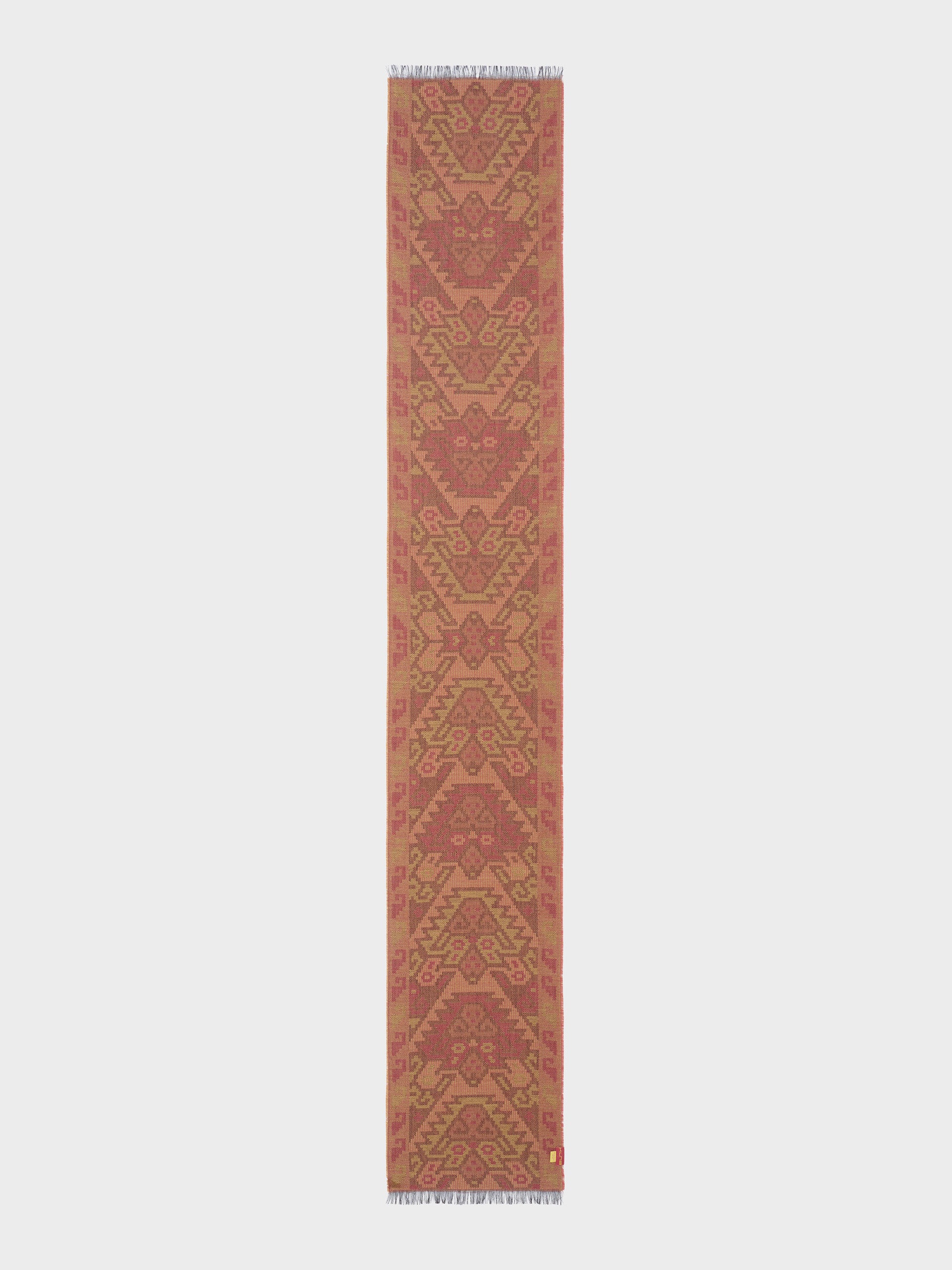 Chalina Chancay 38 en tonalidad naranja, elaborada en 70% baby alpaca y 30% seda, con técnica Jacquard en doble cara. Con una medida de 200/196 x 30 cm, es un accesorio unisex y reversible, inspirado en la Cultura Chancay, que conecta con la memoria ancestral a través de un diseño auténticamente cultural. | Material predominante: Baby Alpaca