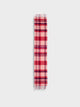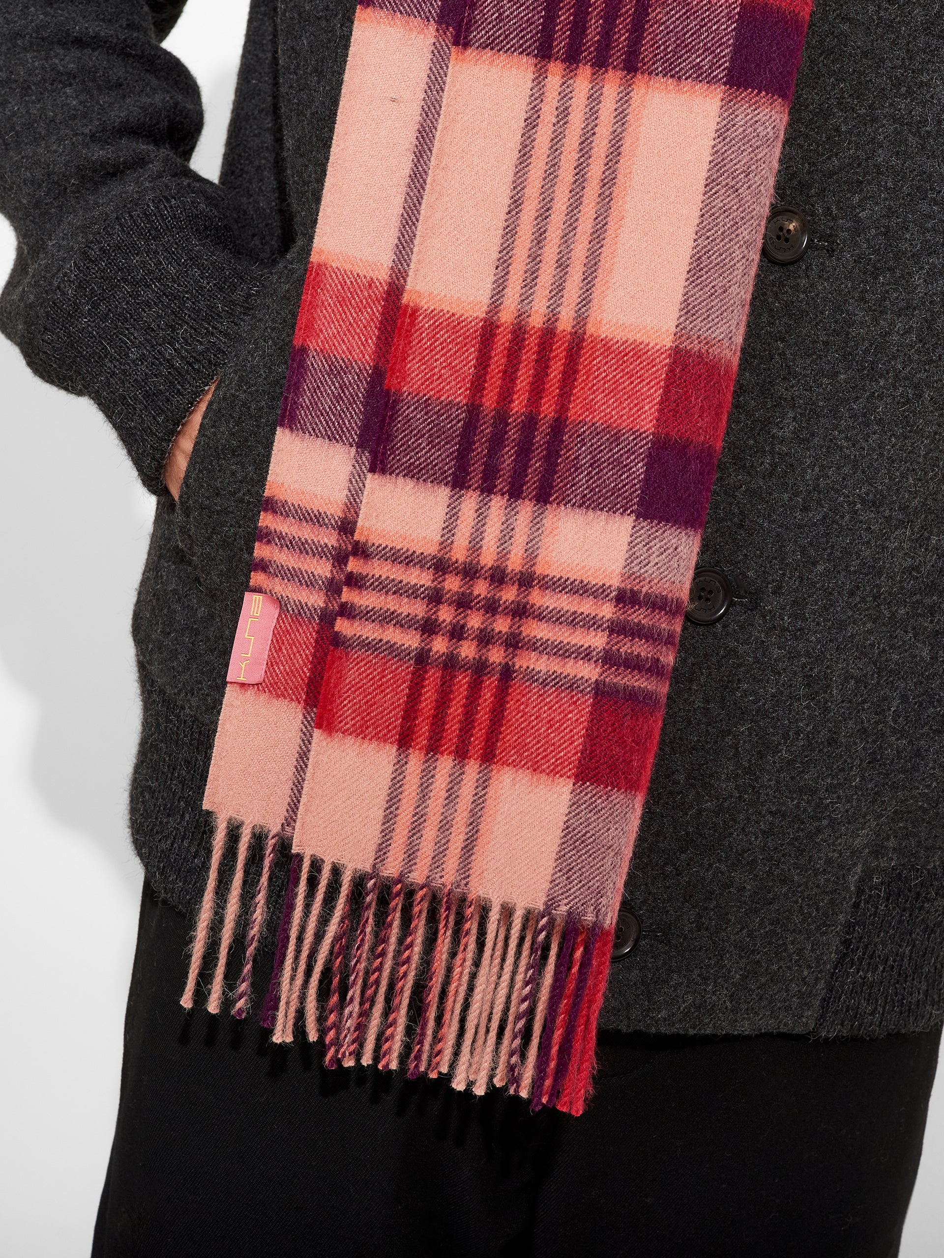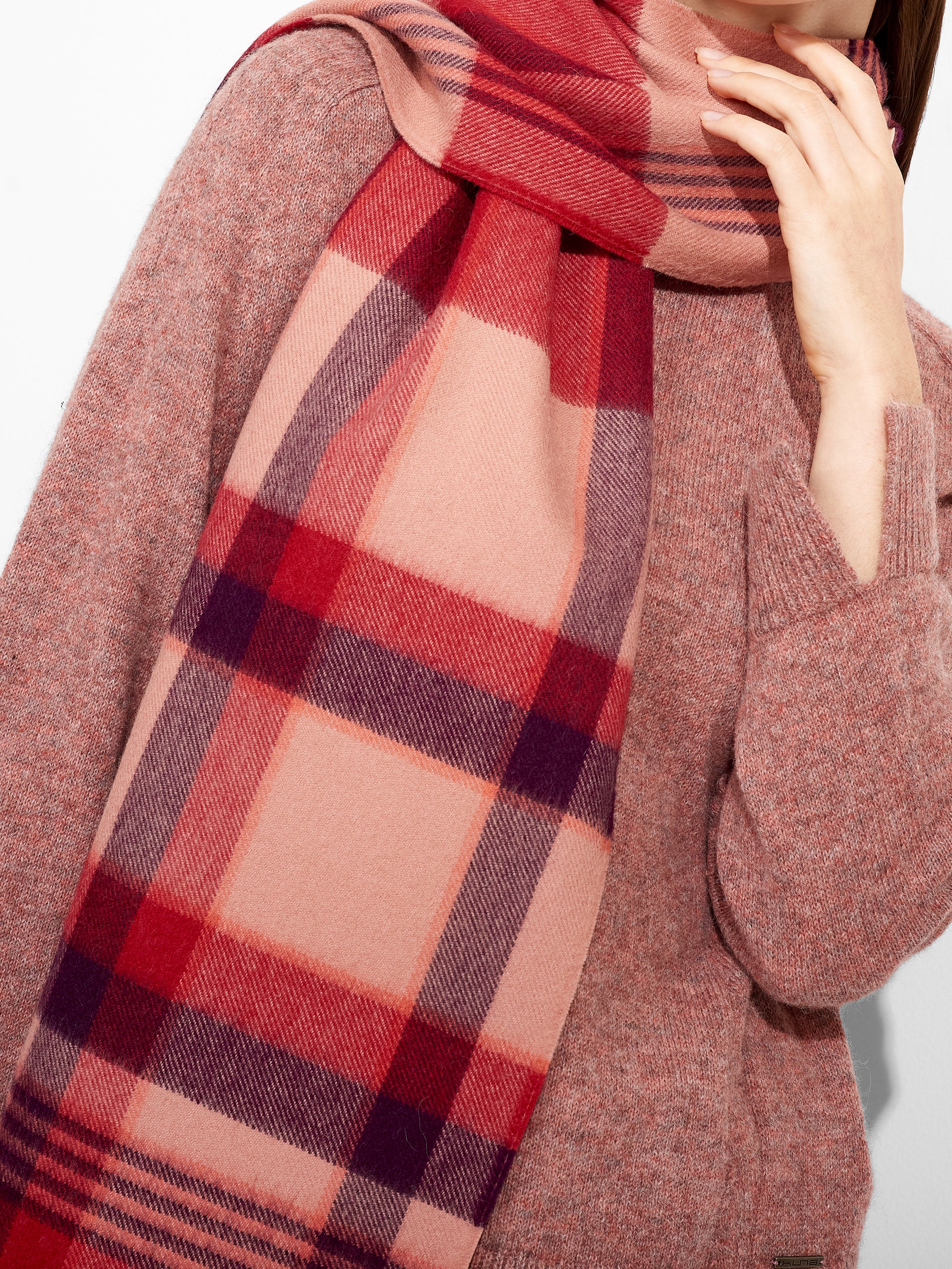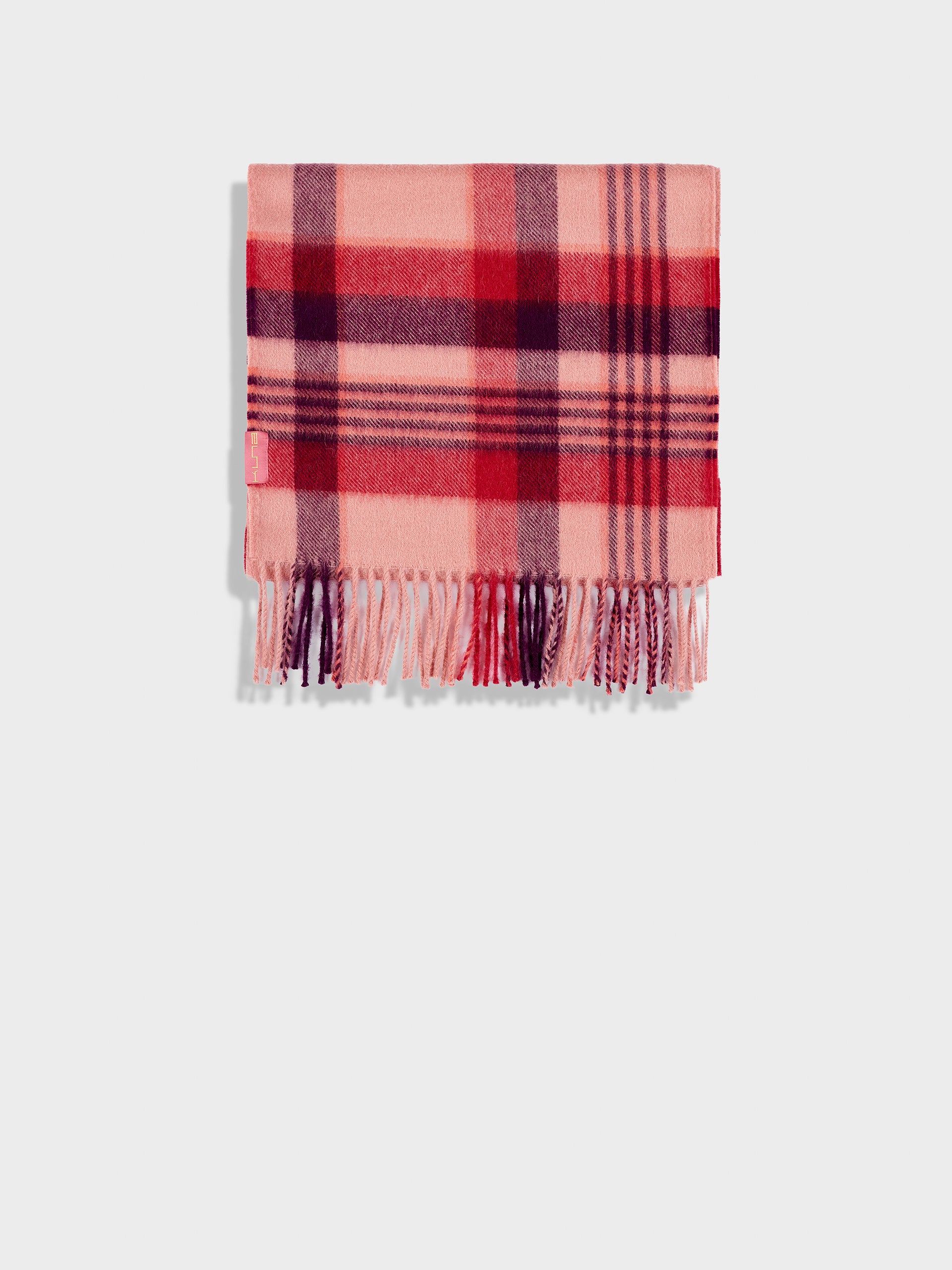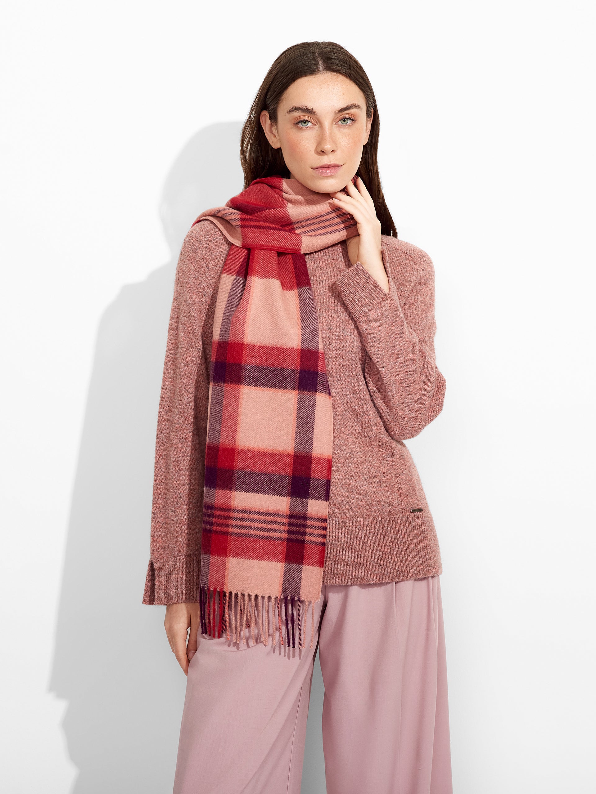 Chalina Ratti en tonalidad rosado, con diseño de patrón de cuadros. Los bordes con flecos añaden movimiento y textura. Confeccionada en baby alpaca, destaca por su calidez y suavidad. | Material predominante: Baby Alpaca