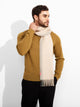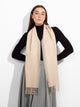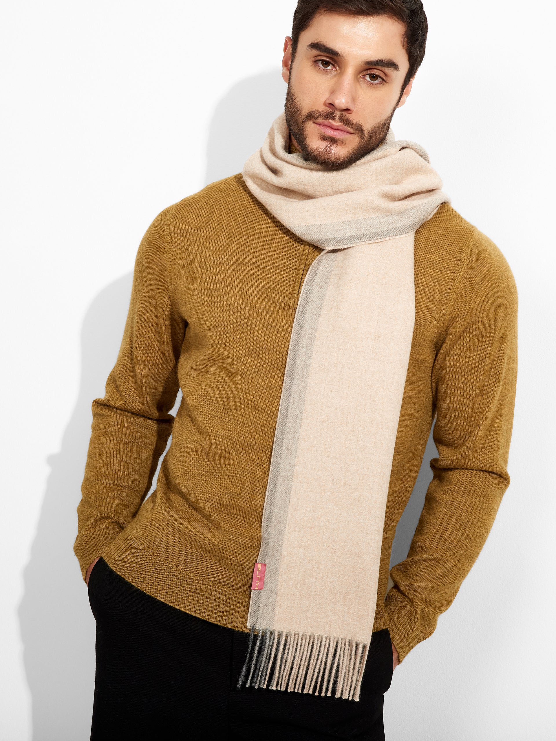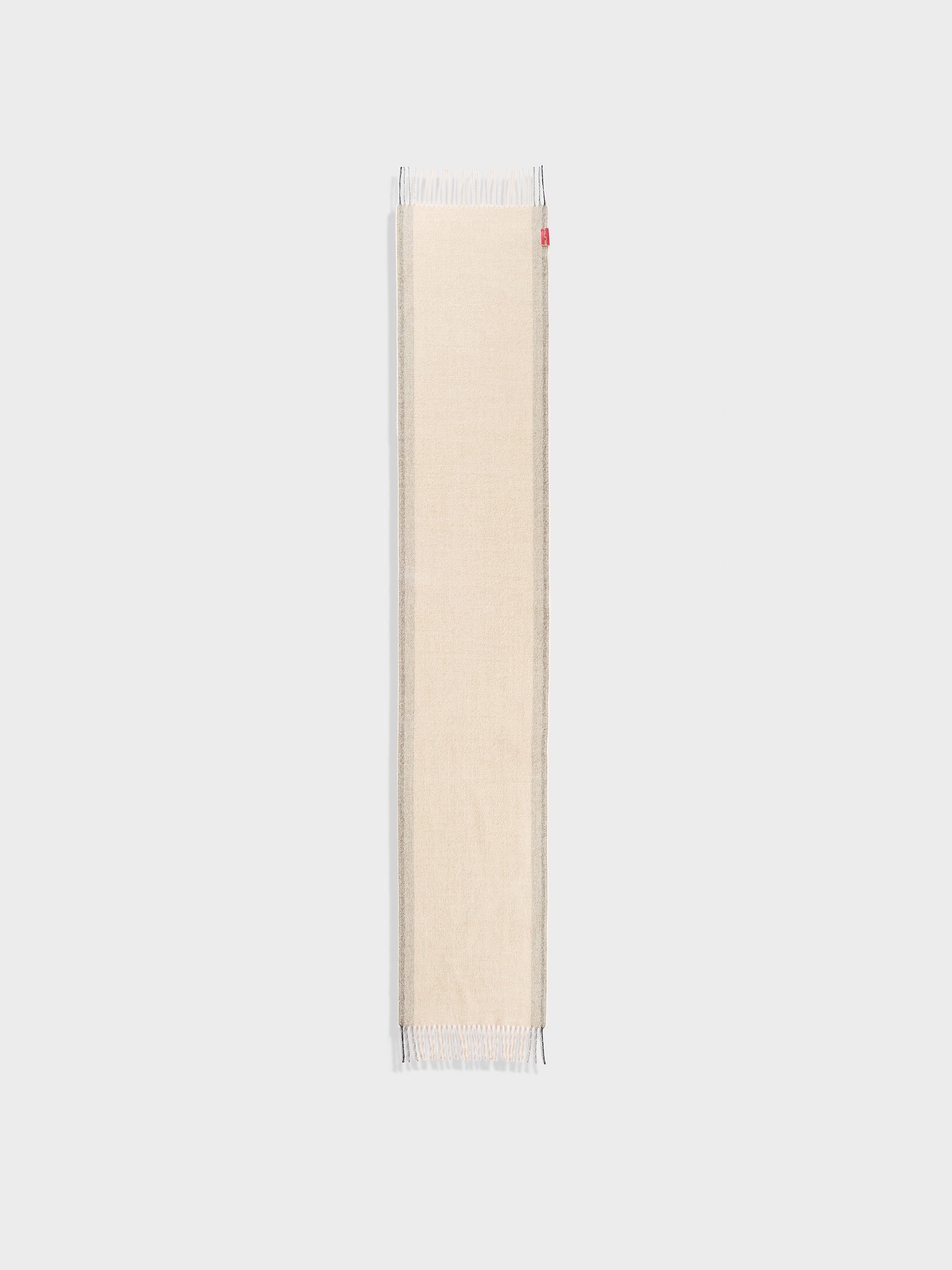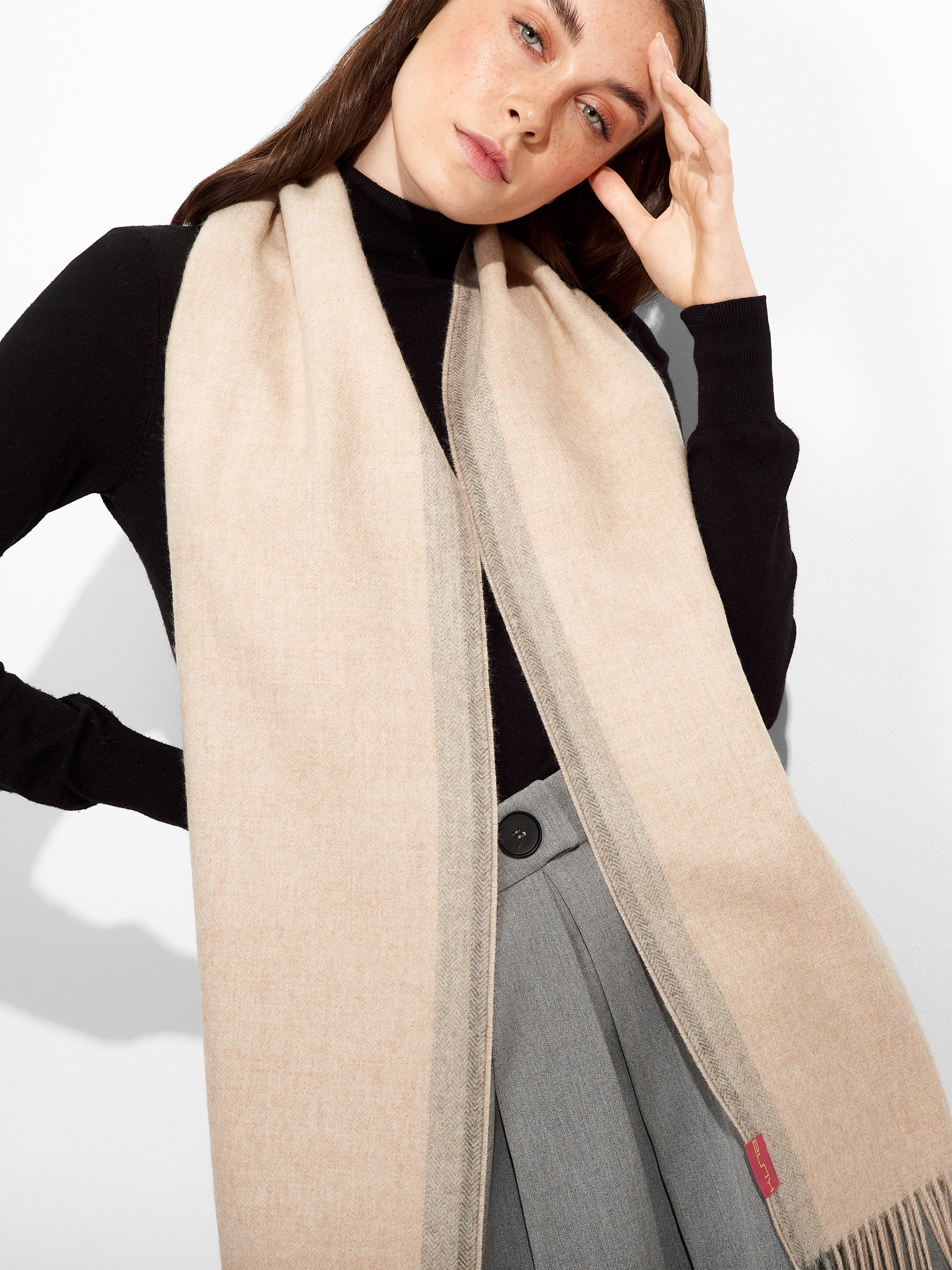Chalina Ravenna en tonalidad beige, con bordes en color contraste, presenta flecos finos que añaden un toque de dinamismo. Confeccionada en baby alpaca, brinda calidez y suavidad. | Material predominante: Baby Alpaca