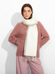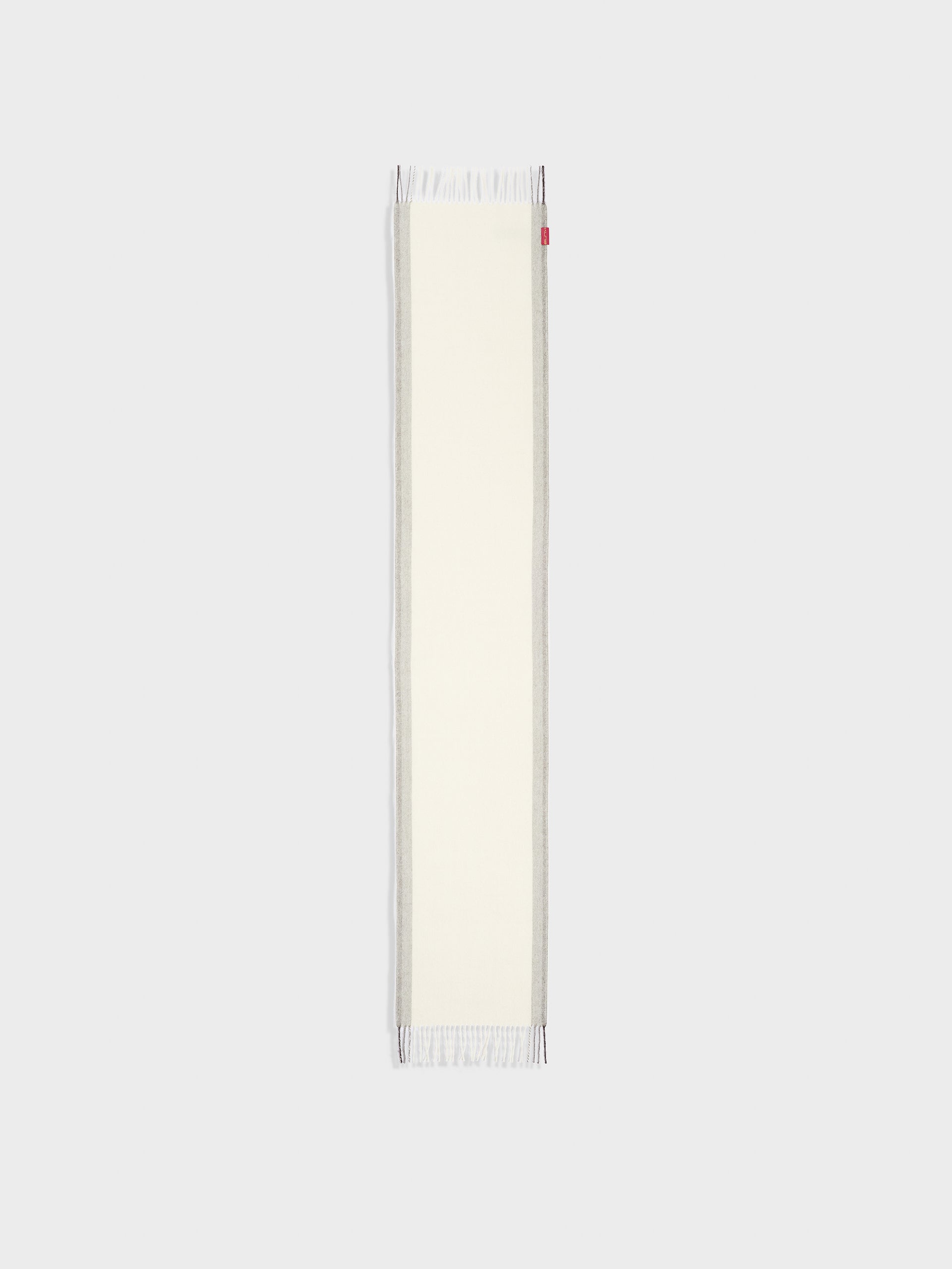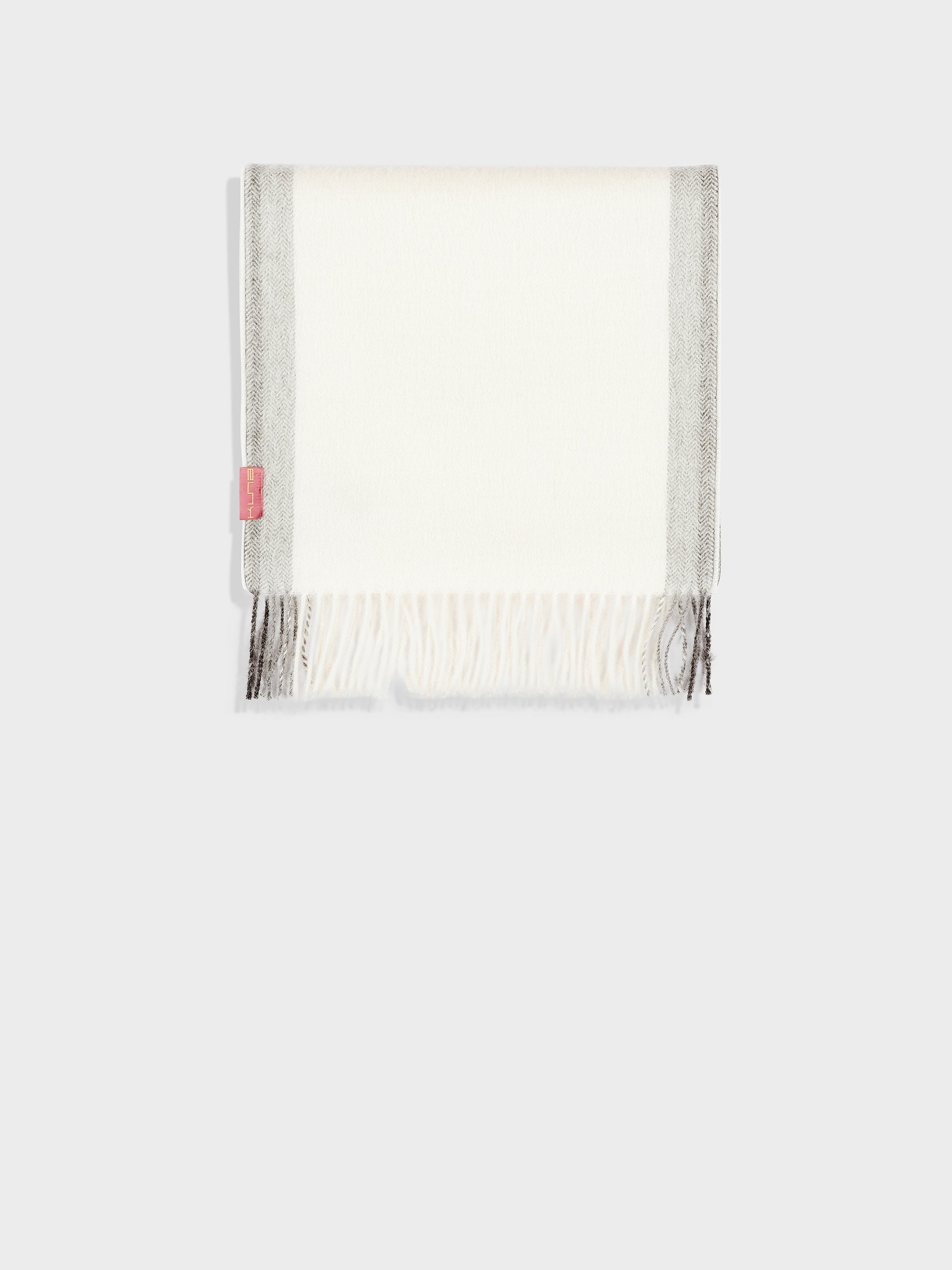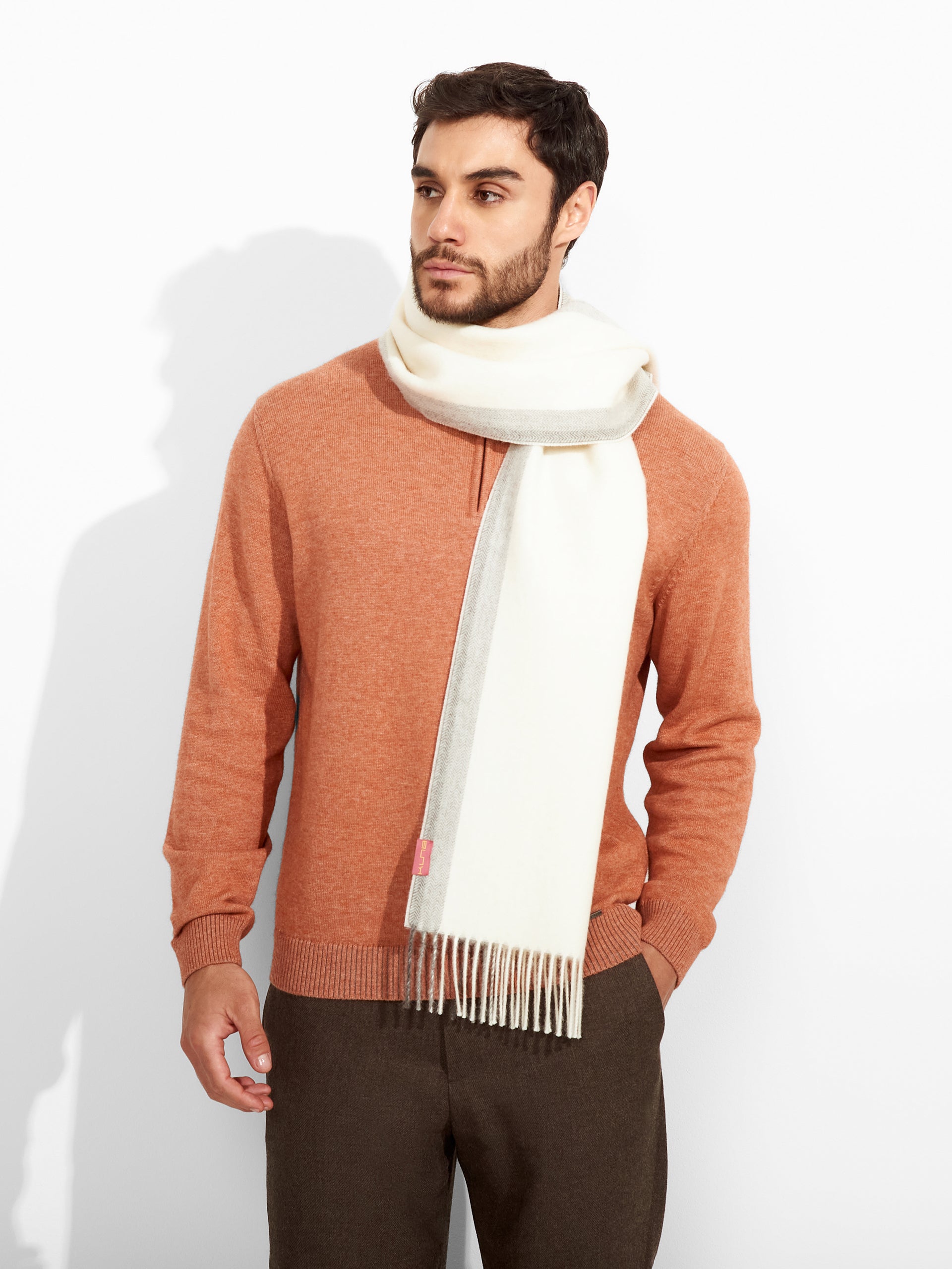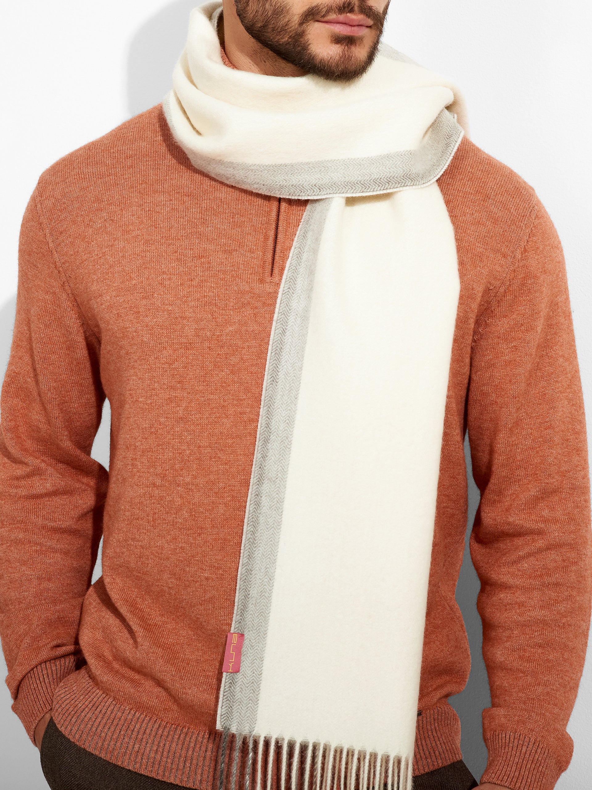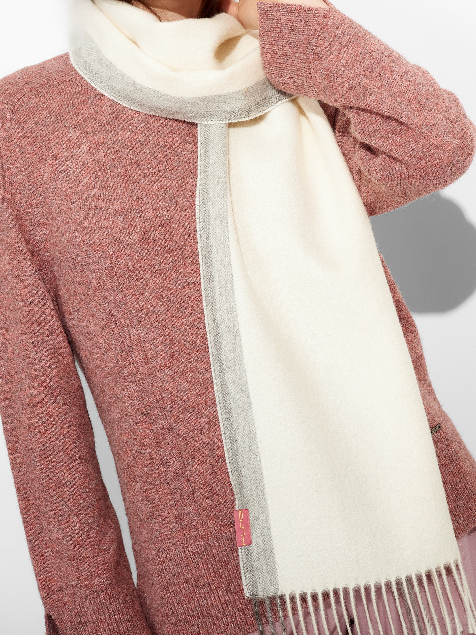 Chalina Ravenna en tonalidad ecru, con bordes en color contraste, presenta flecos finos que añaden un toque de dinamismo. Confeccionada en baby alpaca, brinda calidez y suavidad. | Material predominante: Baby Alpaca