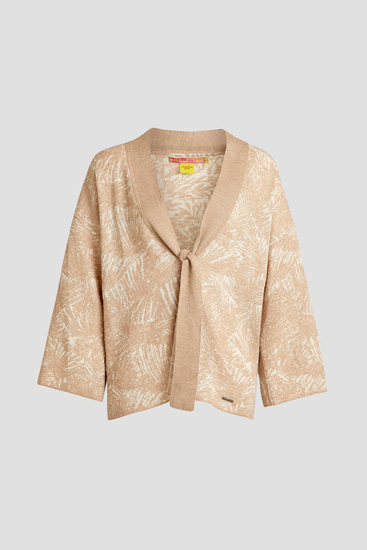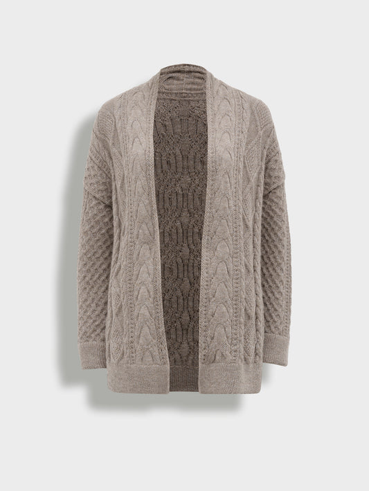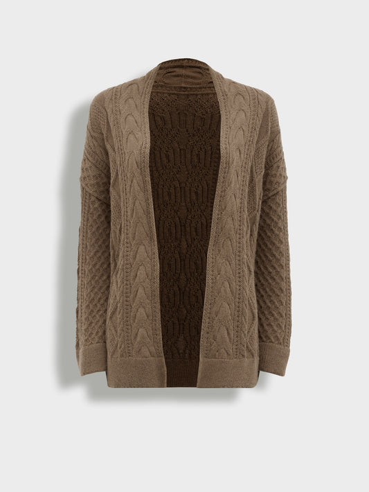 Cardigan Bertha en tonalidad camel, con cuello shawl y mix de trenzas que aportan textura...