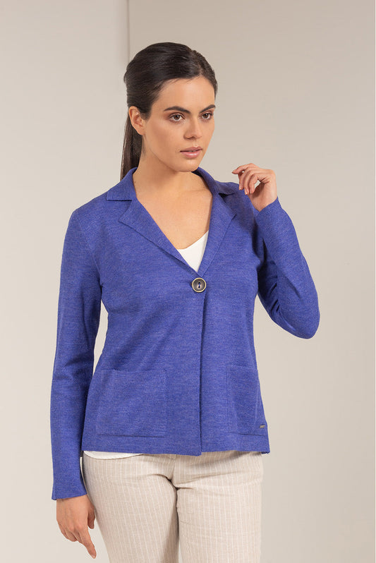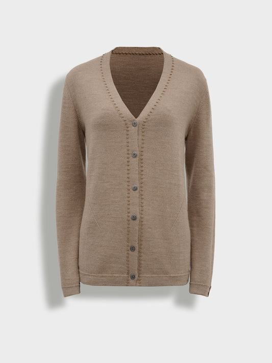 Cárdigan Brenda en tonalidad marrón, con cuello en V y sisa sastre para un calce...