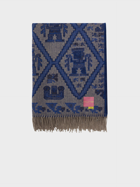 Manta Mochica 2 en tonalidad azul, elaborada en 100% baby alpaca con técnica Jacquard en...